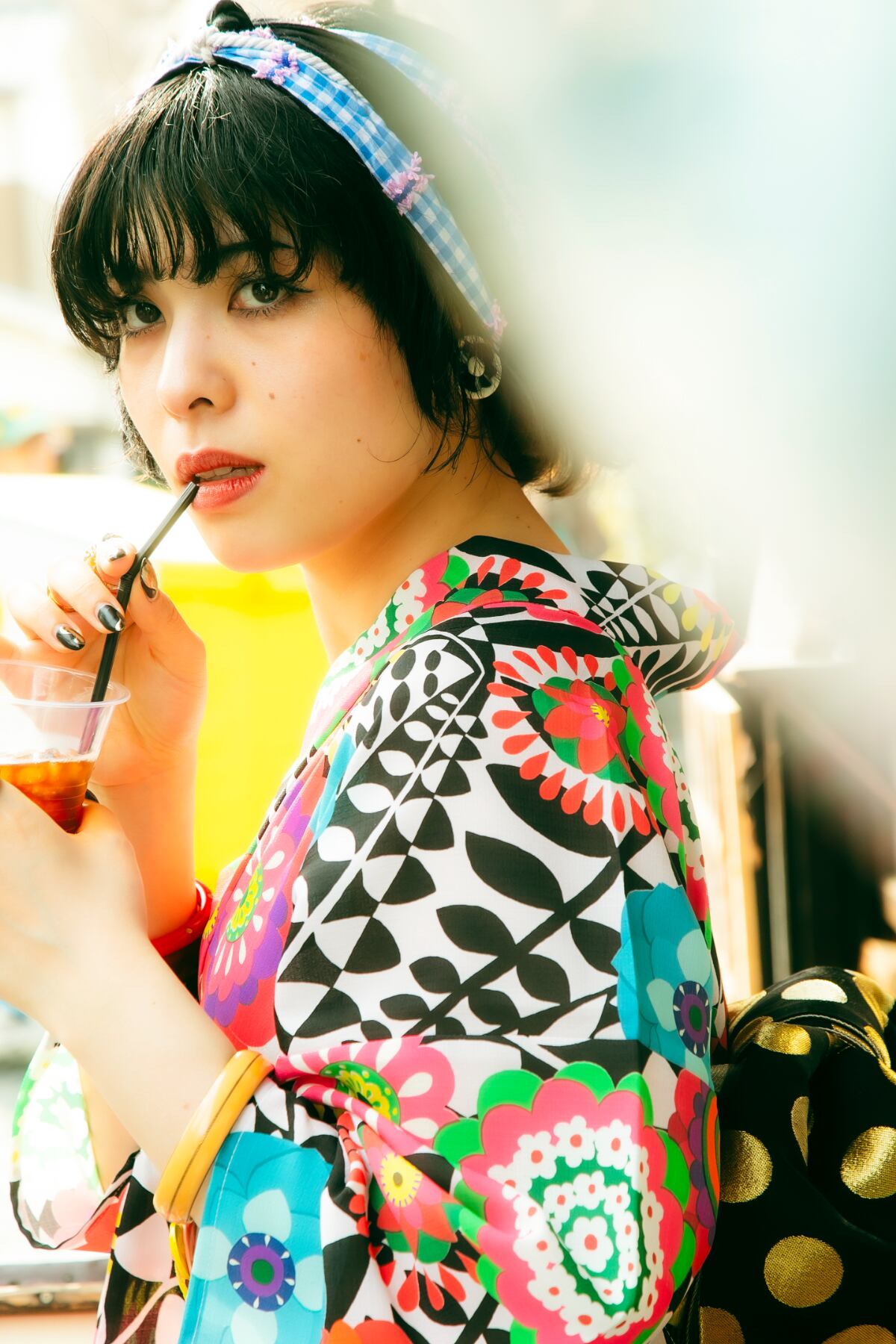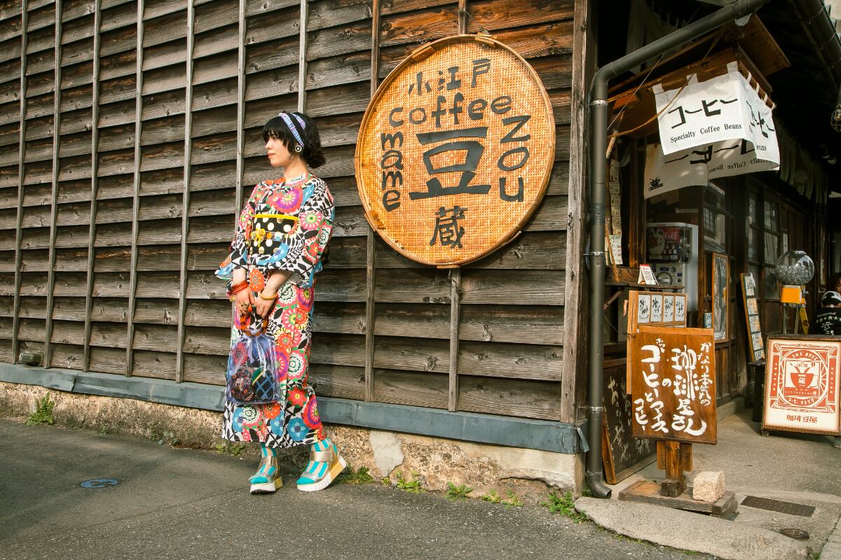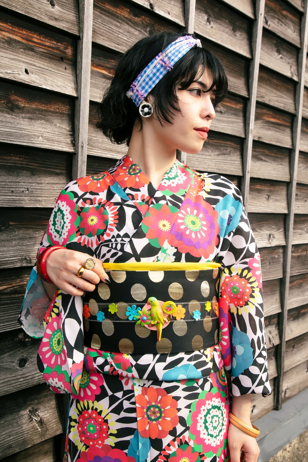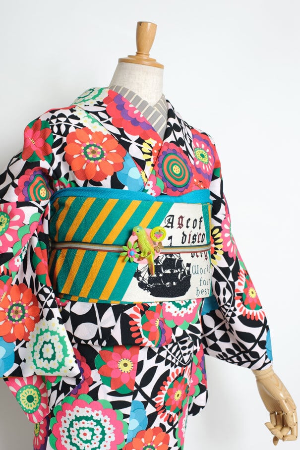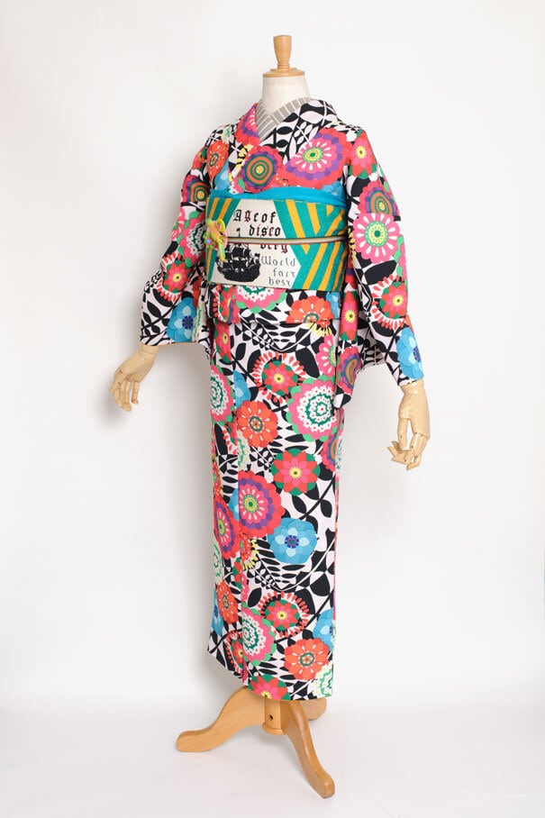 洋服の生地から仕立てたような、でも洋服地のテキスタイルをそのまま着物に仕立てるのではなく、着物のデザインとして落としこみました。