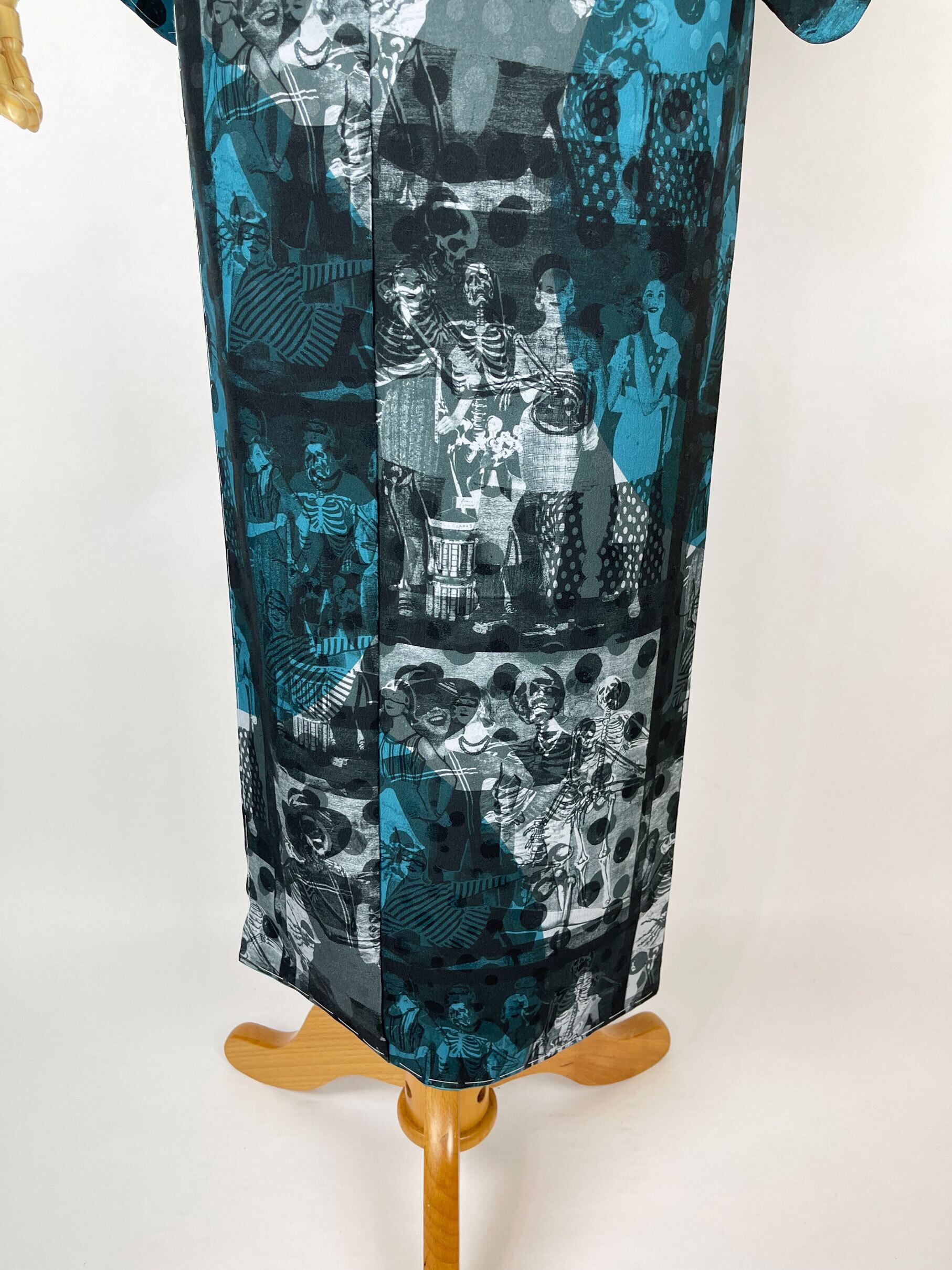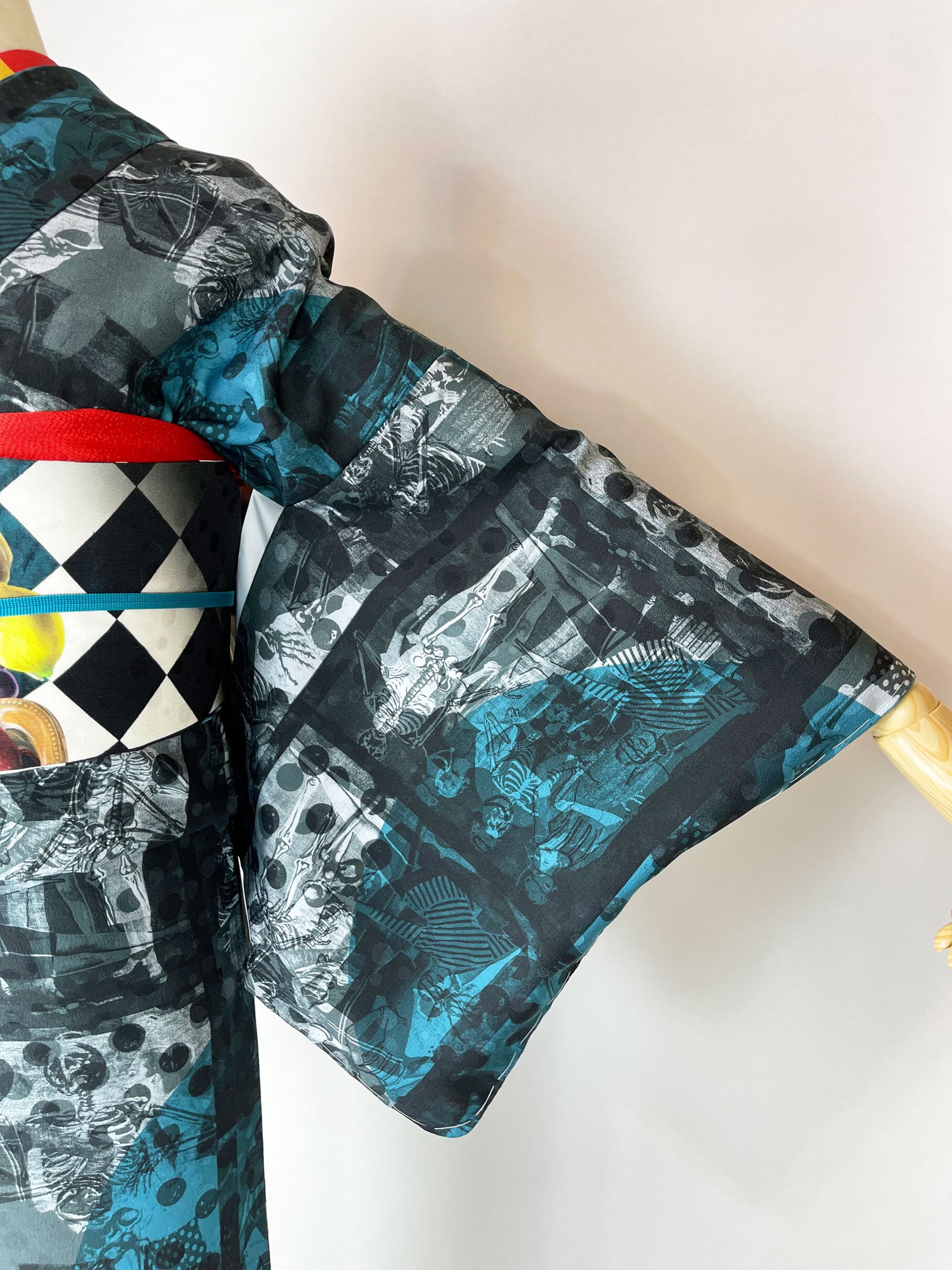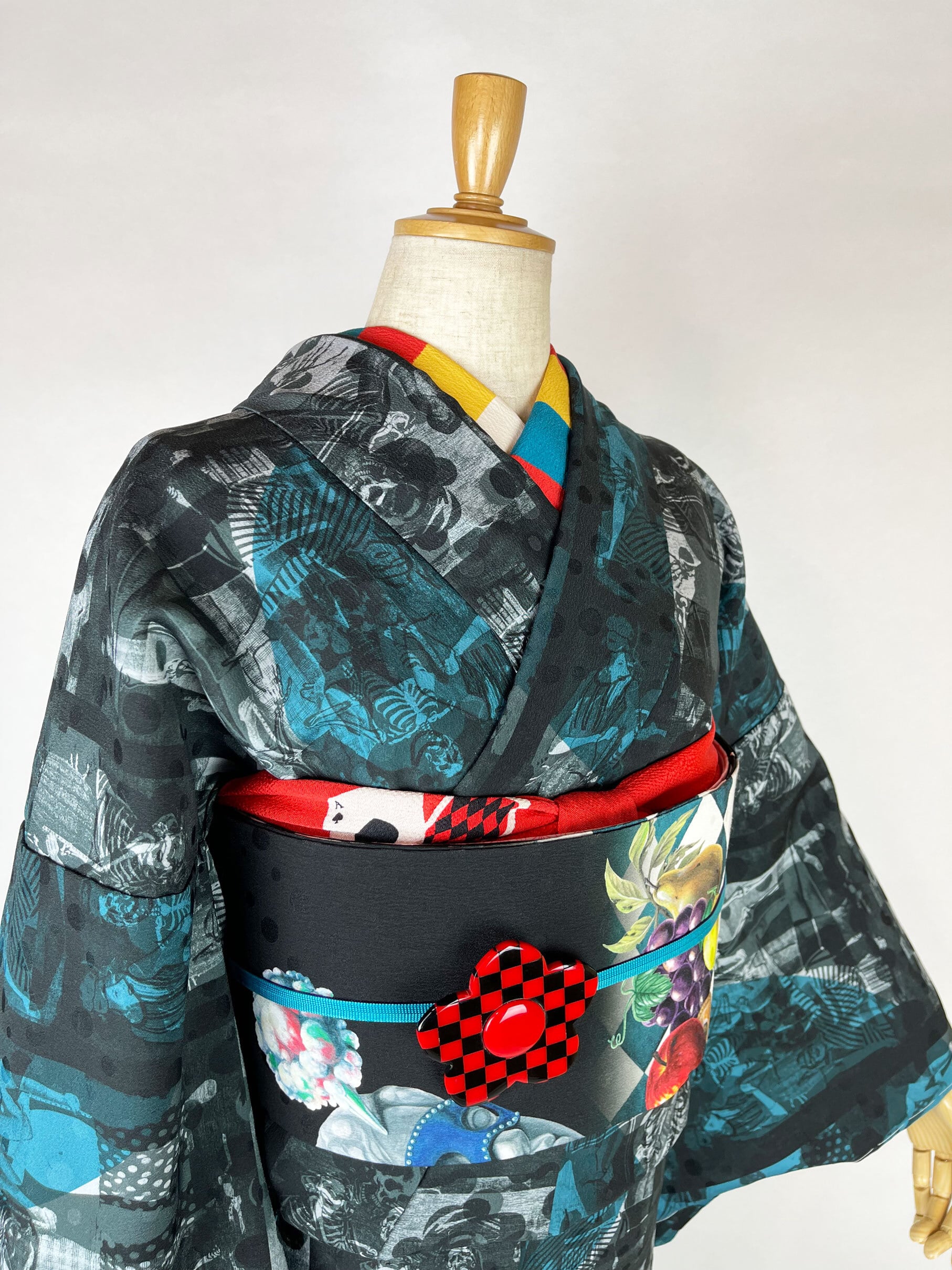 カラフルな絵画を素材に使い、一転してシックなメッセージ性のある着物に。