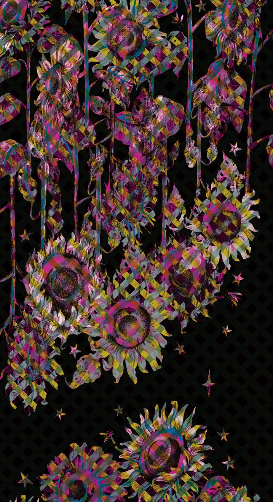 さらに、背景には昼間なのに星が光り、輪郭を失いながらチェック柄に溶け込んでいく花々──まるで“時間の流れ”そのものを映し出したような世界観を表現。