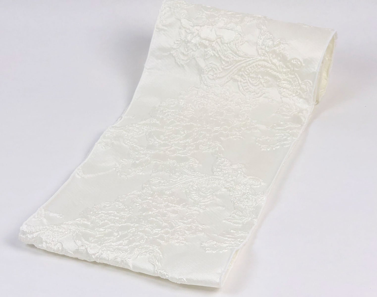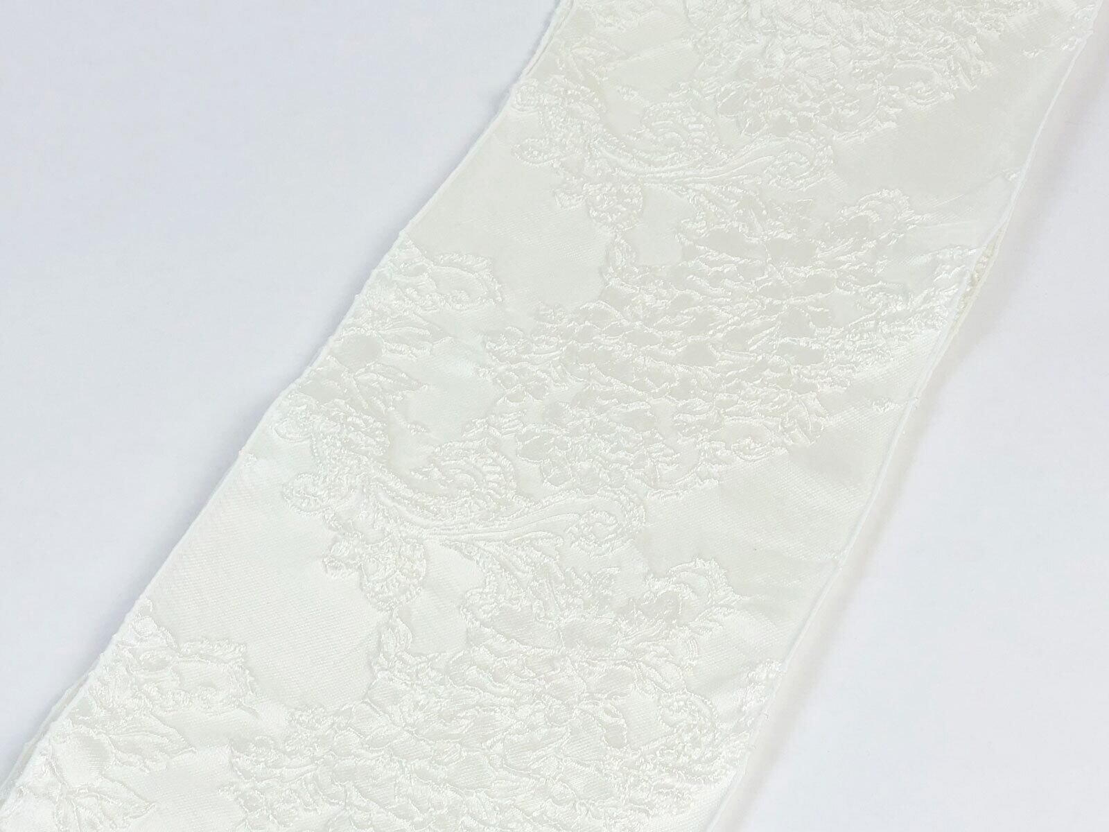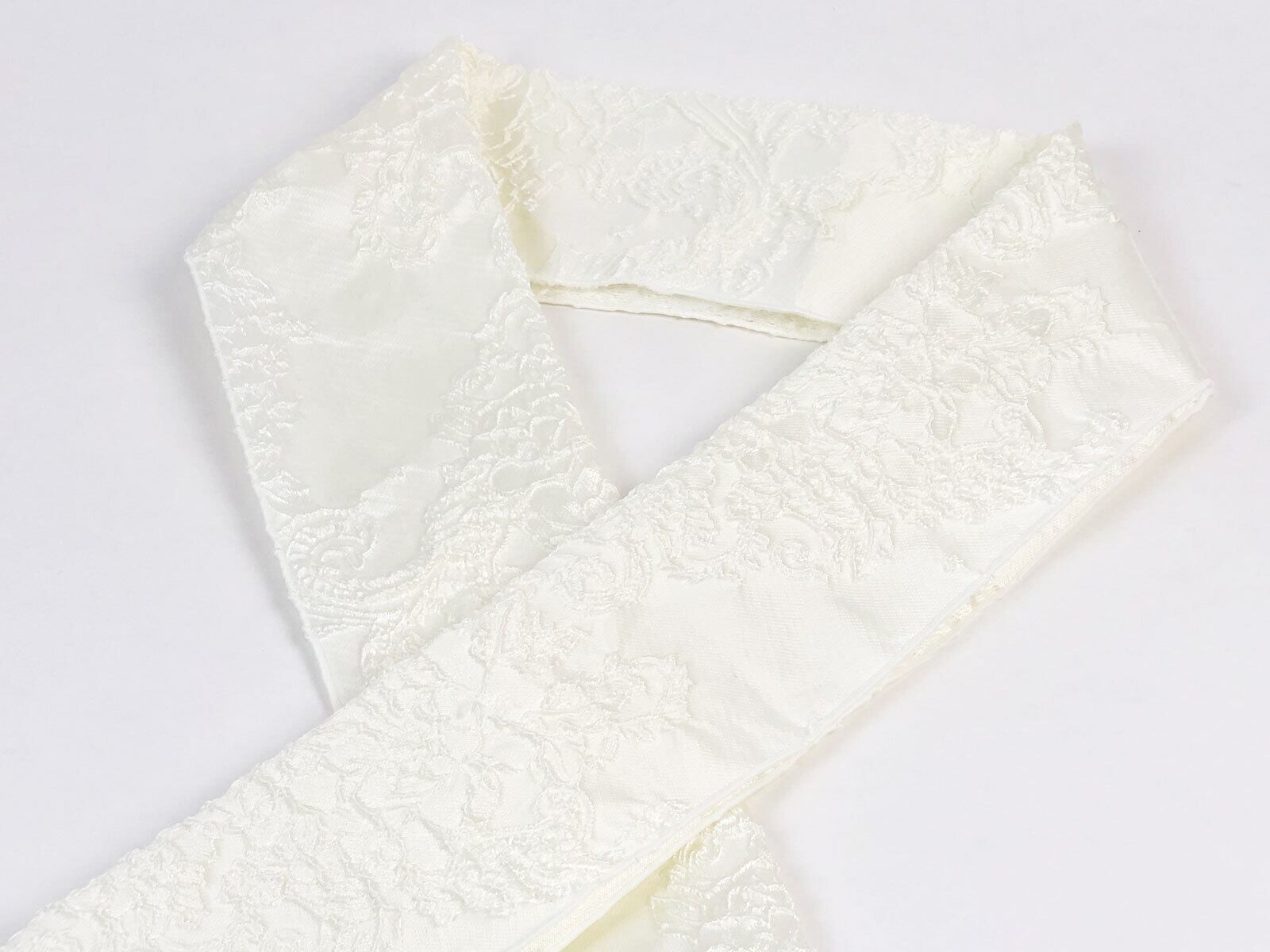立体感のあるジャガード織が美しい、上品な光沢を放つ白のポリエステル半衿です。