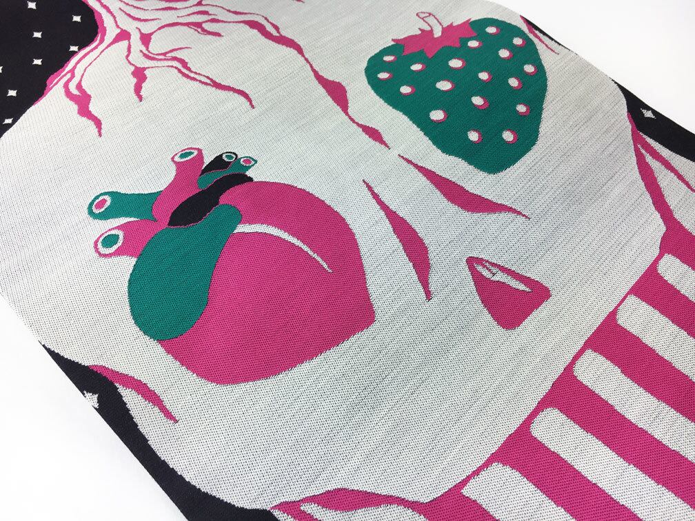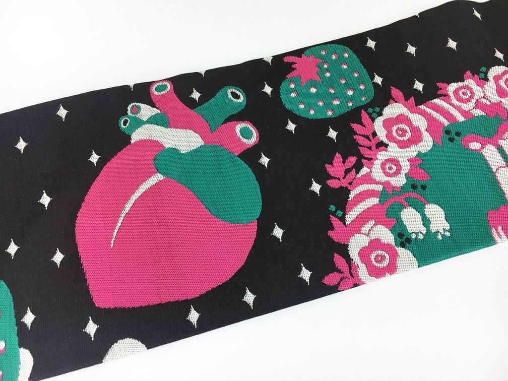 少女達の足元にはだまし絵のような心臓と苺の目のドクロが怪しい笑みを浮かべています。