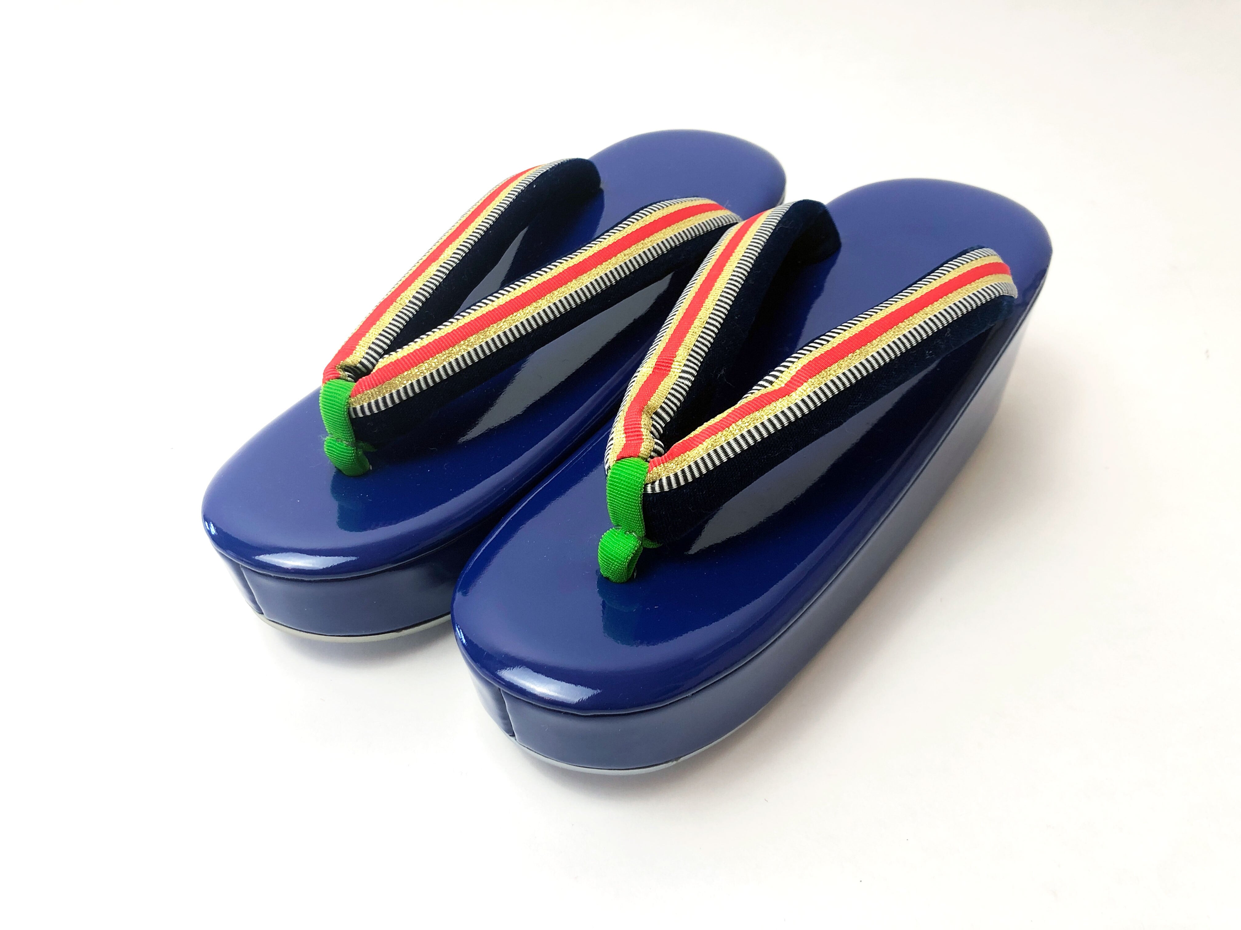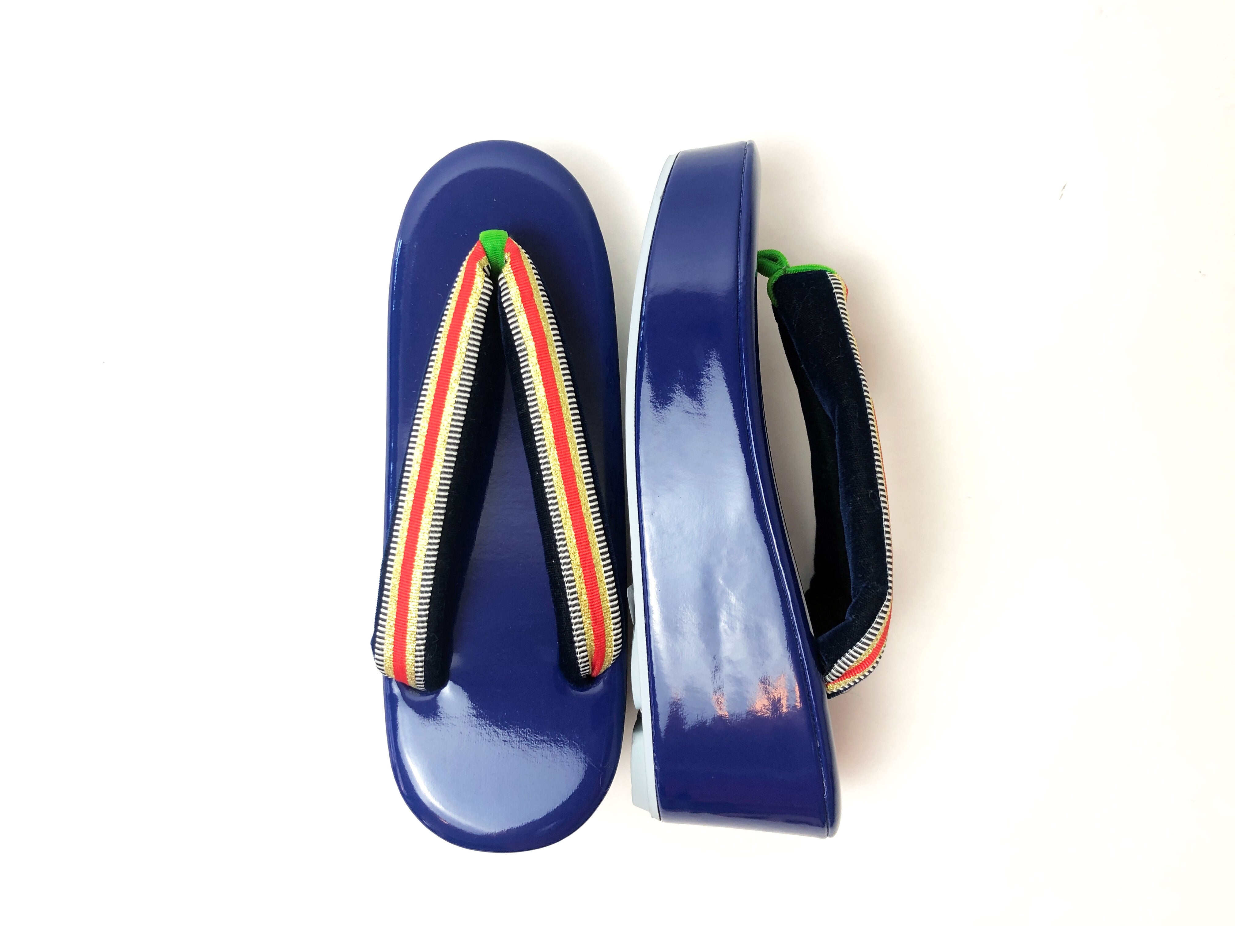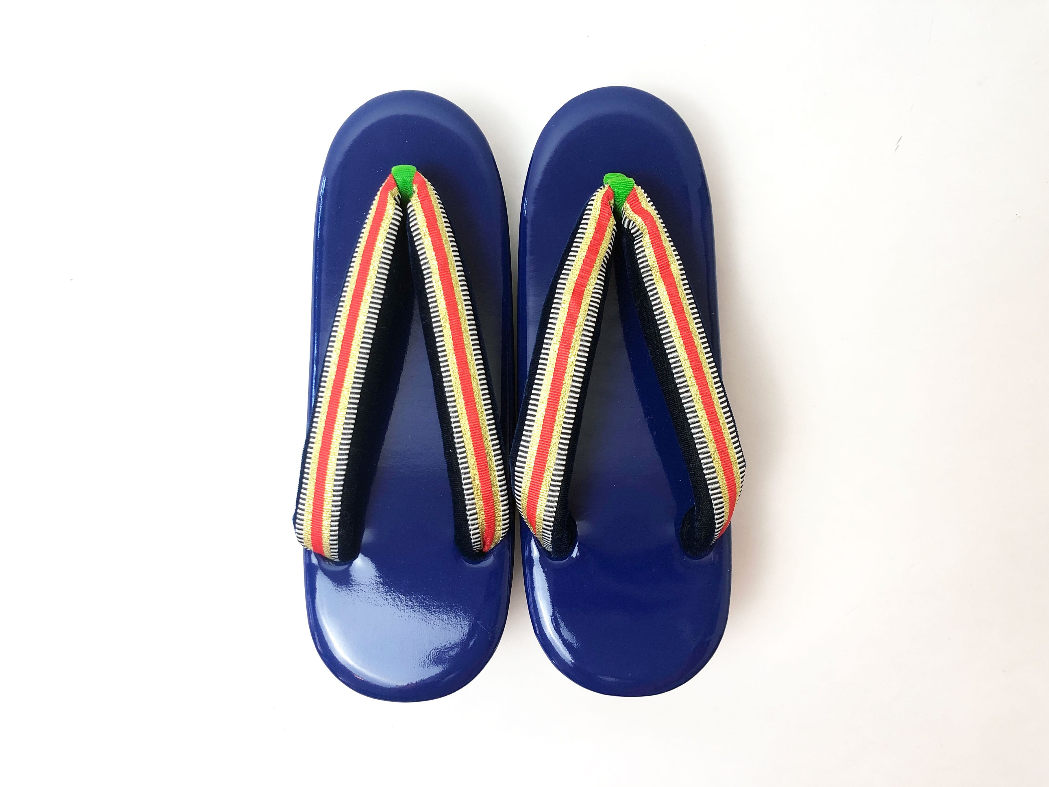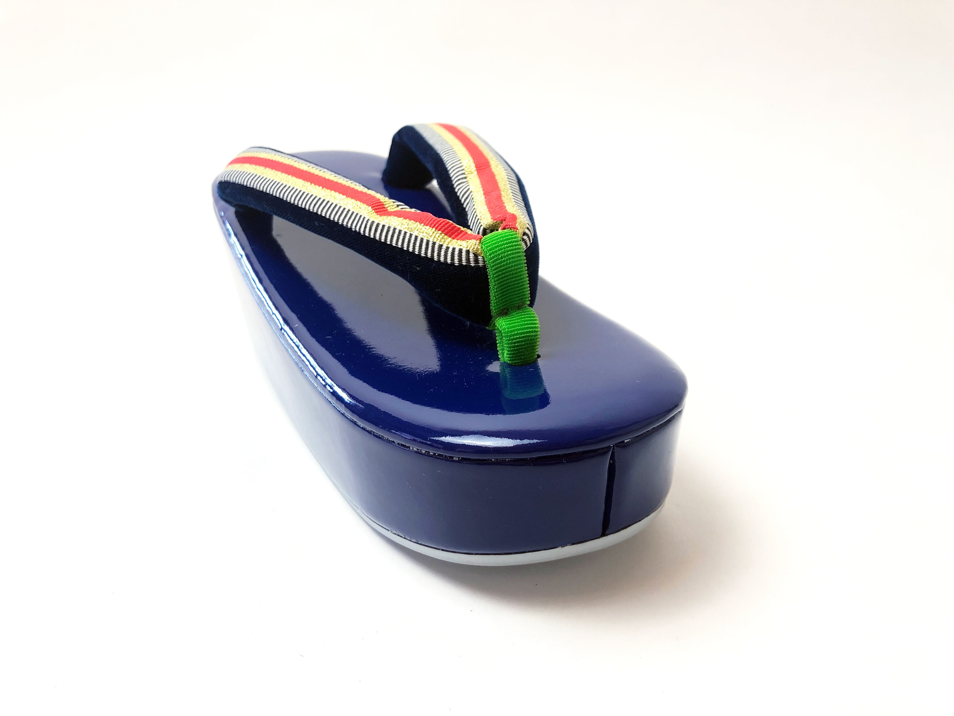 鮮やかなトリコロール配色の鼻緒に、深みのあるネイビーのエナメル台を合わせた草履です。