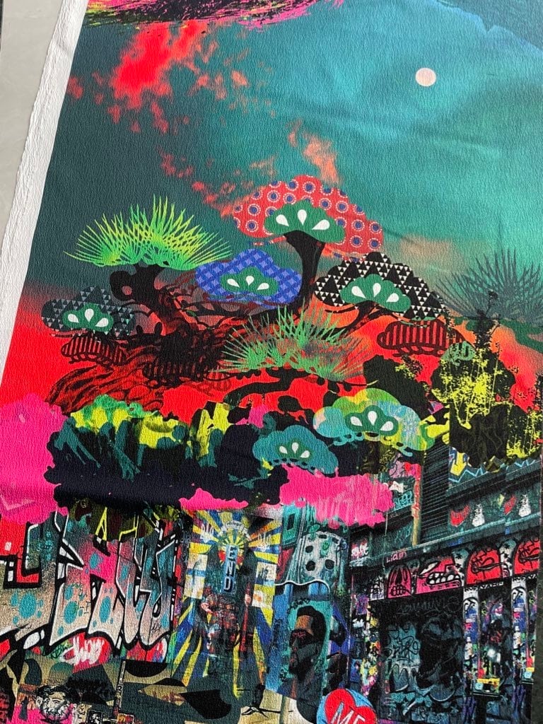 グローバリズムによって文化や国境の境界は曖昧になりつつありますが、実際の地理的距離や気候、身体感覚の差は確かに存在しています。本作では、その“埋まらない距離”と“混ざり合うことのできる近さ”が同時にある状態を、都市風景と日本的イメージの重なりによって表現しました。