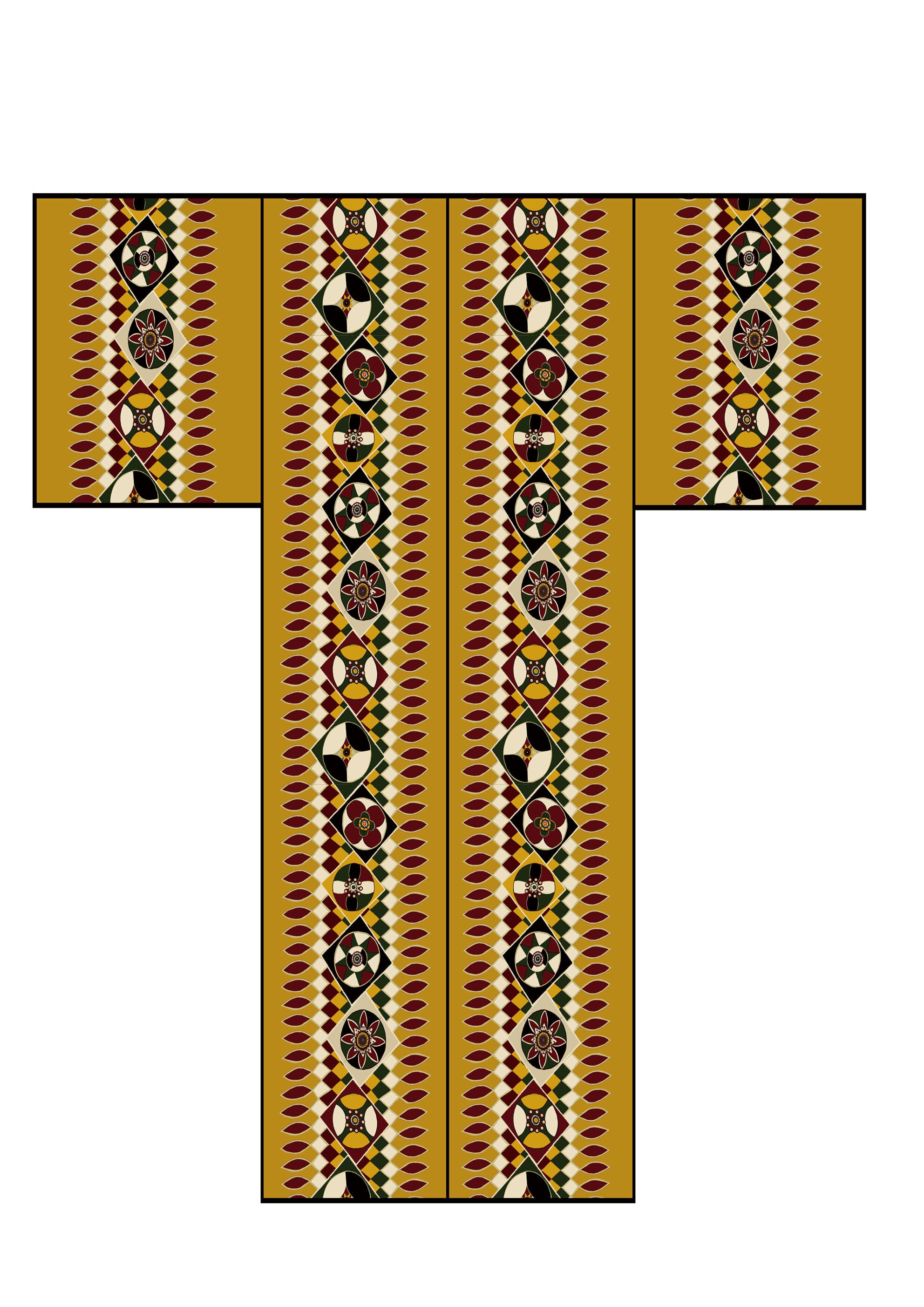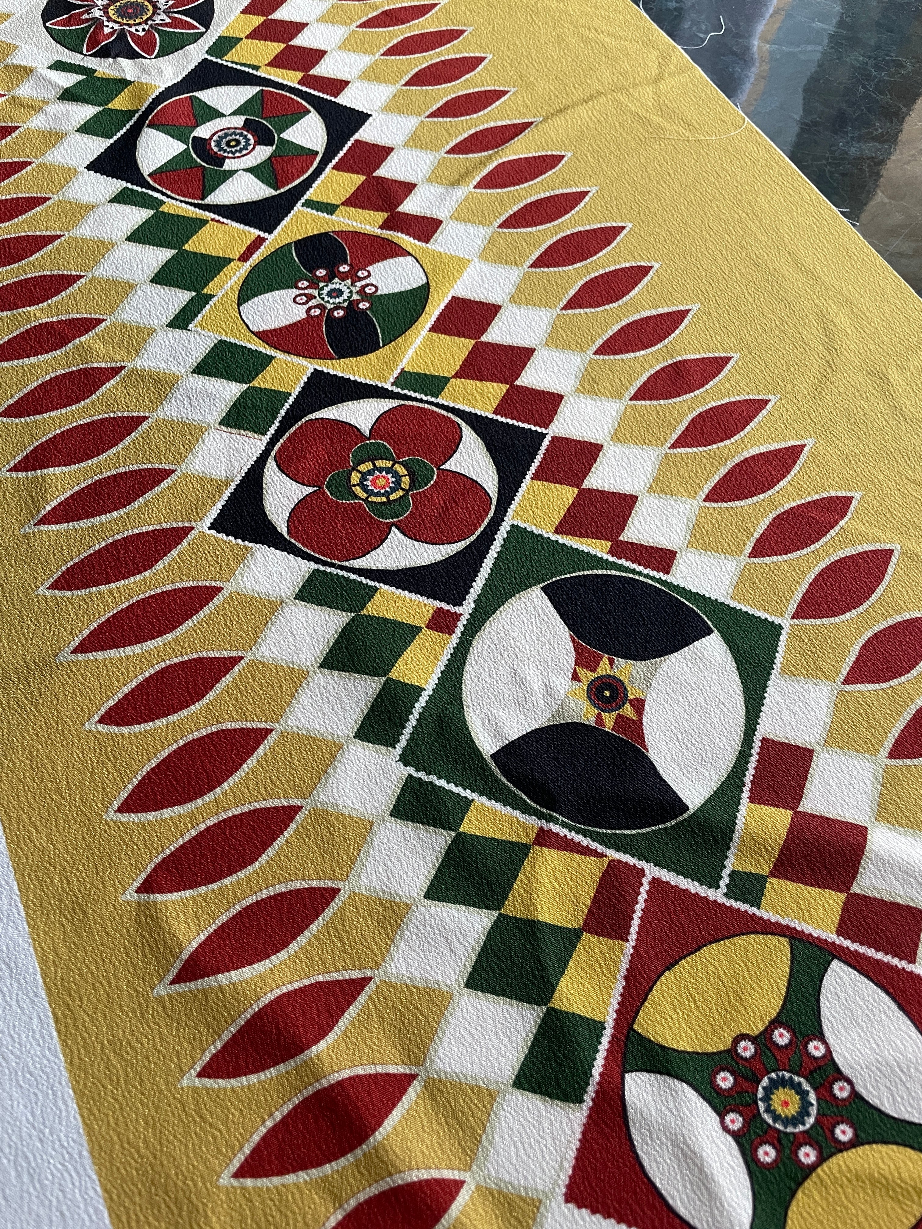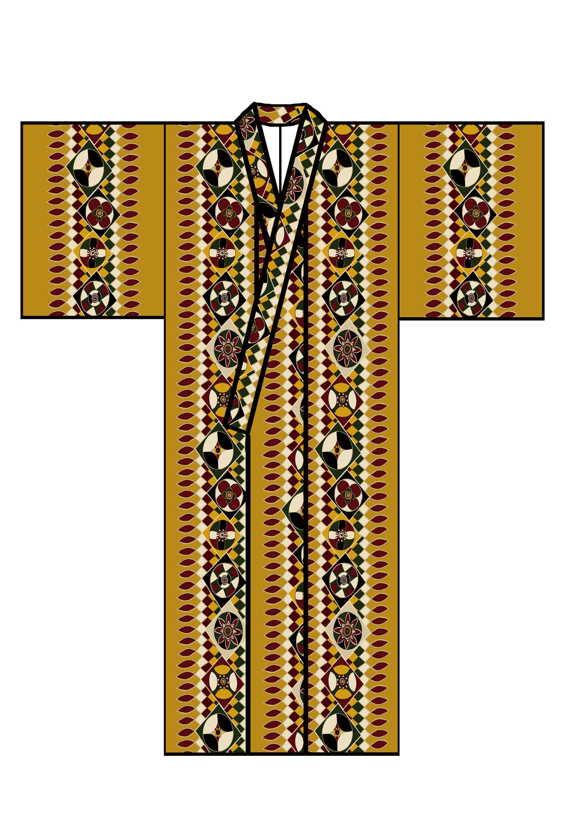 図案の一部を引用し、構造をほどきながら再構成することで、着物というかたちへと移し替えています。