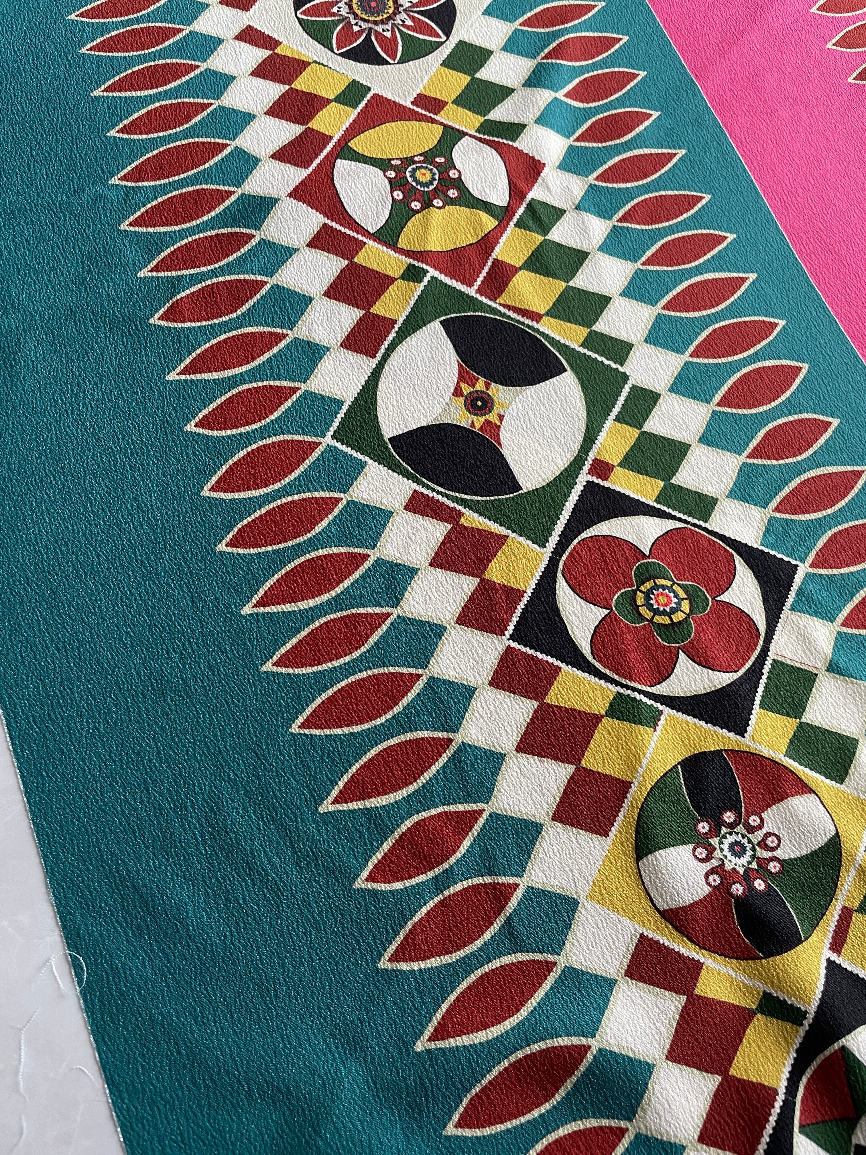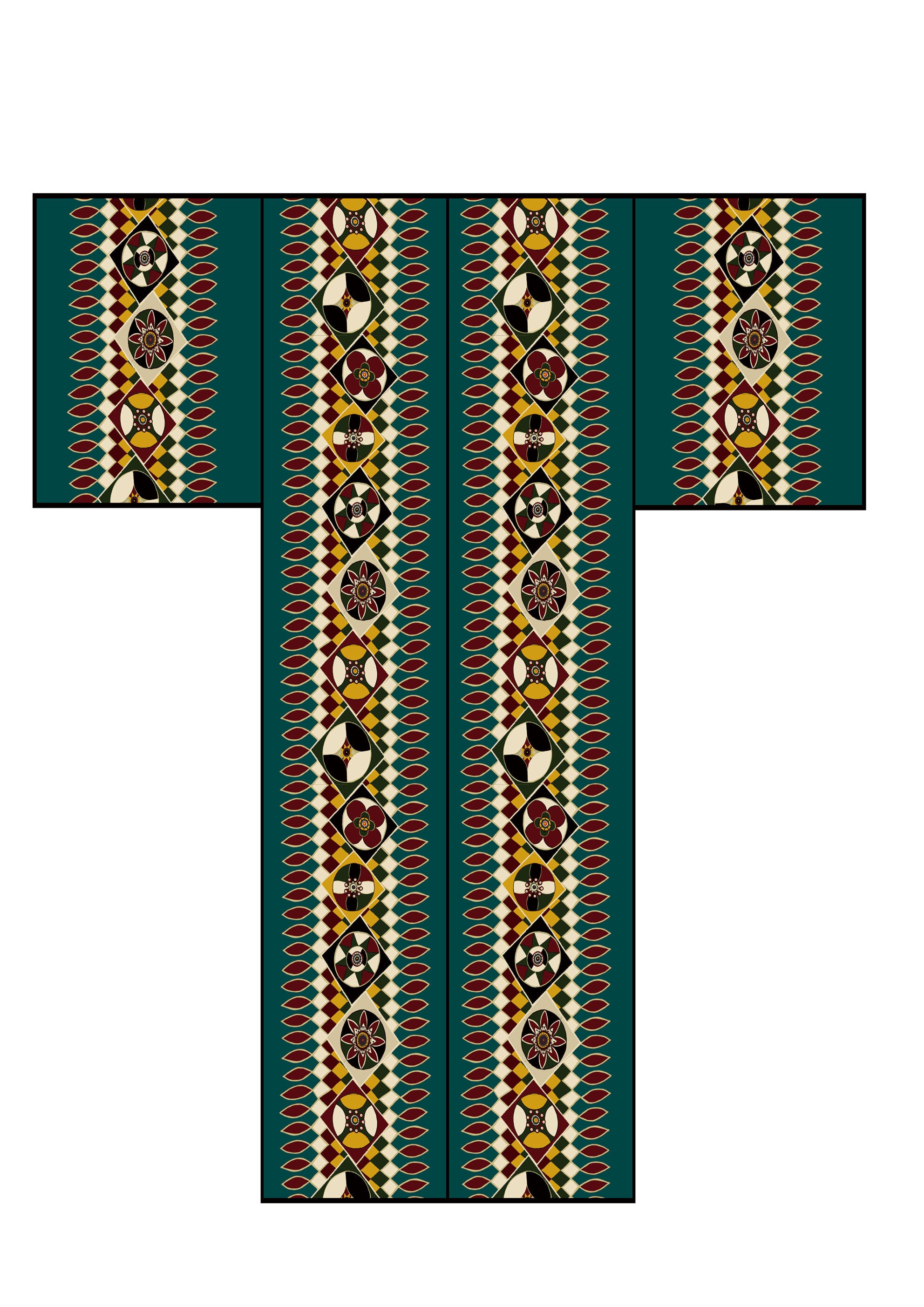 図案の一部を引用し、構造をほどきながら再構成することで、着物というかたちへと移し替えています。