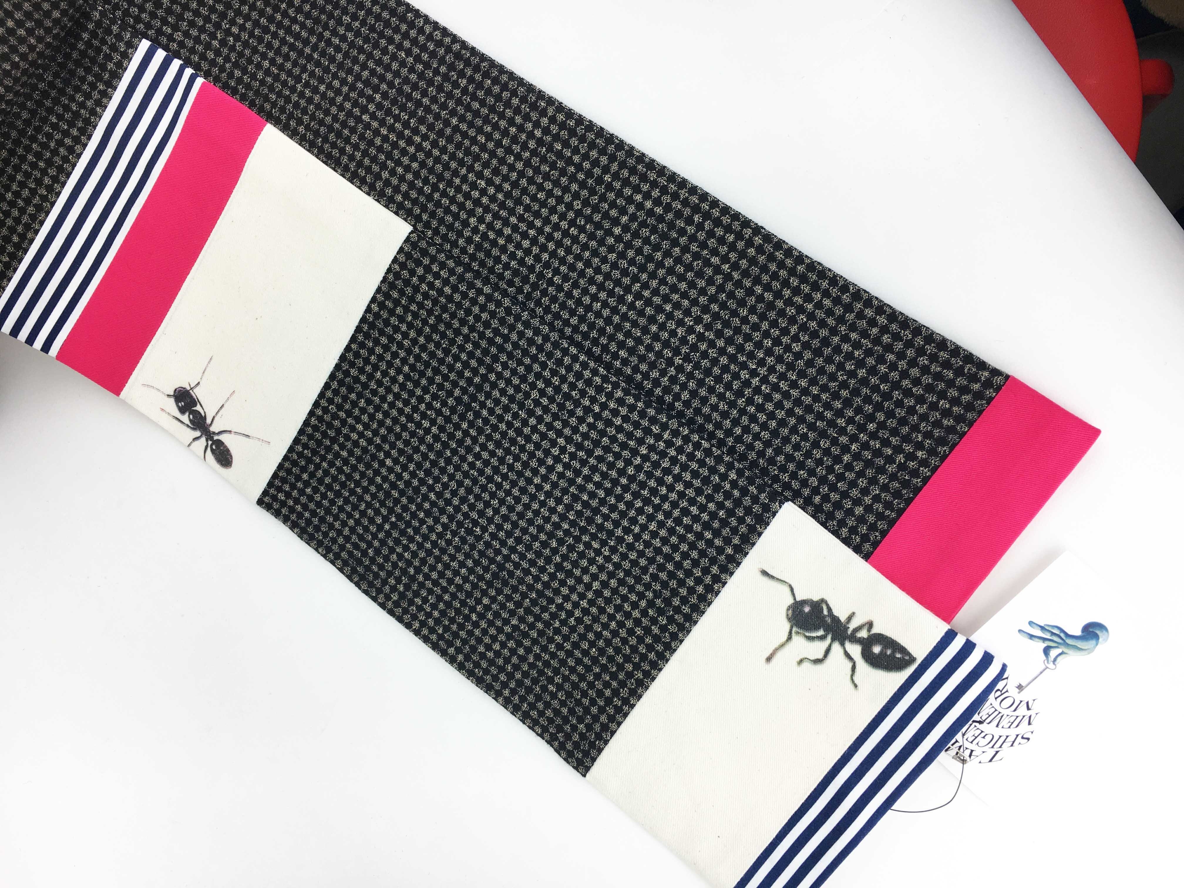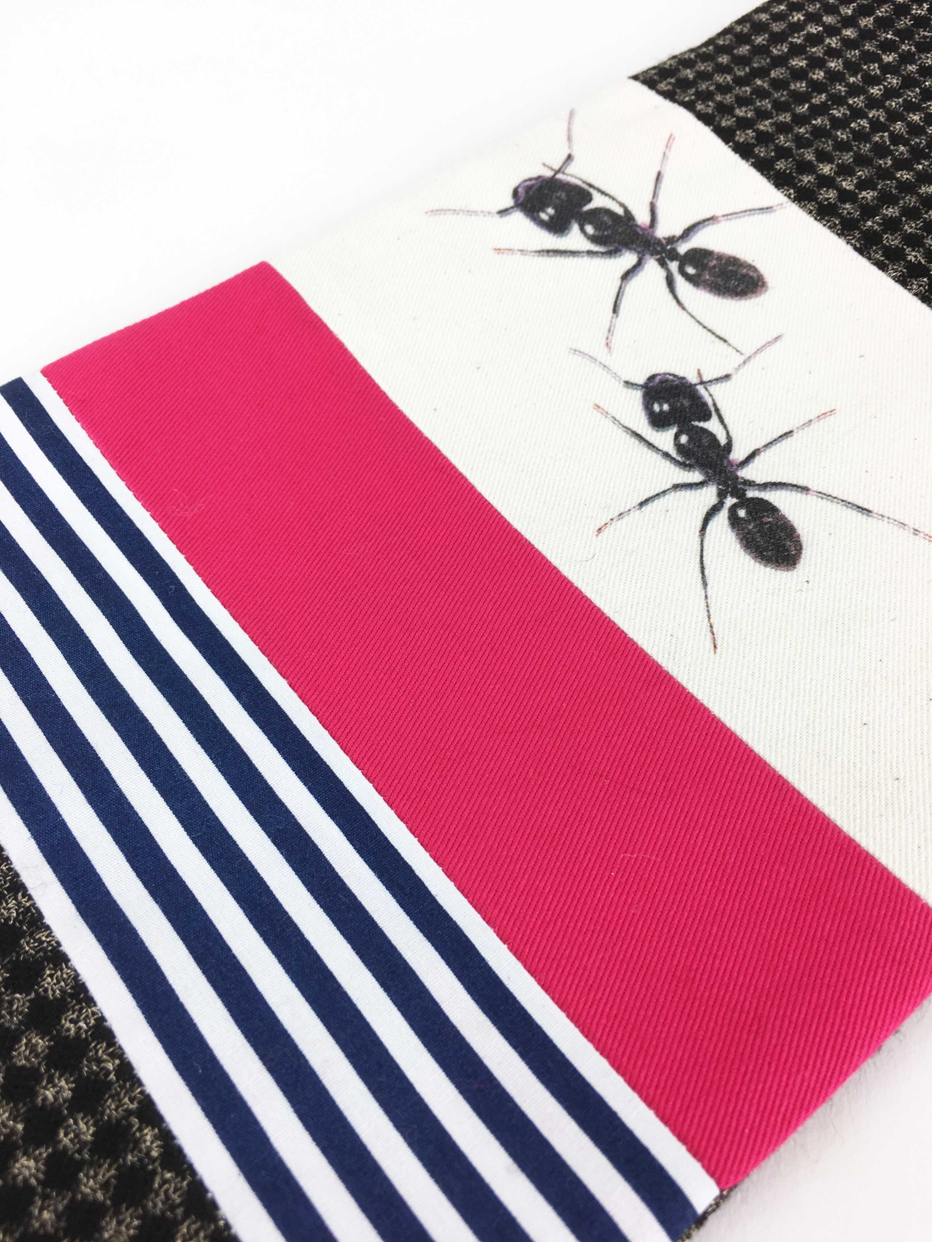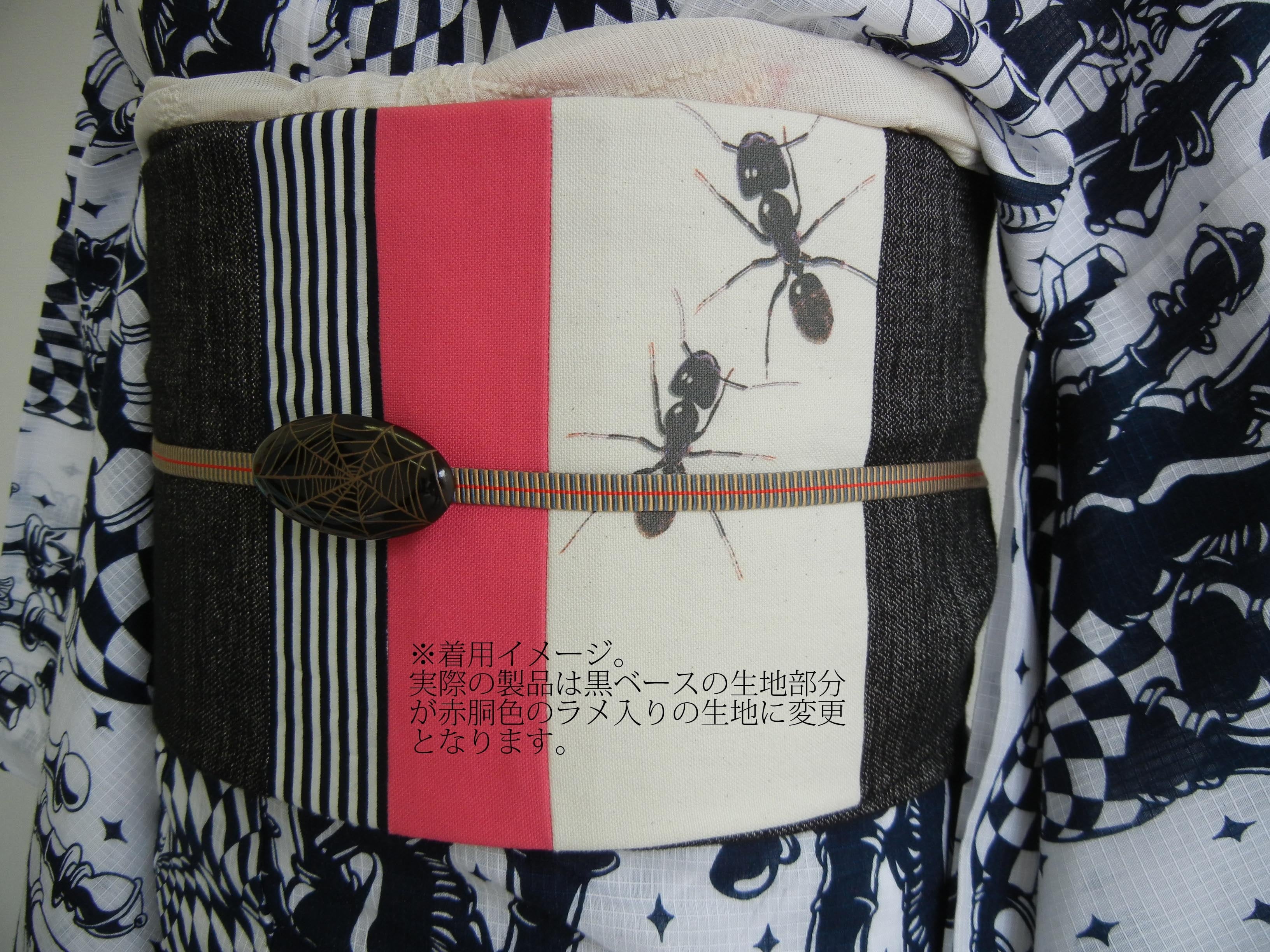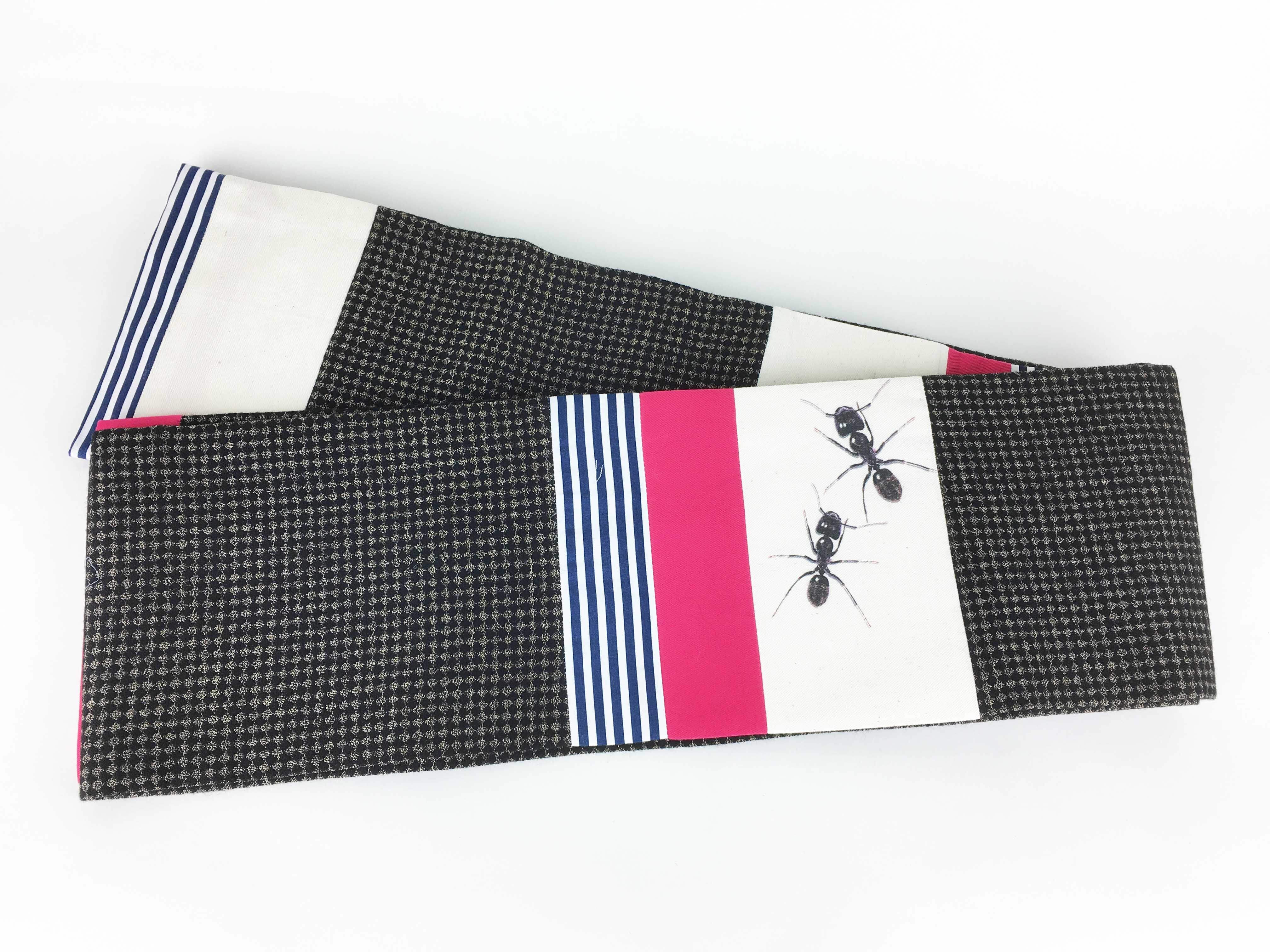 インクジェットプリントした生地をパッチワークで継いだ半幅帯です。リアルな蟻のプリントにストライプとピンクを効かせたモダンな帯です。