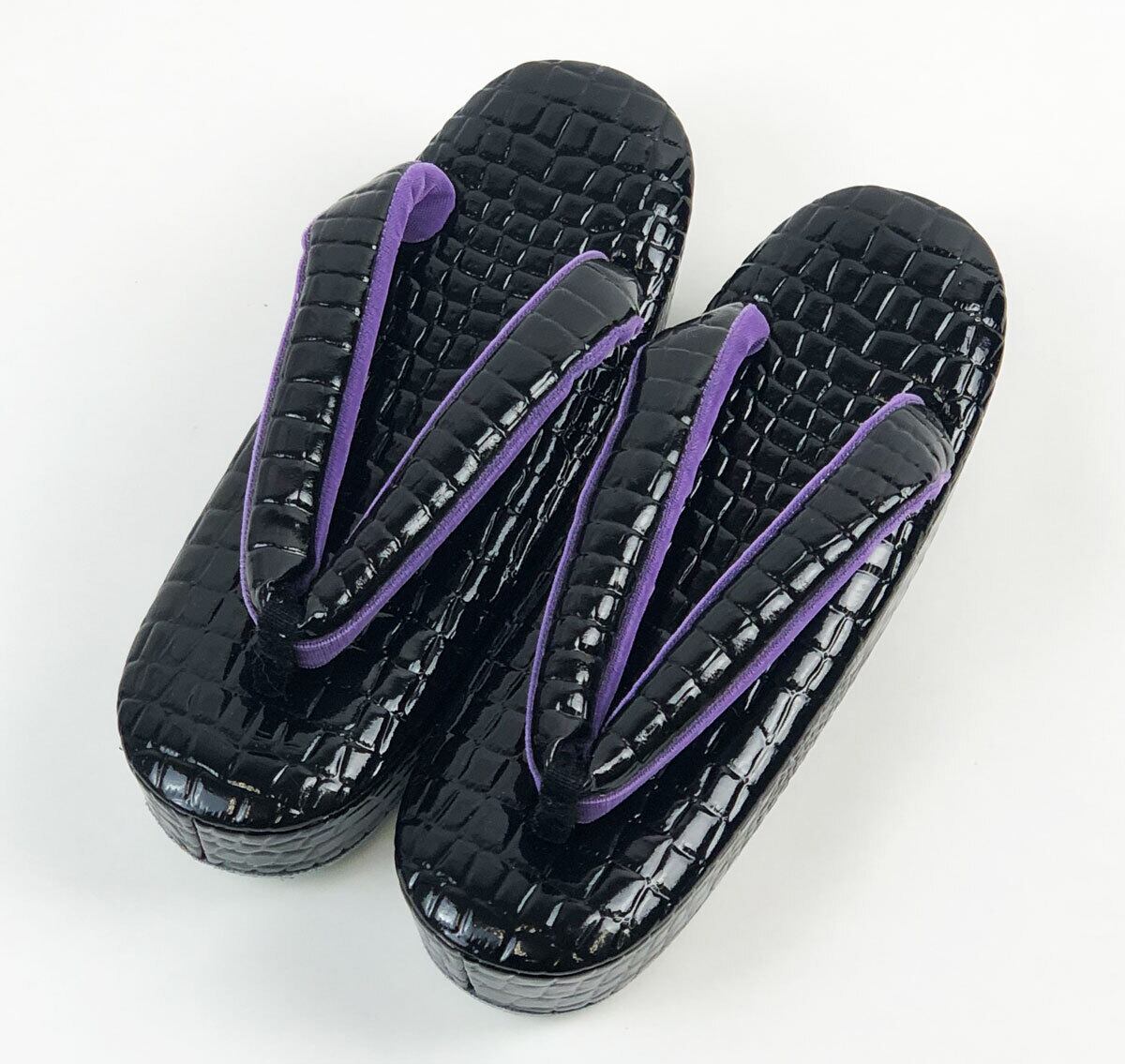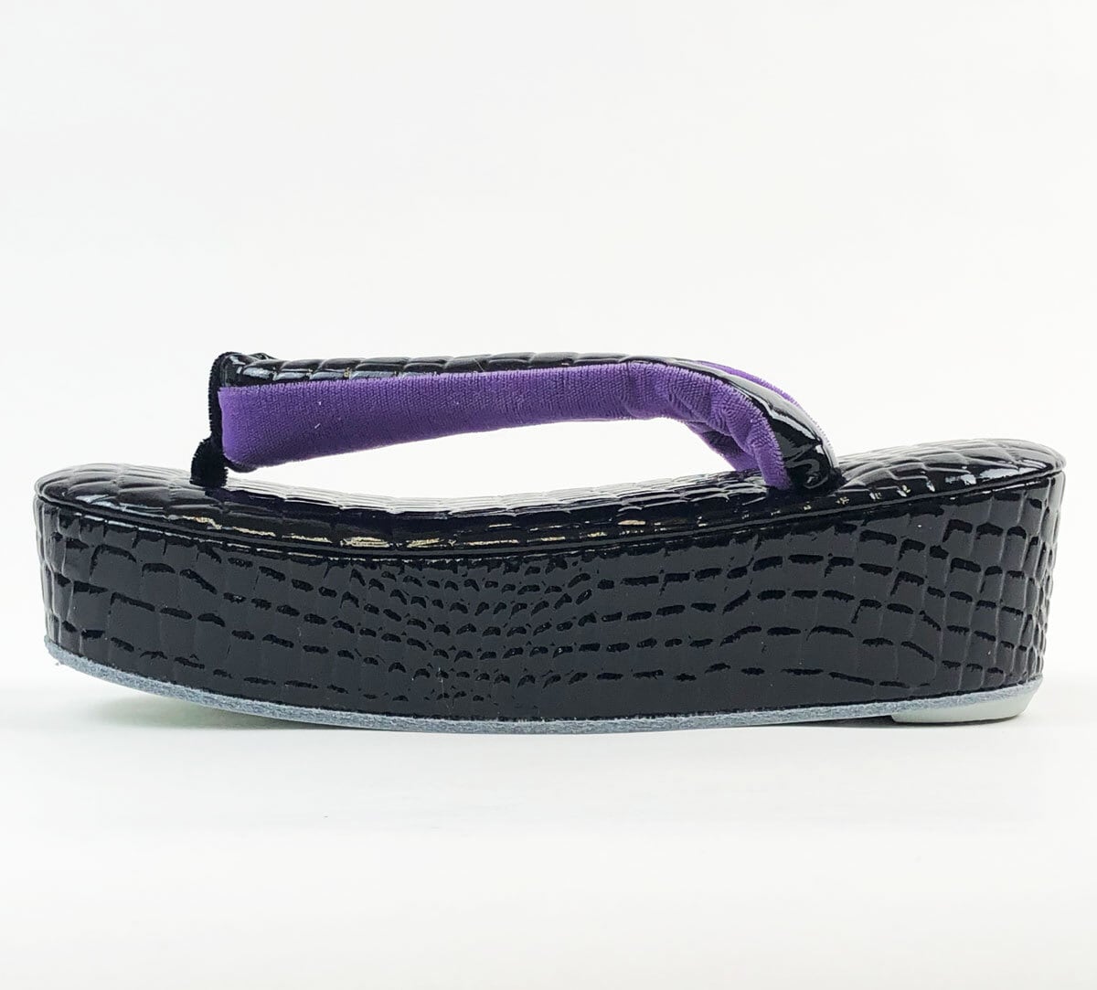 鼻緒の両側に受けがのぞく仕立てのため、履いた時に受けの紫がアクセントになります。