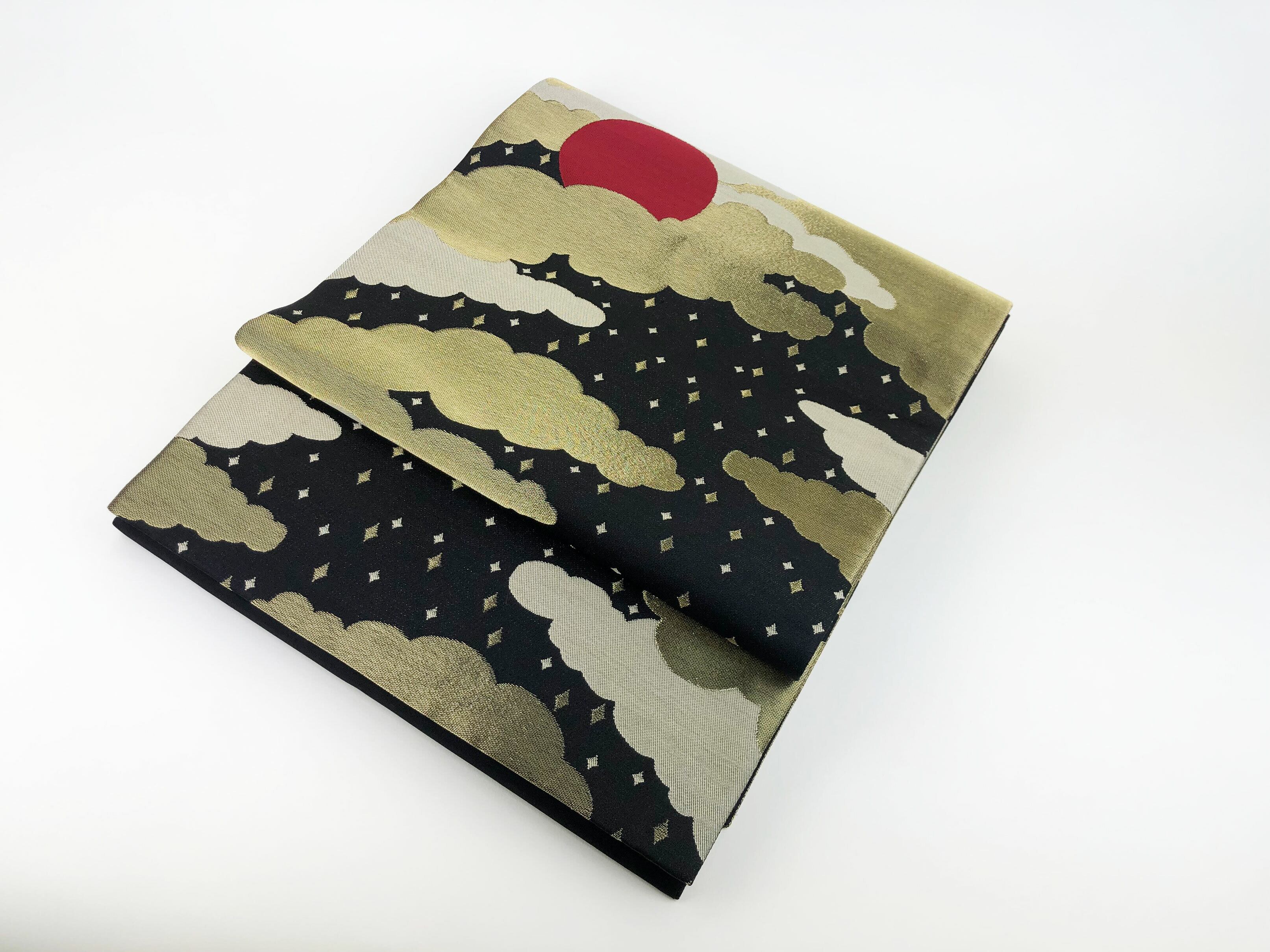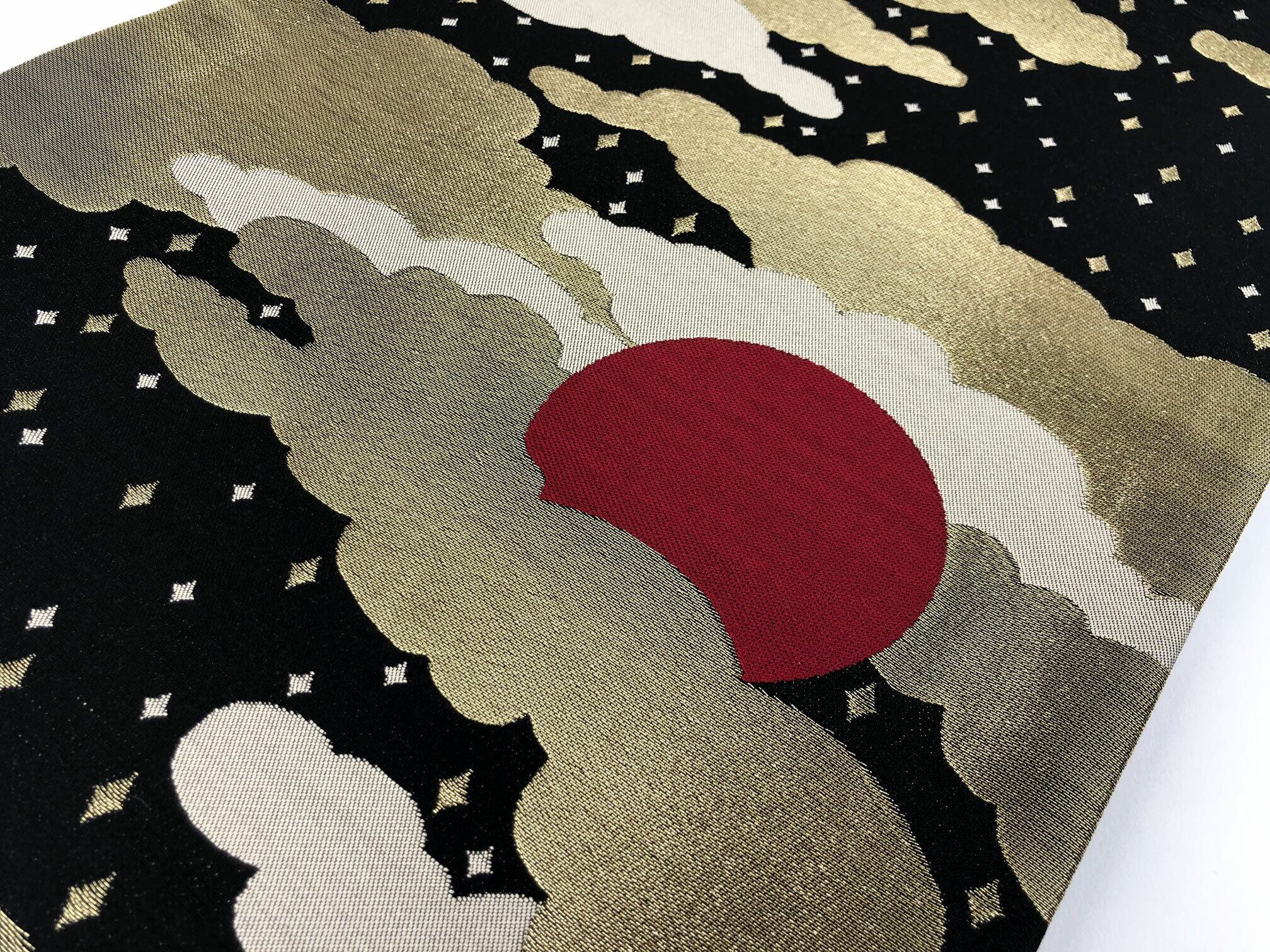 黒地に金糸の雲と赤い月のくっきりしたコントラストが映える袋帯。