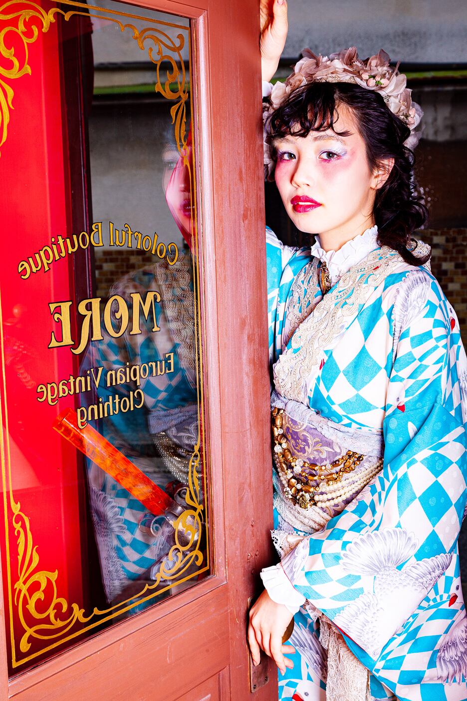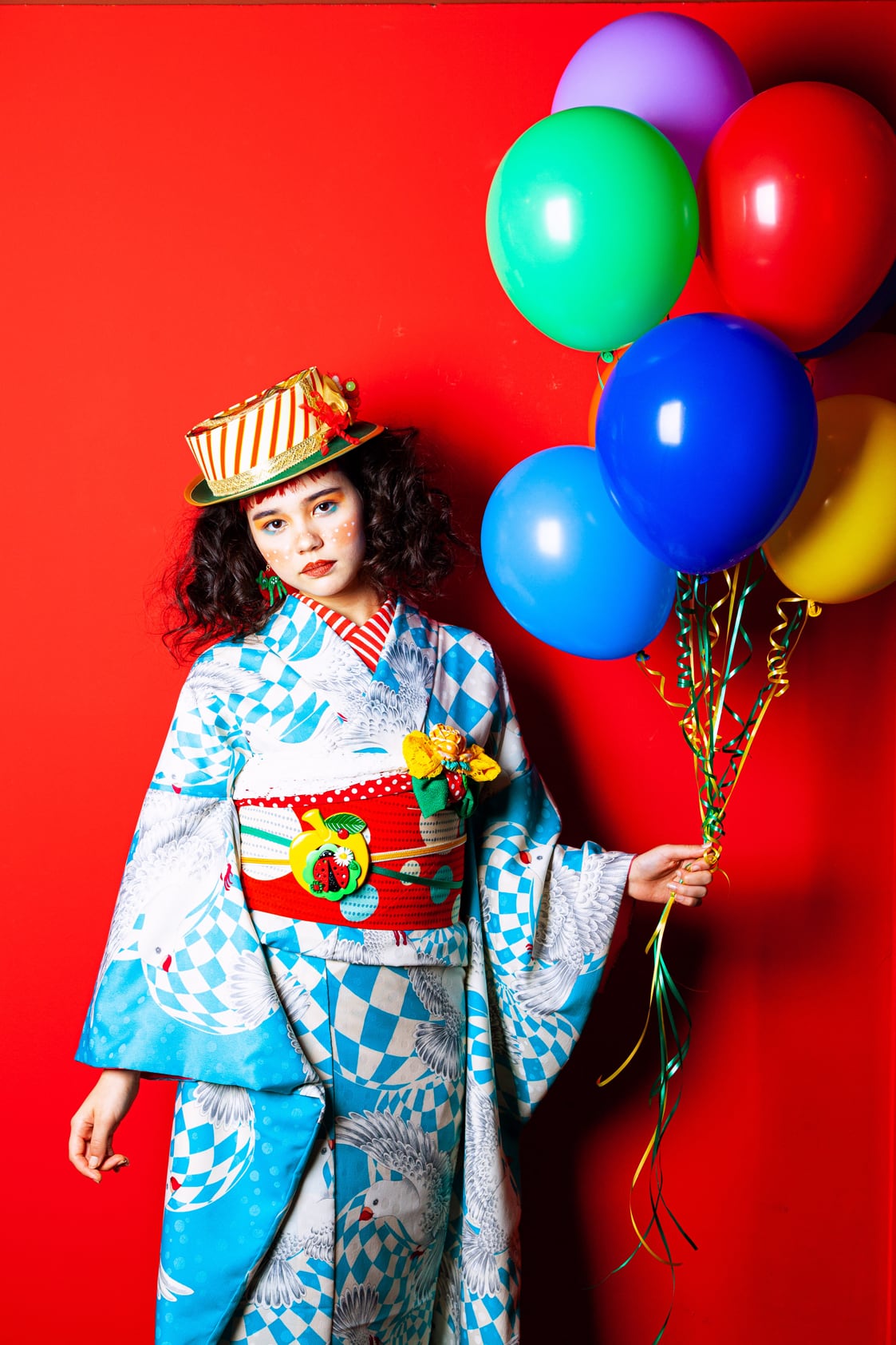 市松模様の球体をベースに配置したモダンで奥行きのあるデザインの着物です。