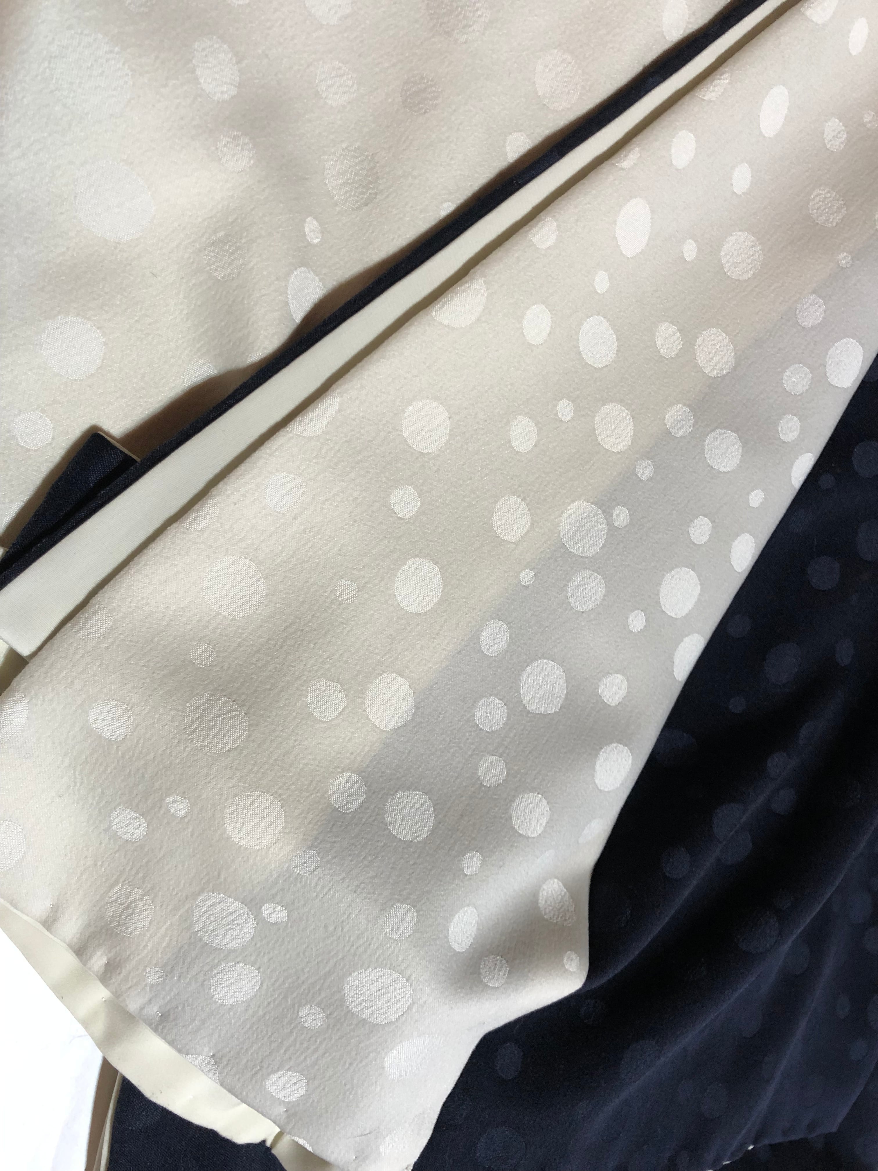 正絹と見紛うようなしっとりした艶のある、ポリエステルの水玉地紋素材をこだわりの色で無地染めしました。