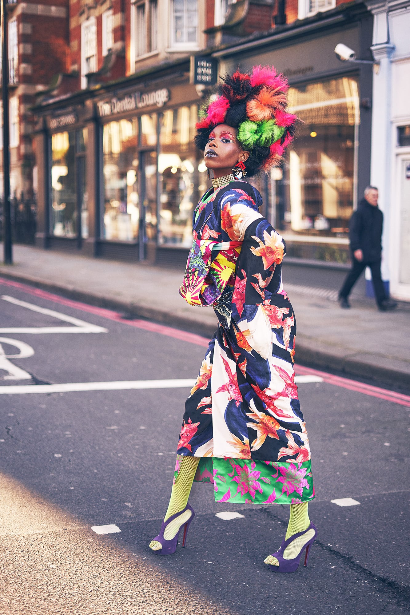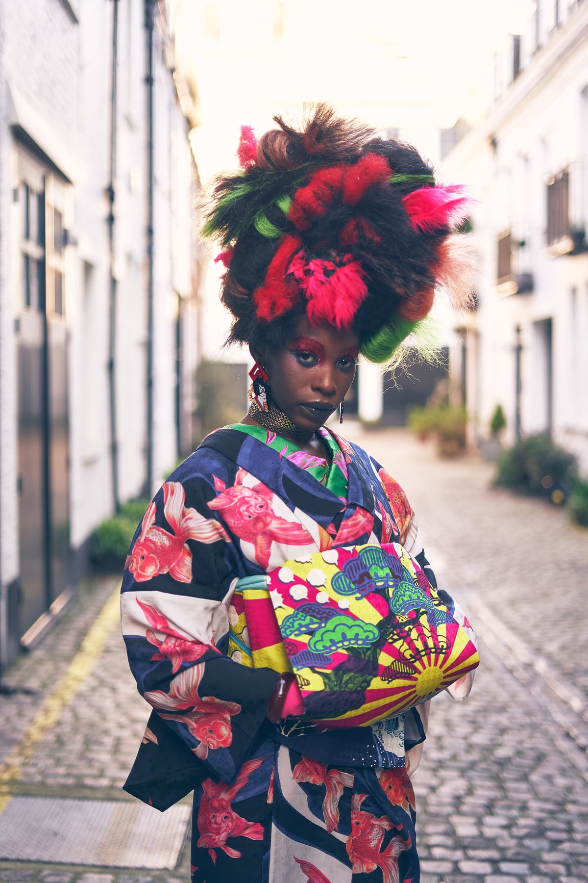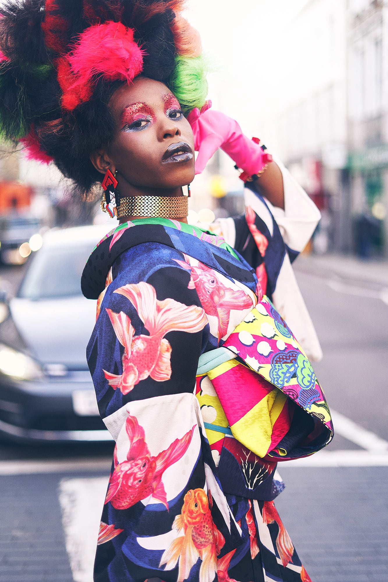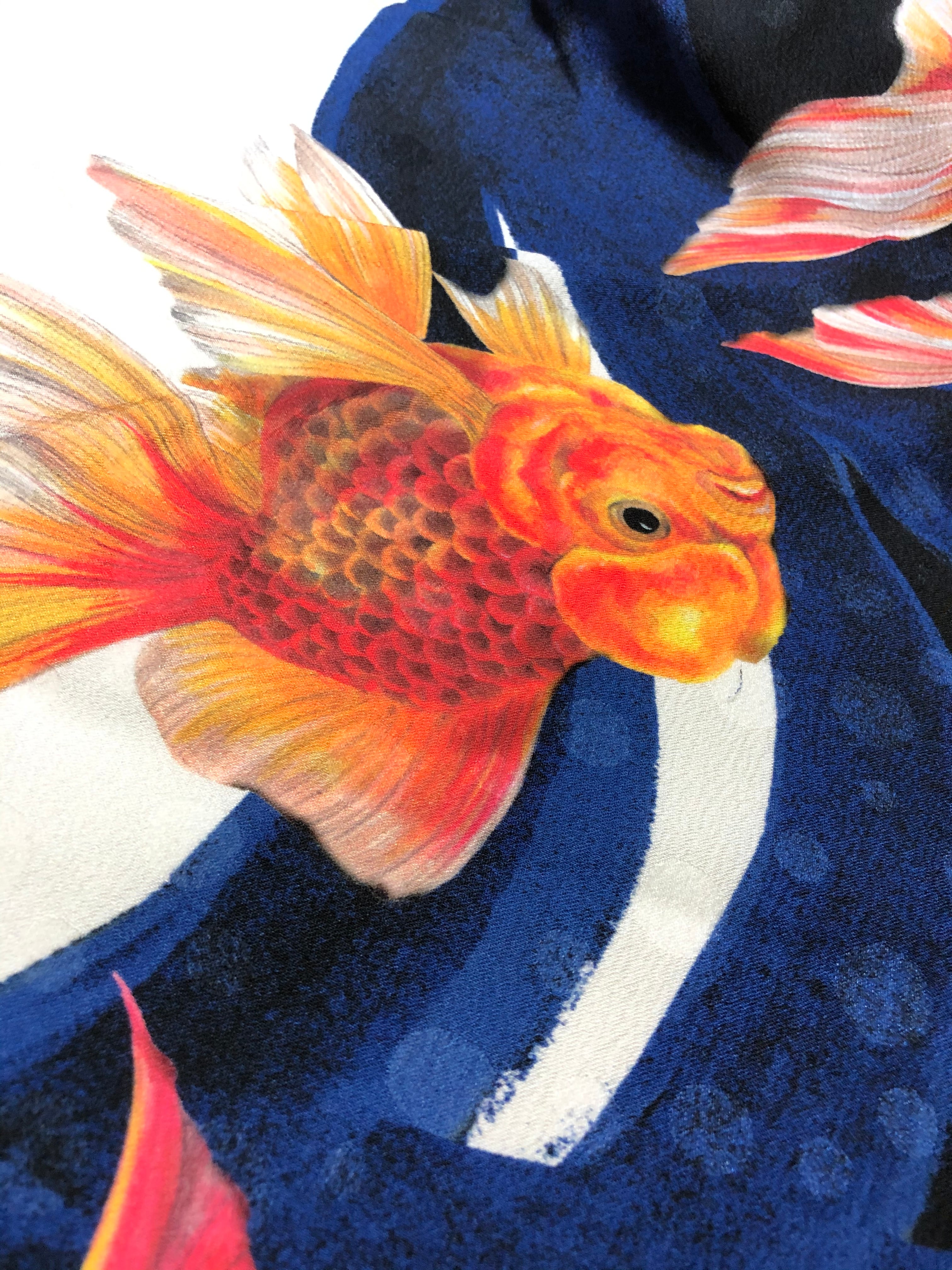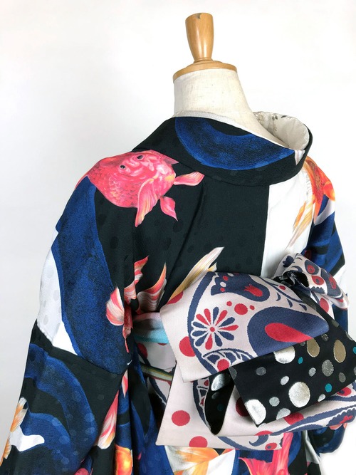 水の中で揺らめく金魚を細密に描き、着物にしました。