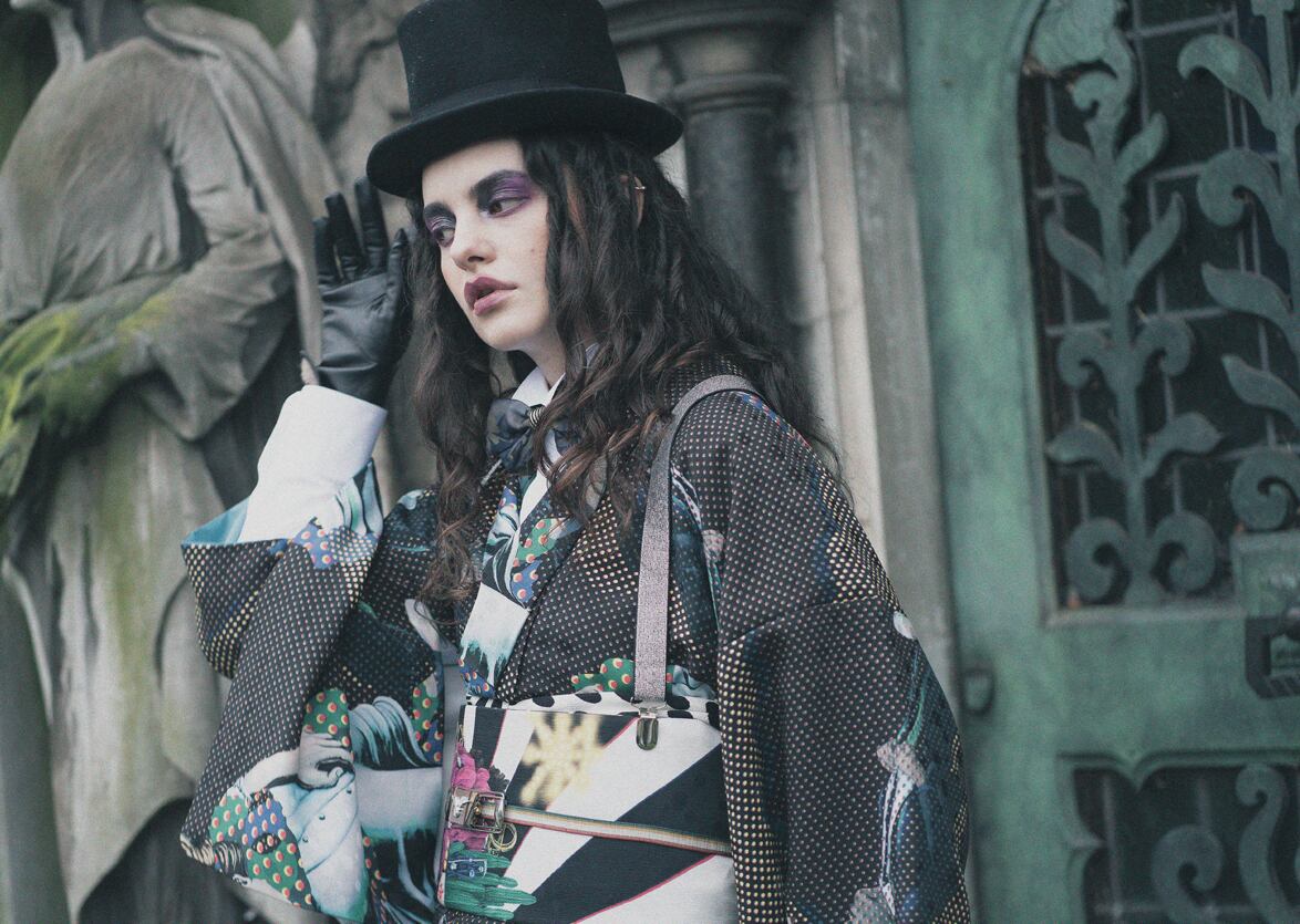 メインテーマの「メメント・モリ」に関連して制作した「MURDER CASE」シリーズの着物・帯をスタイリングに使用しています。