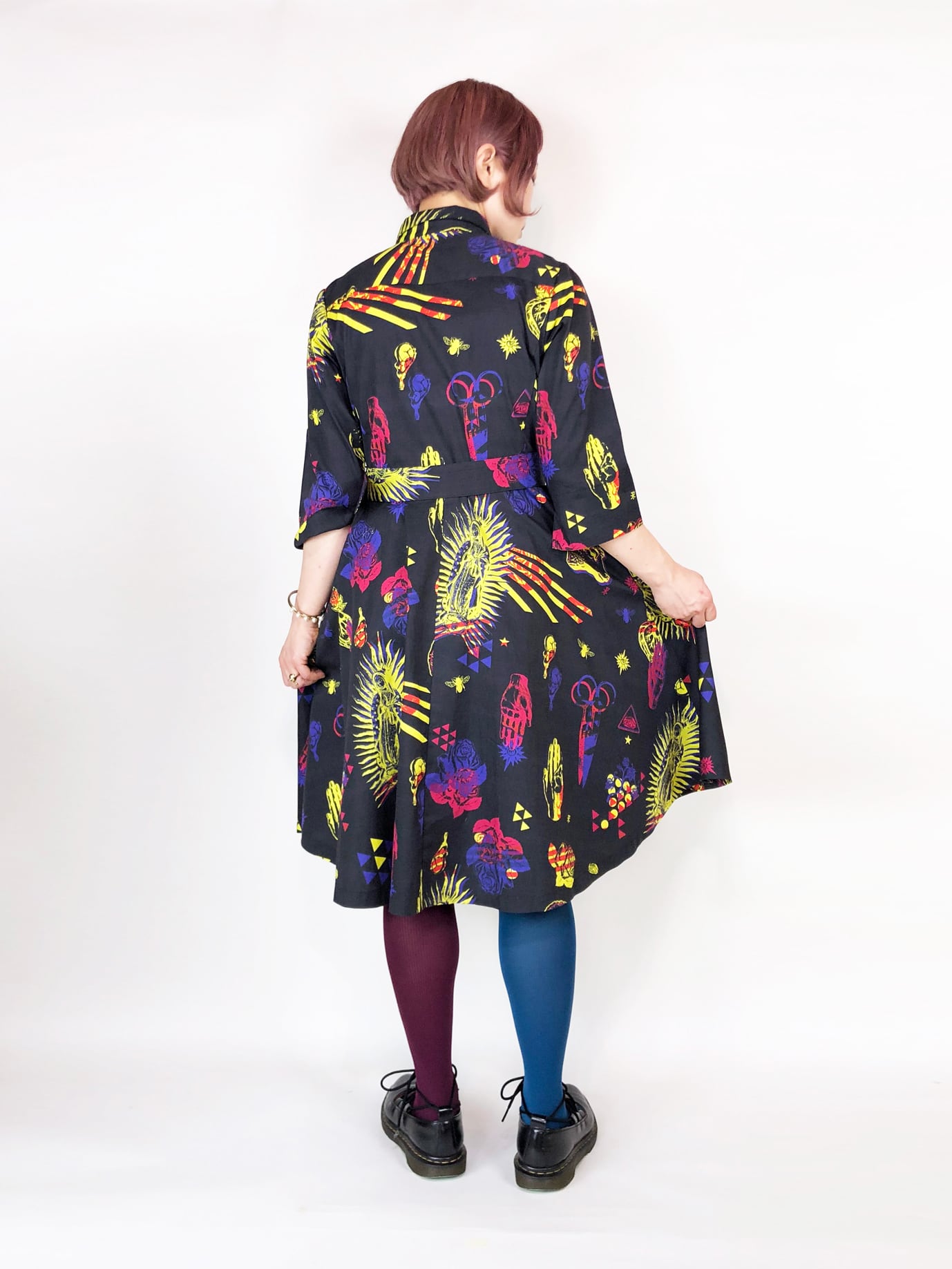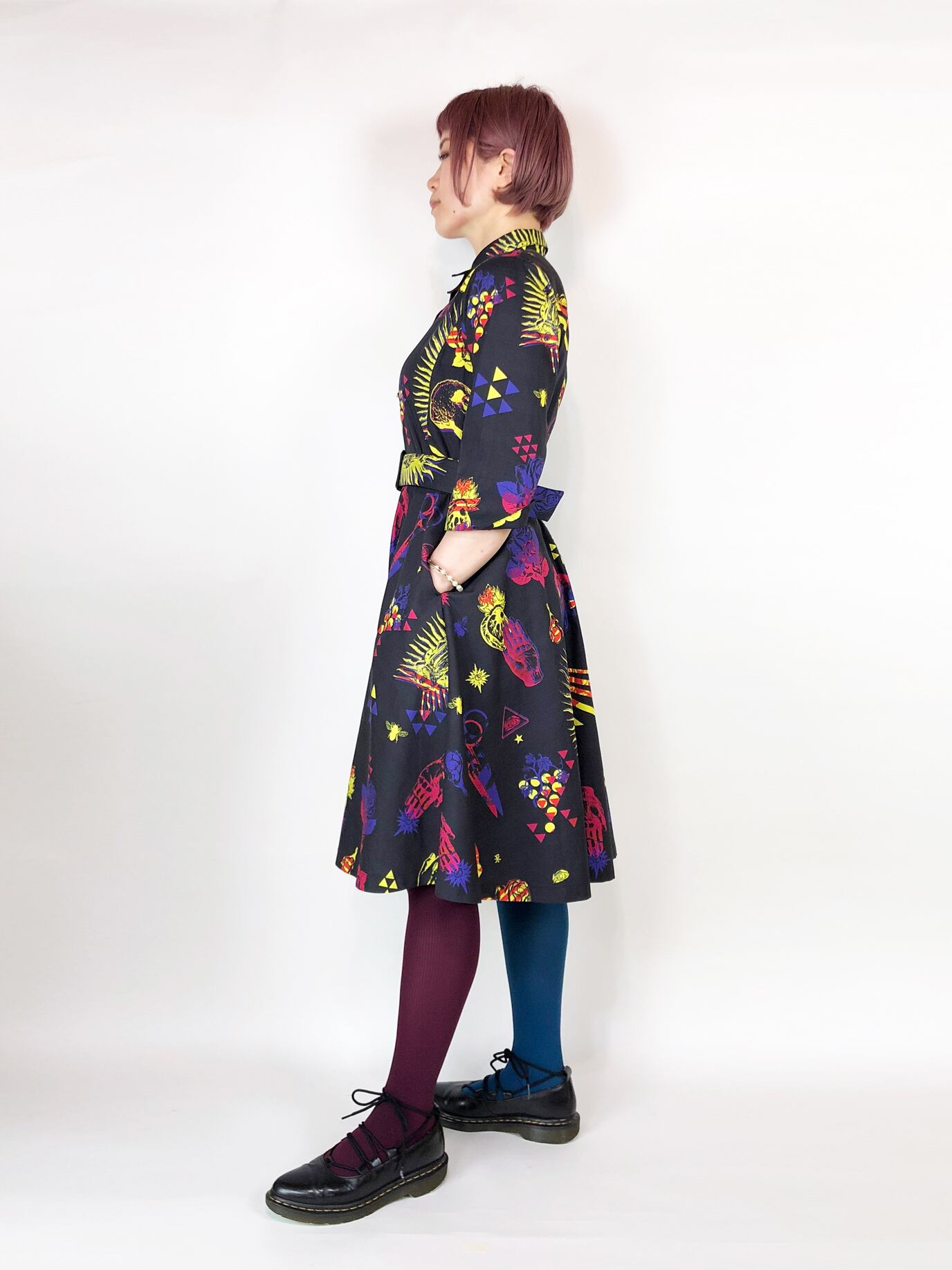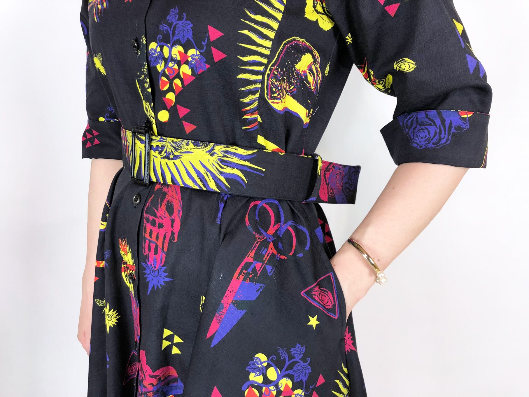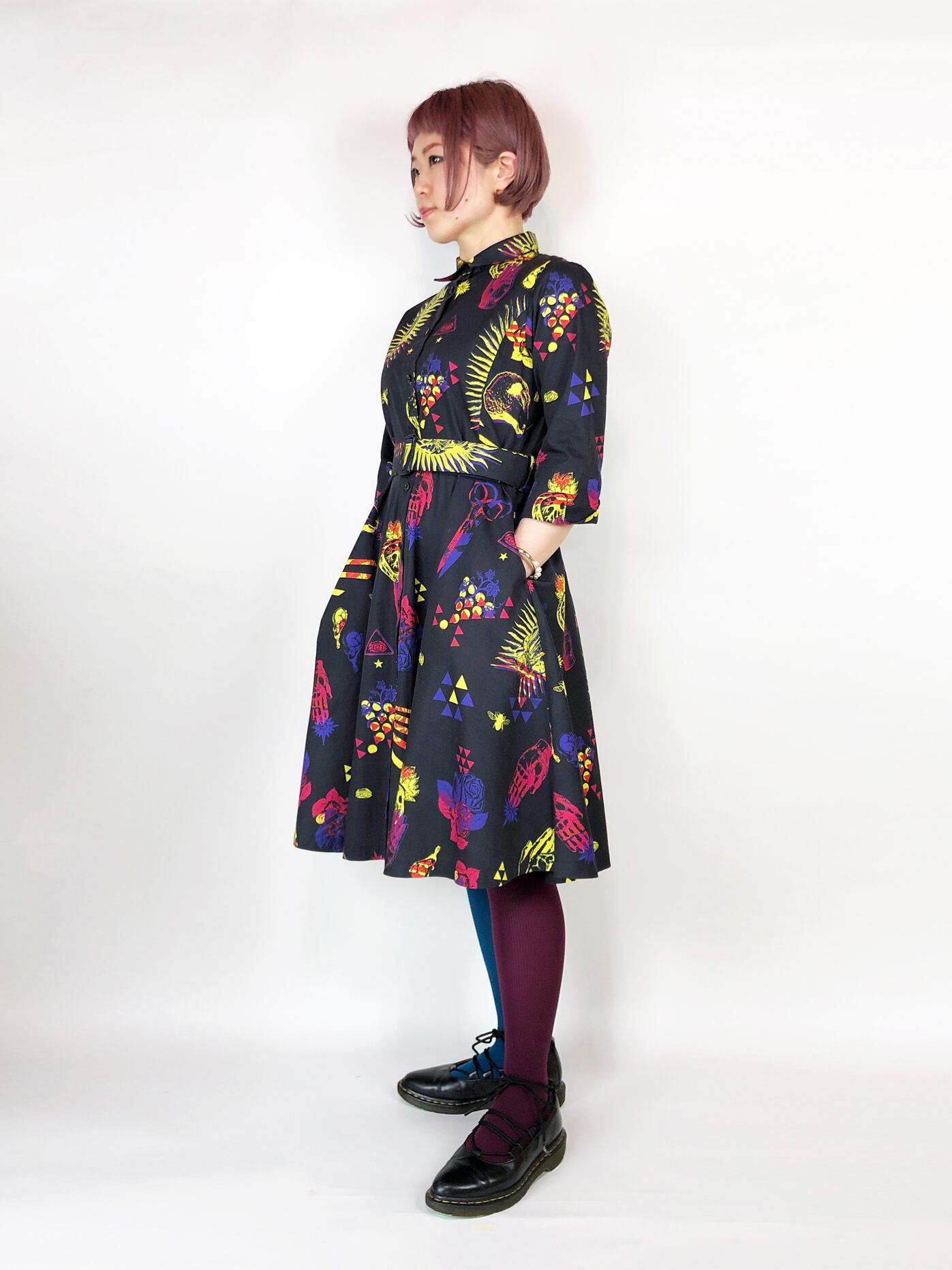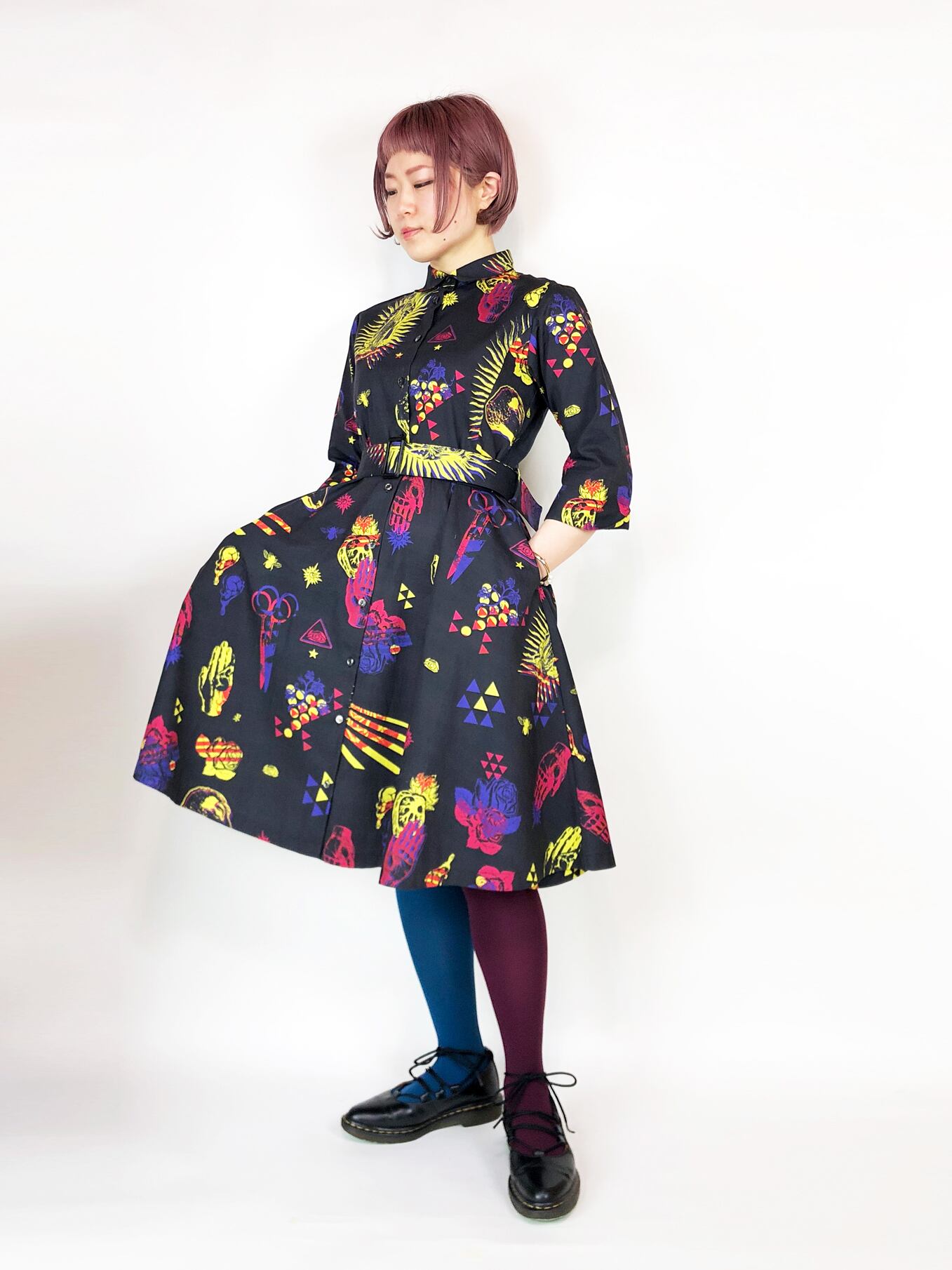 重宗玉緒オリジナルのプリント生地を使用したシャツワンピース。