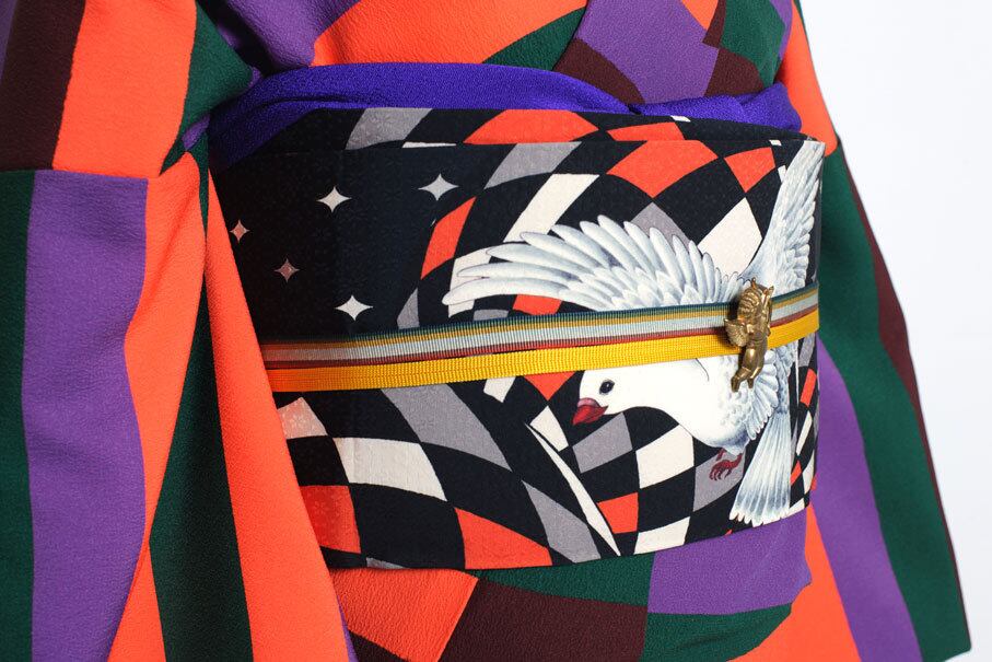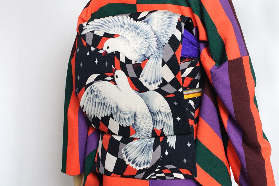 お太鼓の全面を埋める大きな白い鳩が、市松模様の球体の間を羽ばたいています。