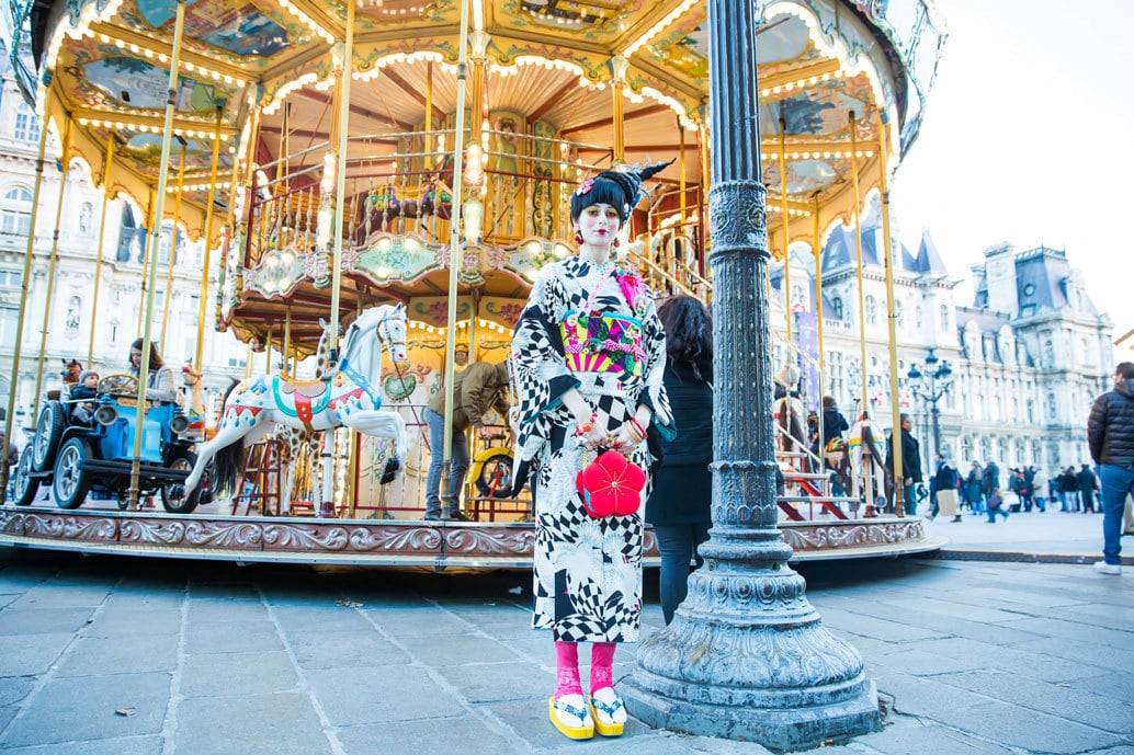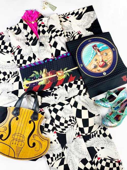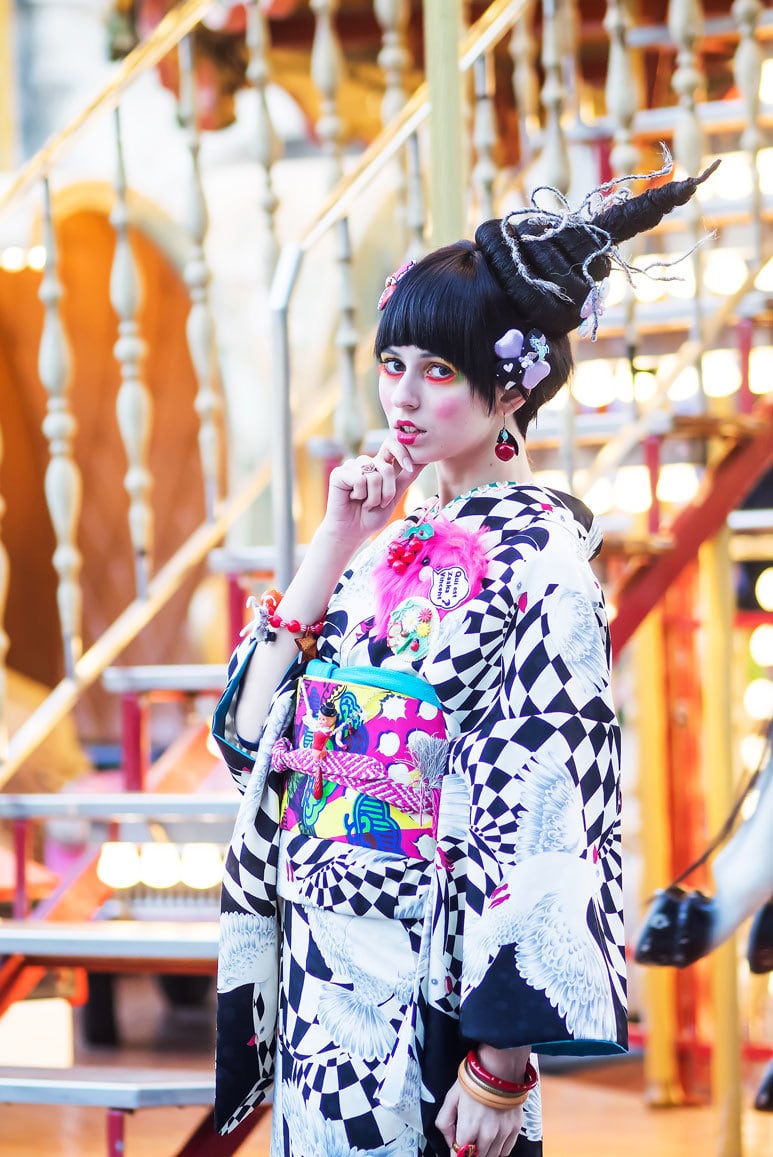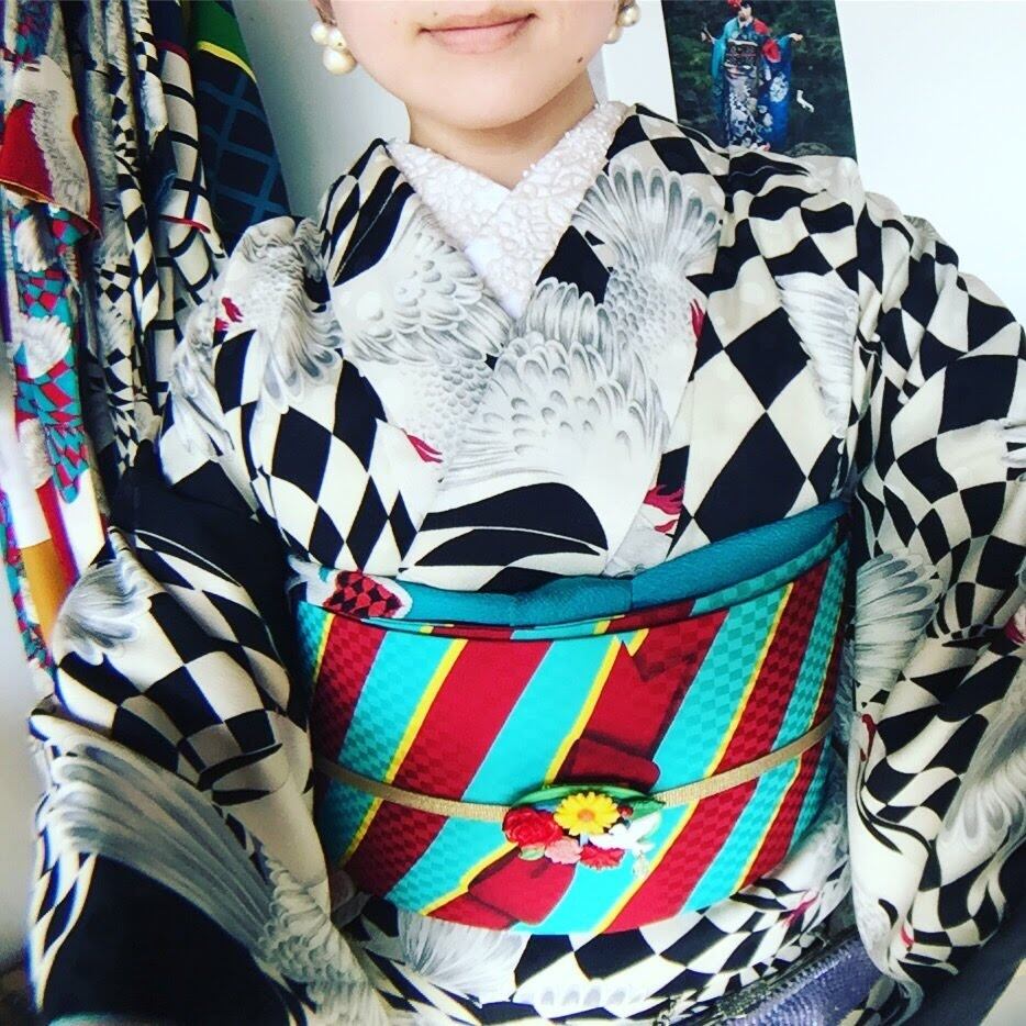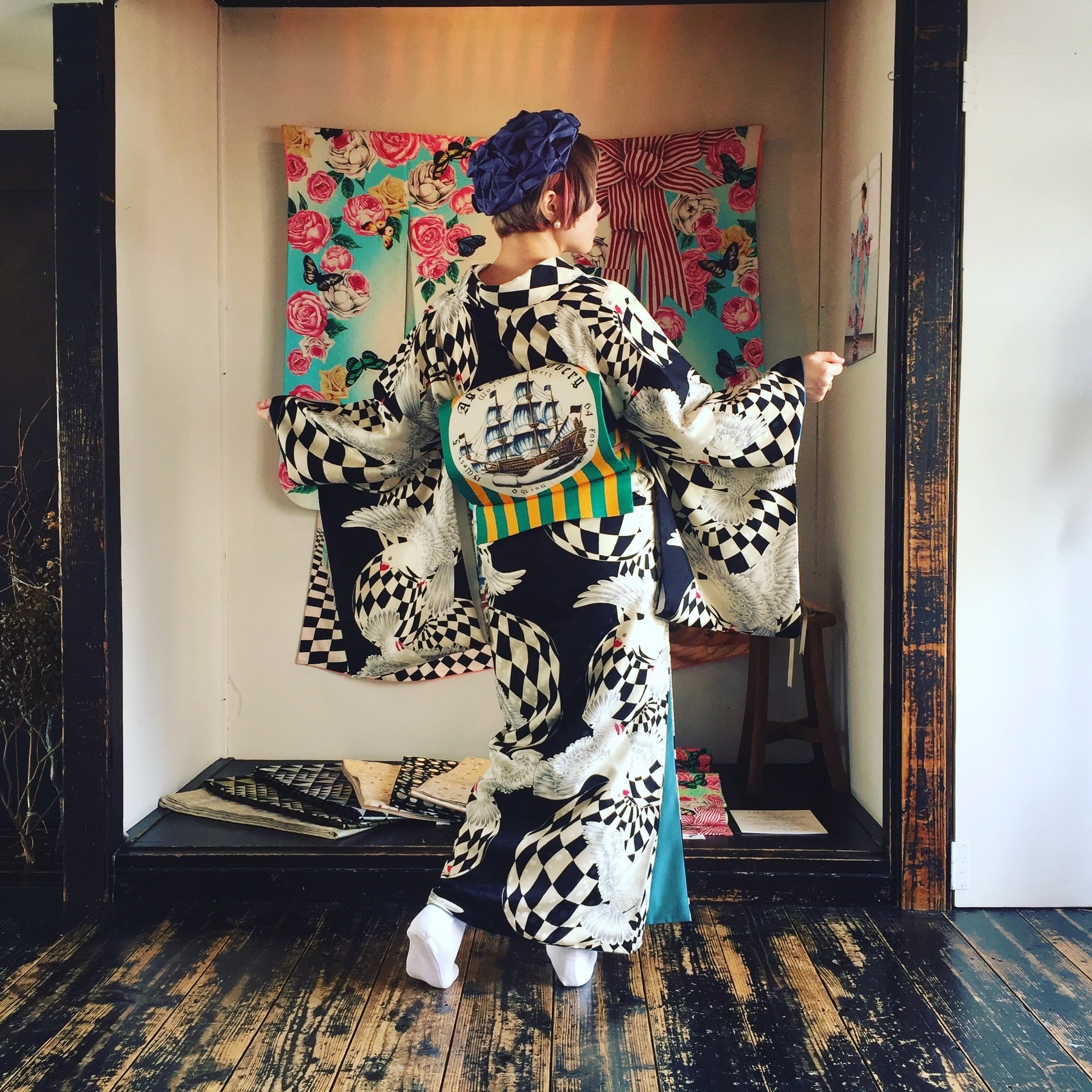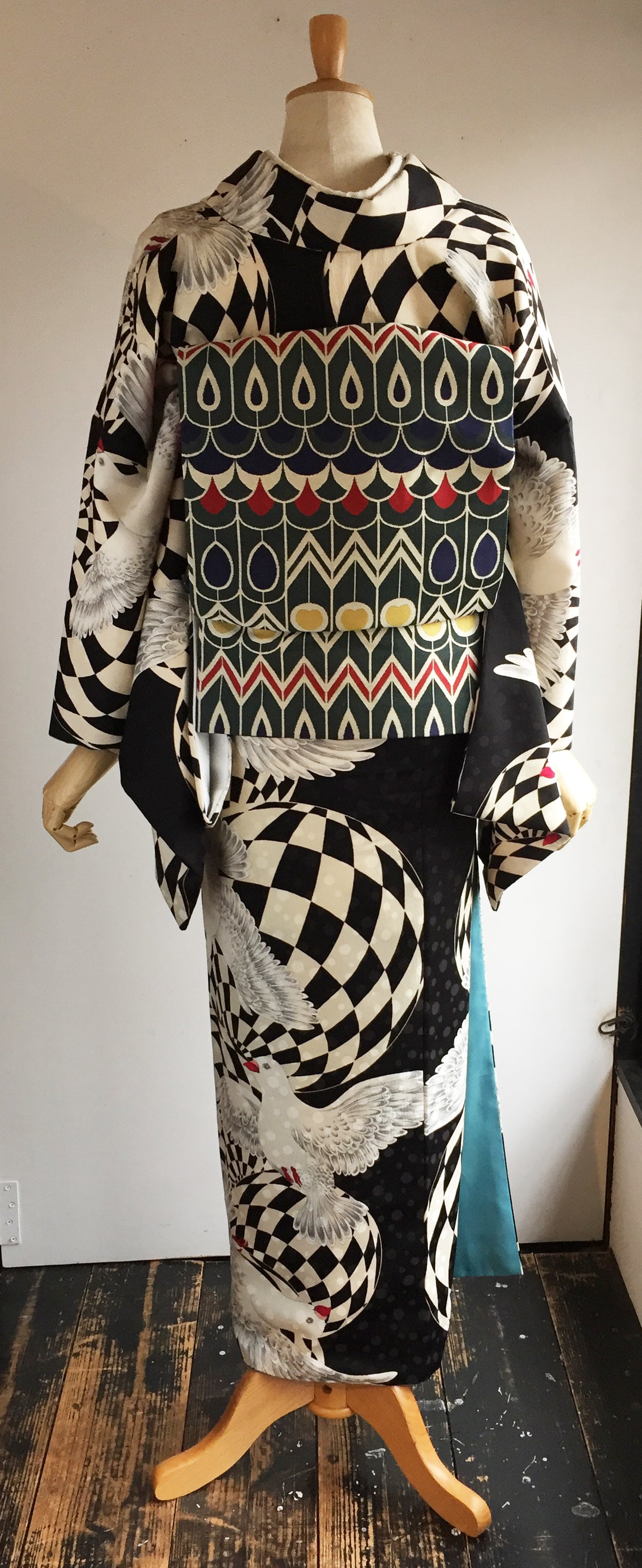 市松模様の球体をベースに配置したモダンで奥行きのあるデザインの着物です。