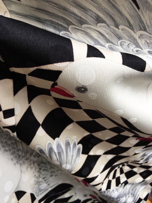 鳩が主張しすぎることがないよう縁取りの線を少し優しい色合いにして、着物にした時に美しく見えるようデザインしなおしました。