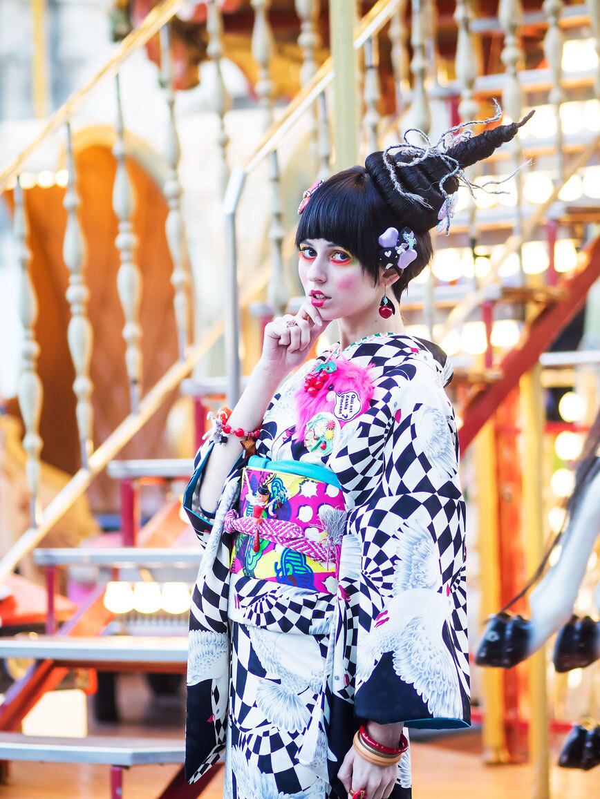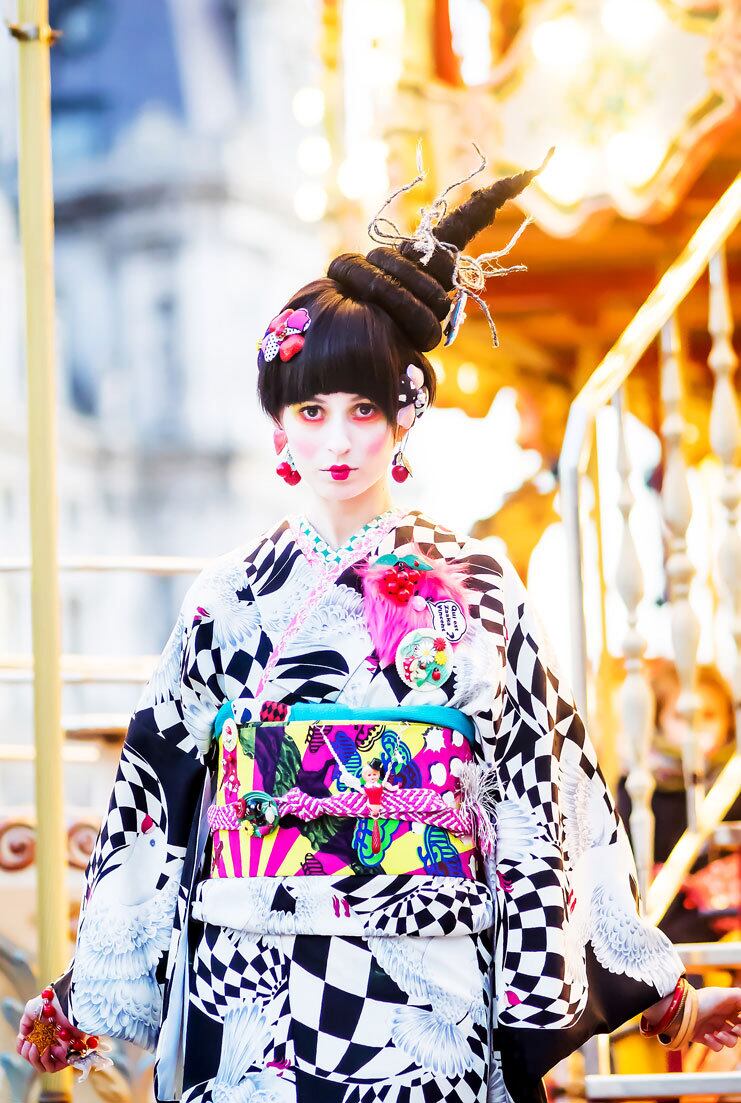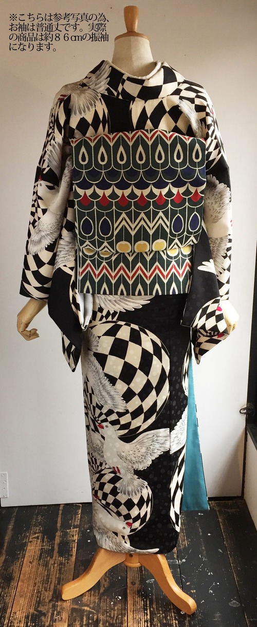 市松模様の球体をベースに配置したモダンで奥行きのあるデザインの着物です。