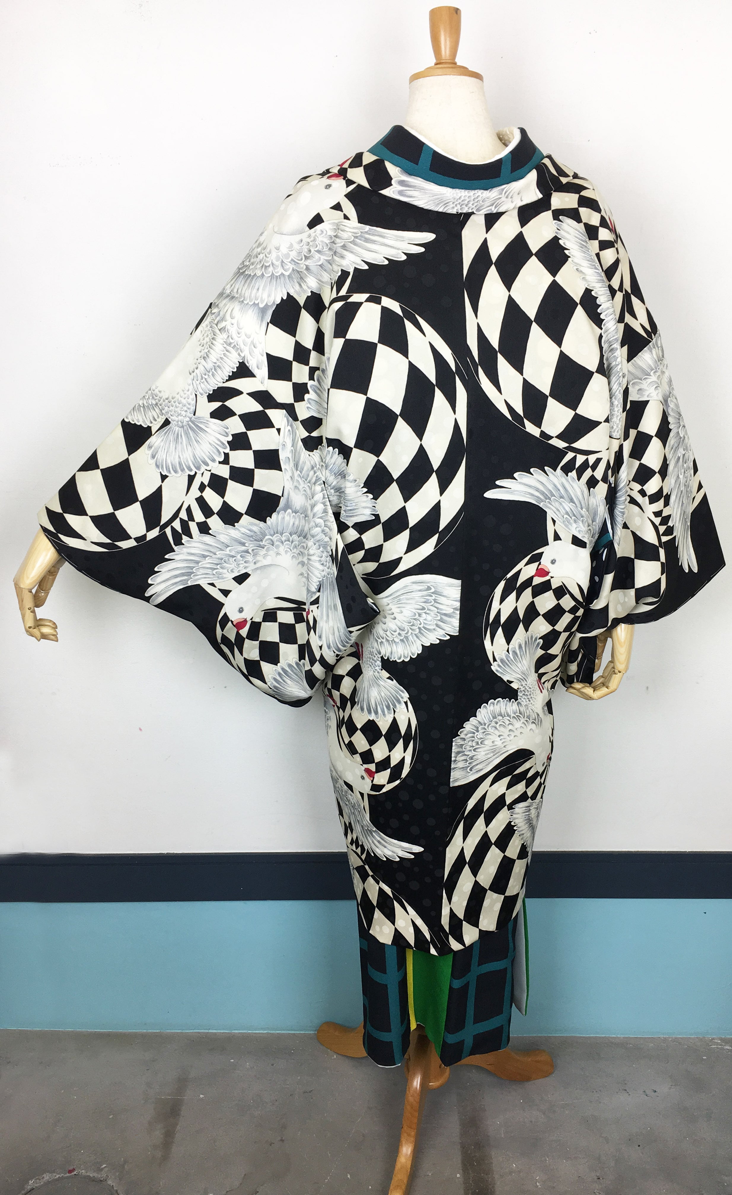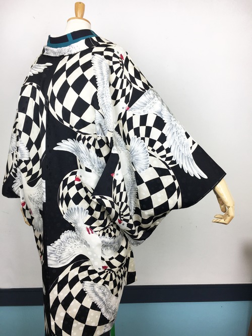 同じ鳩柄の名古屋帯「Petit pigeon」は手描きの下絵の風合い、絵の具の滲み、グラデーションをそのまま生かしてインクジェットプリントで制作していますが、こちらの着物は型染めで制作し、アンティーク着物のようなレトロな雰囲気に。