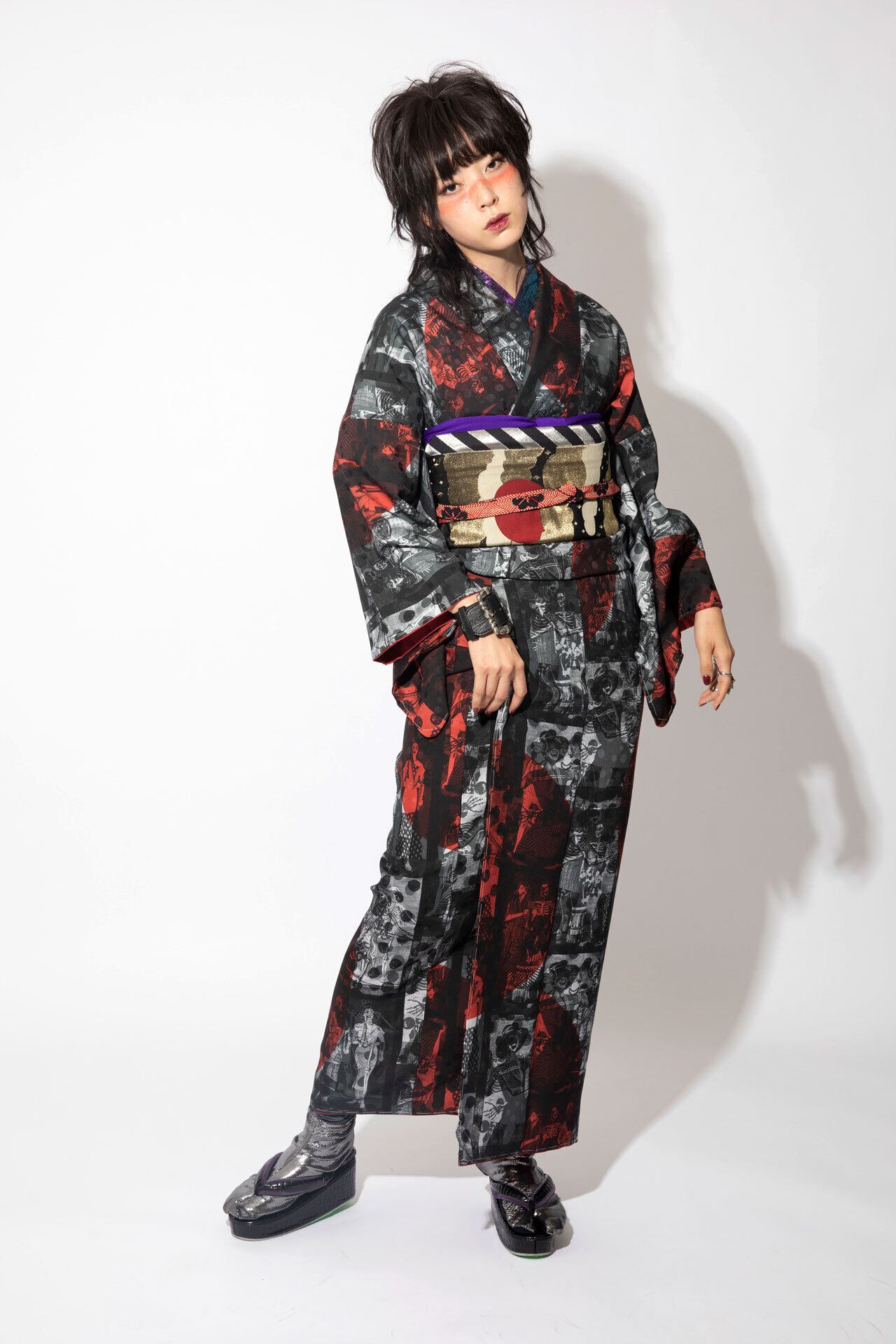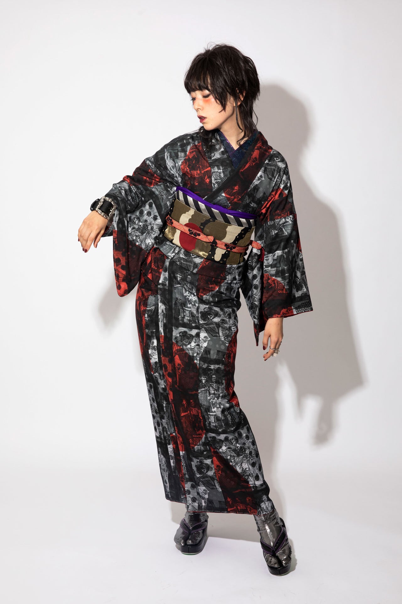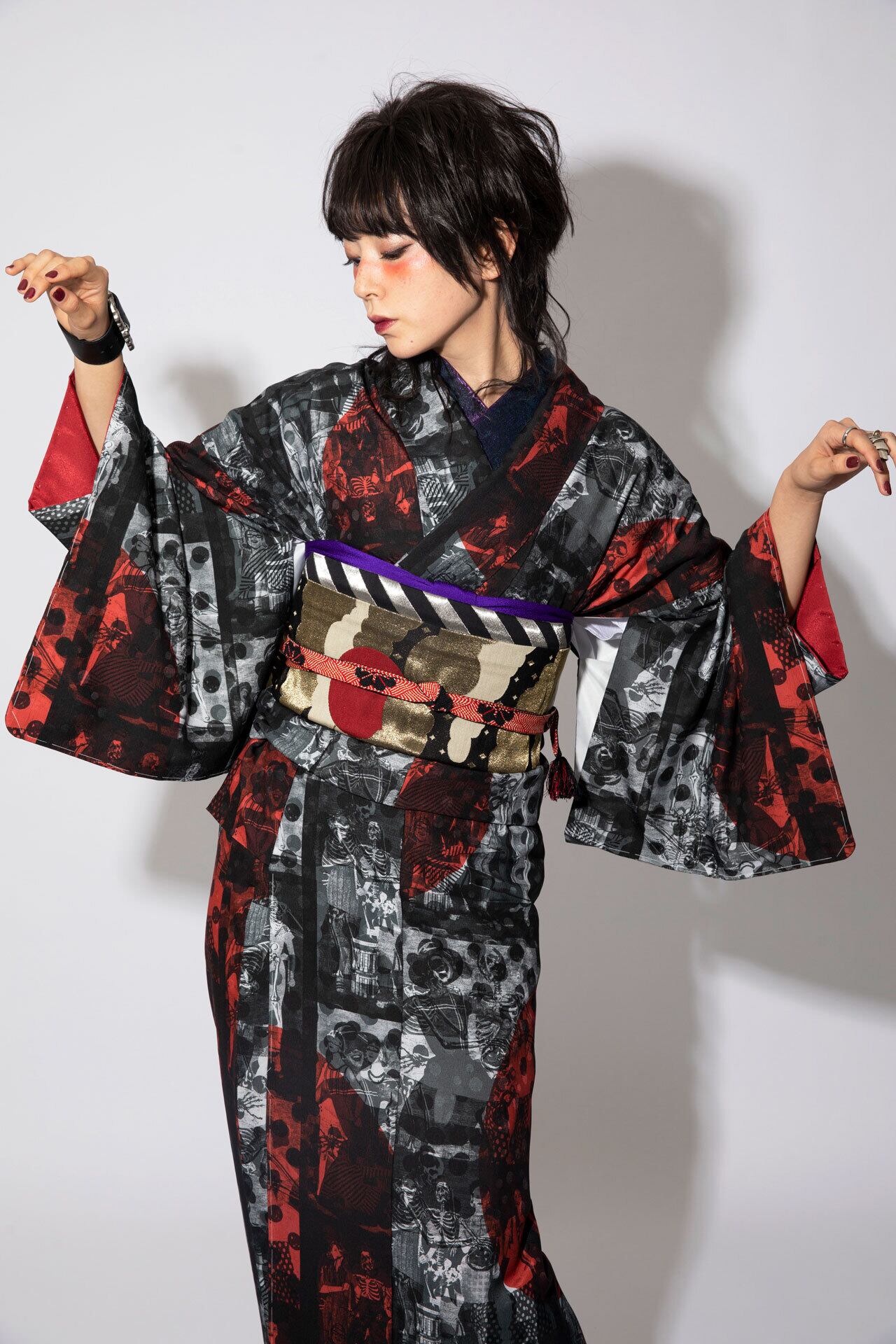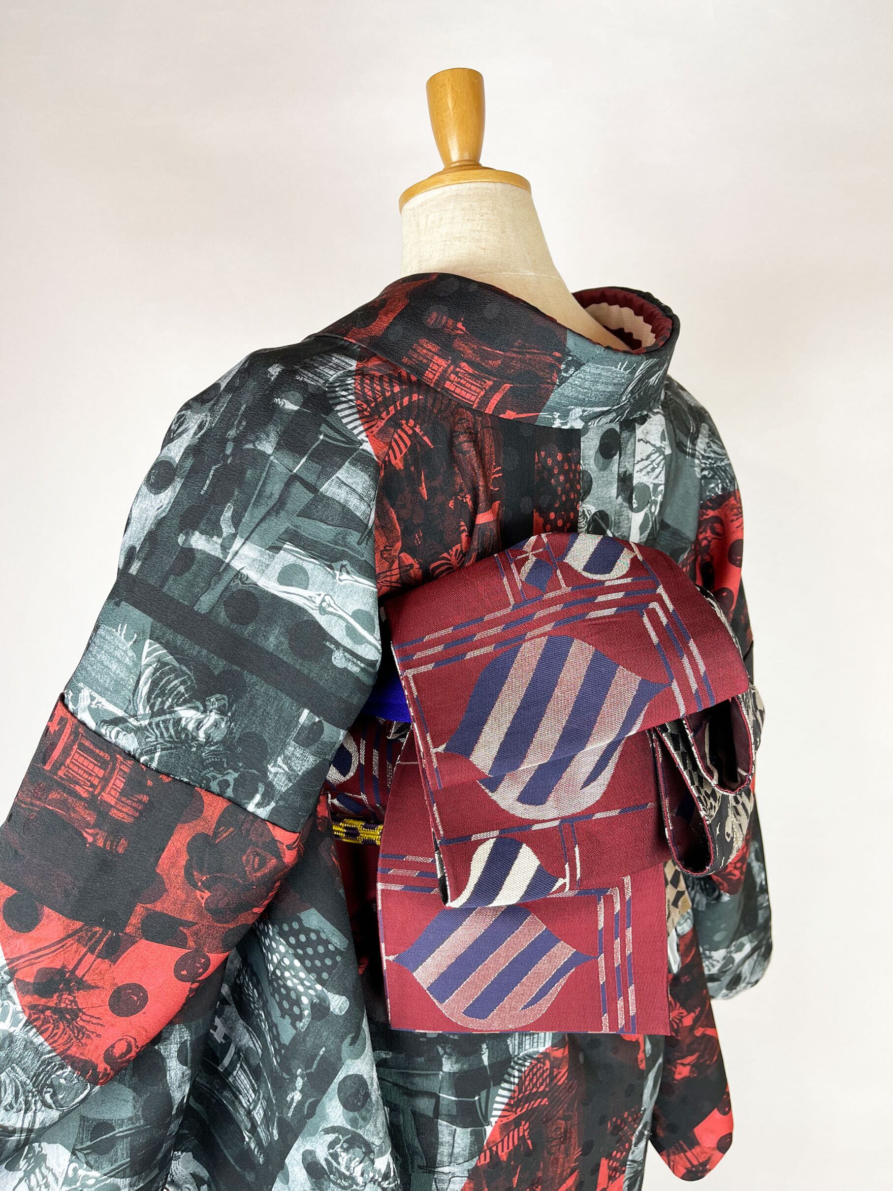 カラフルな絵画を素材に使い、一転してシックなメッセージ性のある着物に。