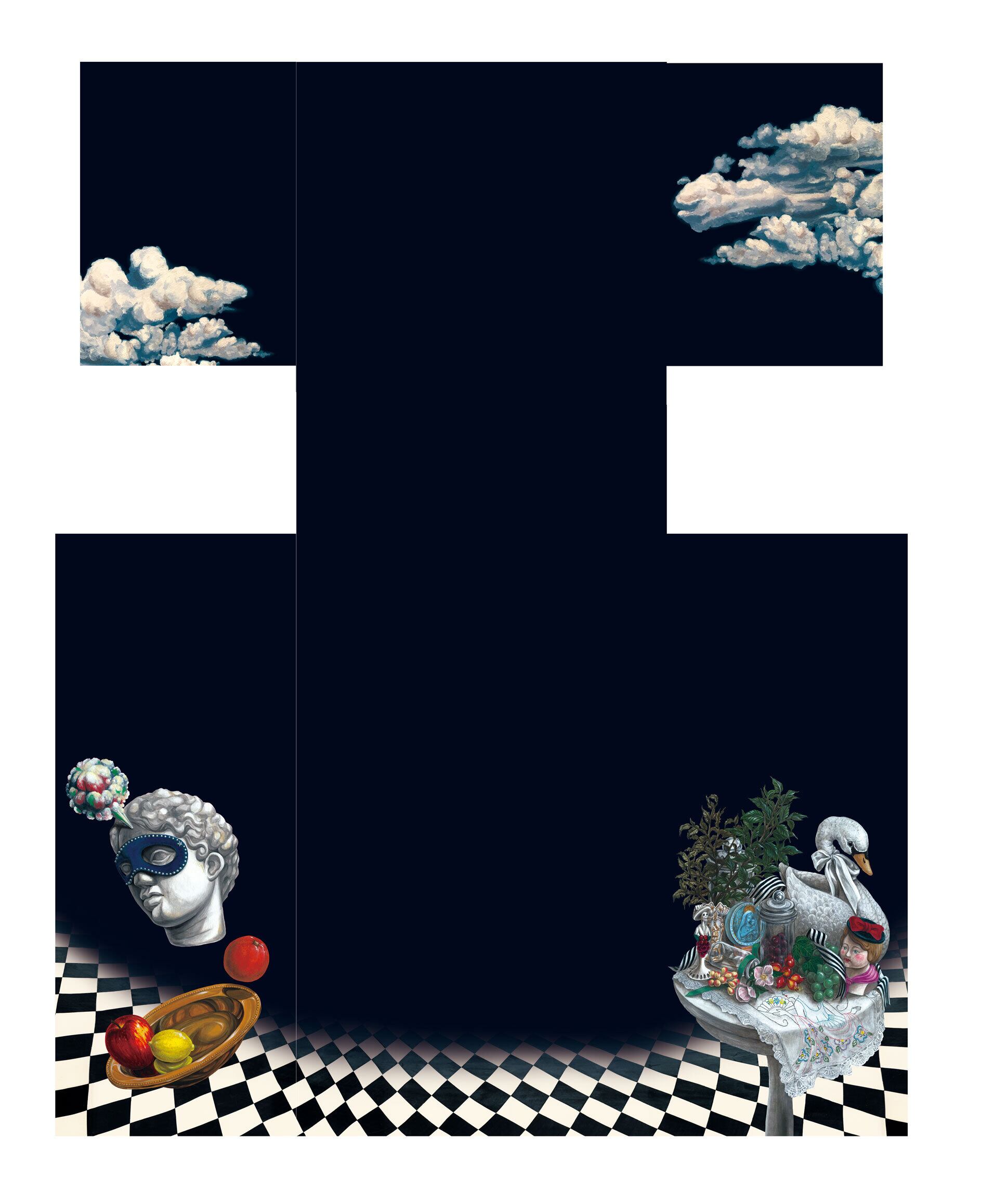 裾周りにはぐるりと市松模様の床が描かれ、下前には静物画「Vanitas」が配置されています。