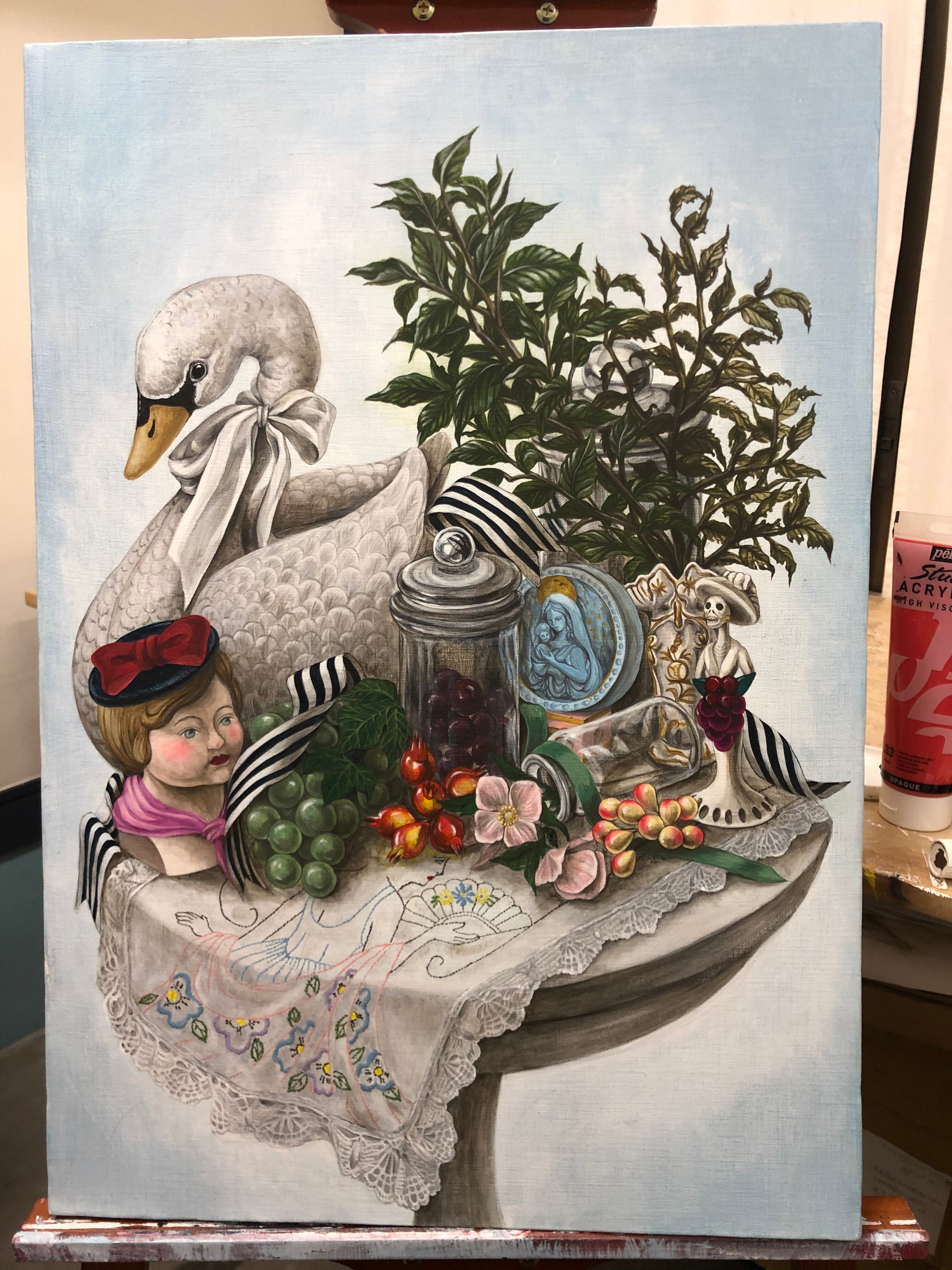 それをアレンジして、コロナ渦で外出が出来なかった時にアトリエにある重宗玉緒所蔵コレクションだけでモチーフを組んで描いた静物画です。