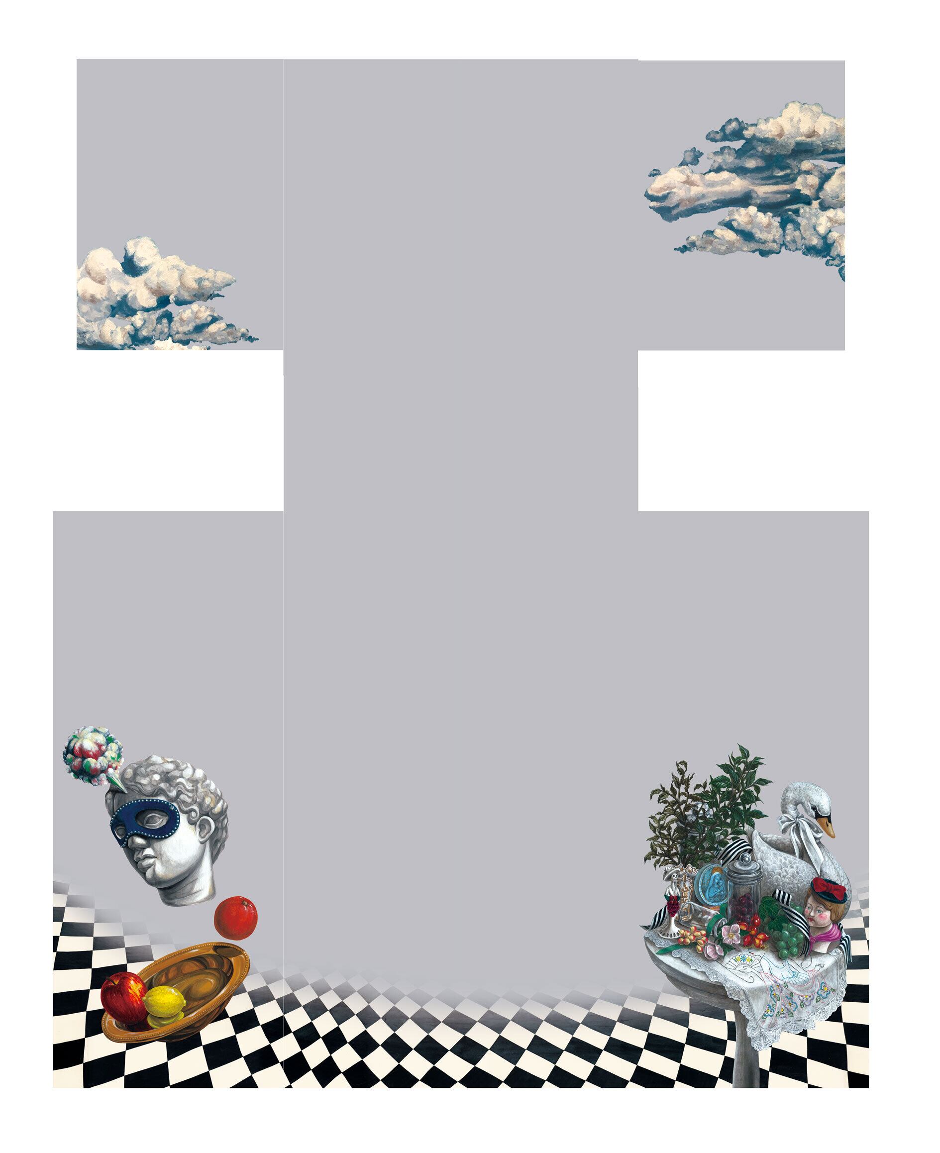 裾周りにはぐるりと市松模様の床が描かれ、下前には静物画「Vanitas」が配置されています。