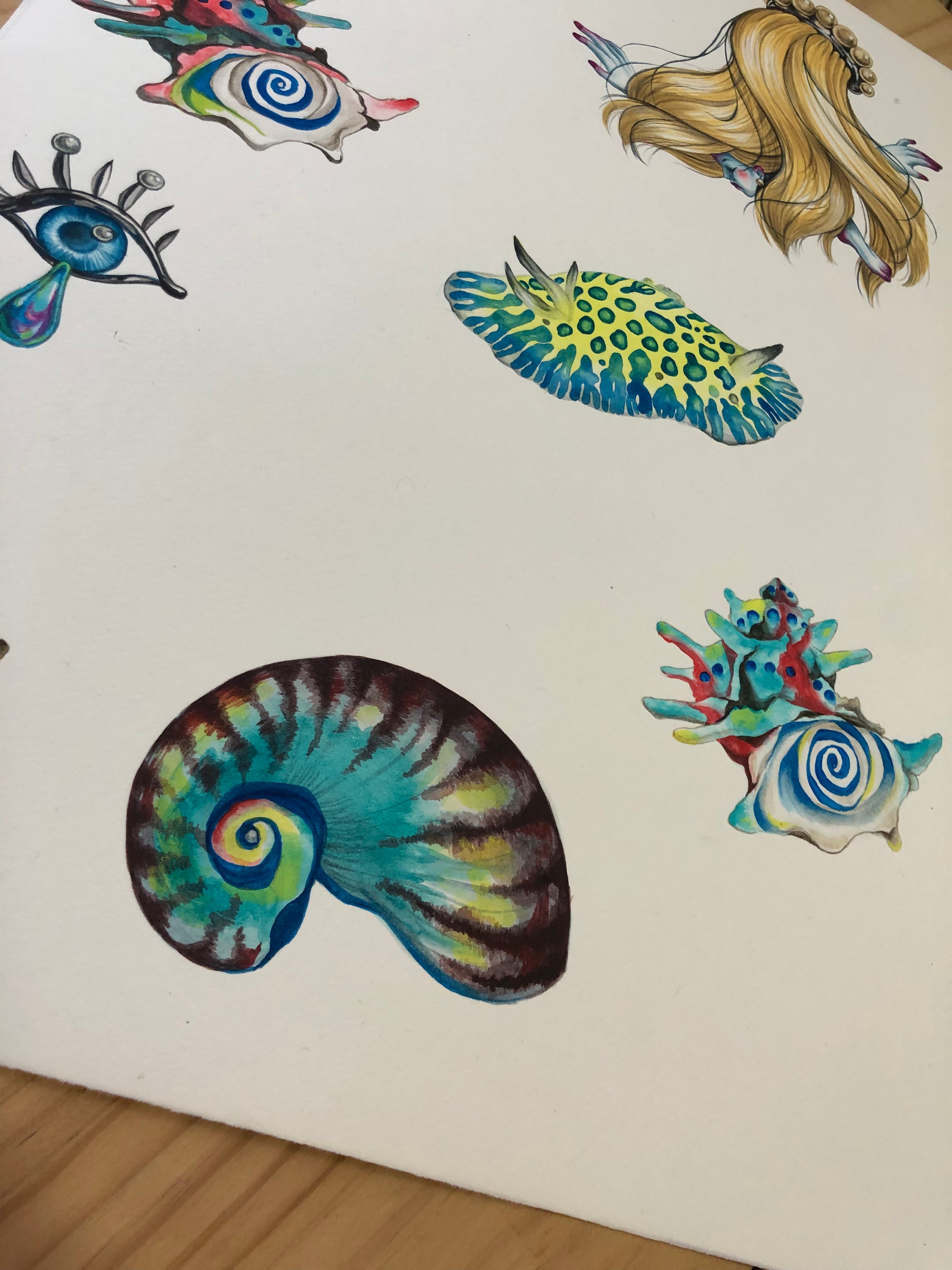 サザエ、カラフルな巻き貝、ヒトデ、真珠貝、ウミウシ。