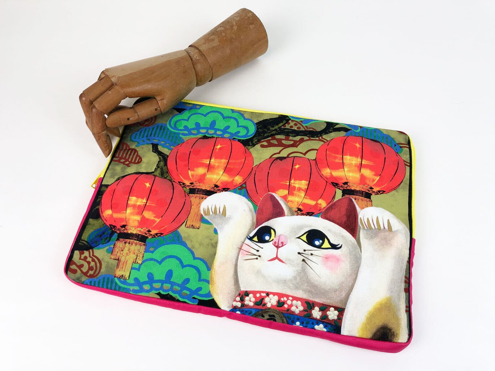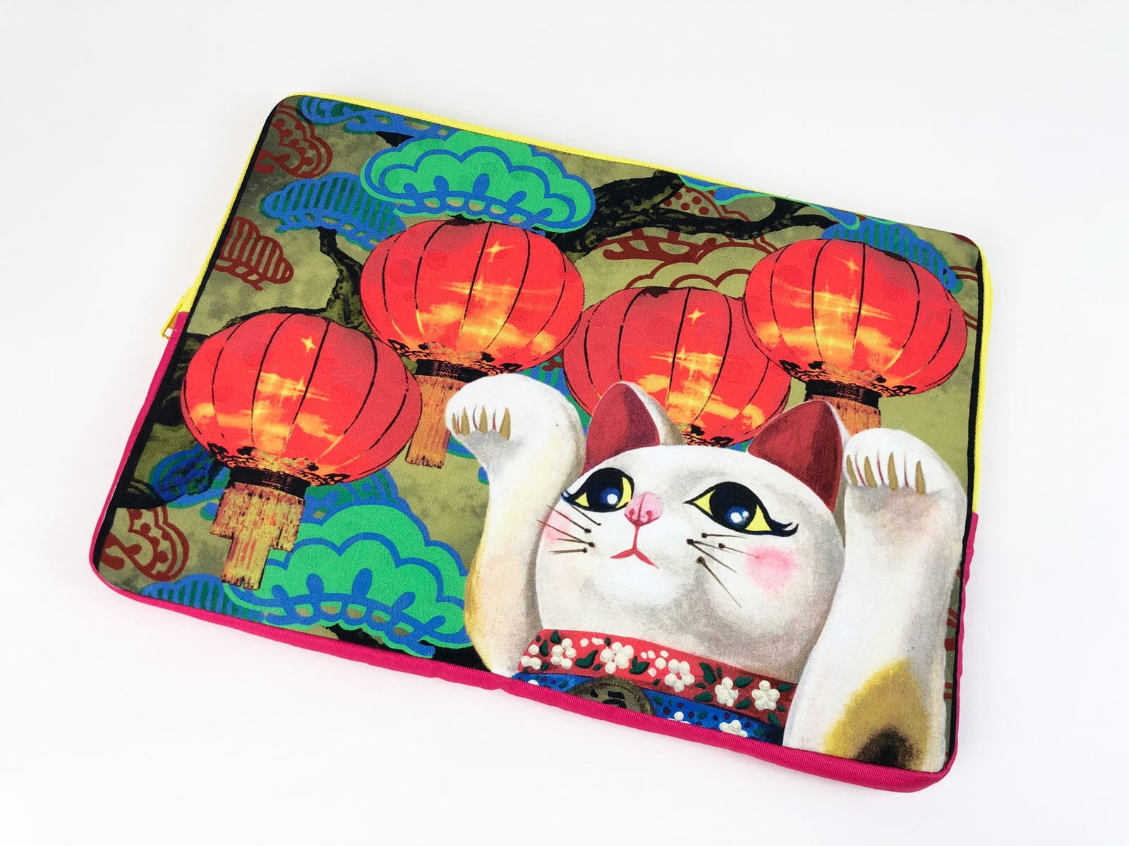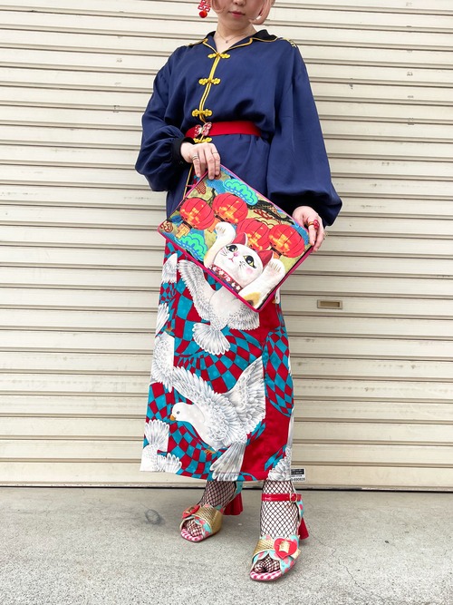 「来世」の帯裏に使用されている招き猫デザインの生地を使って制作しています。