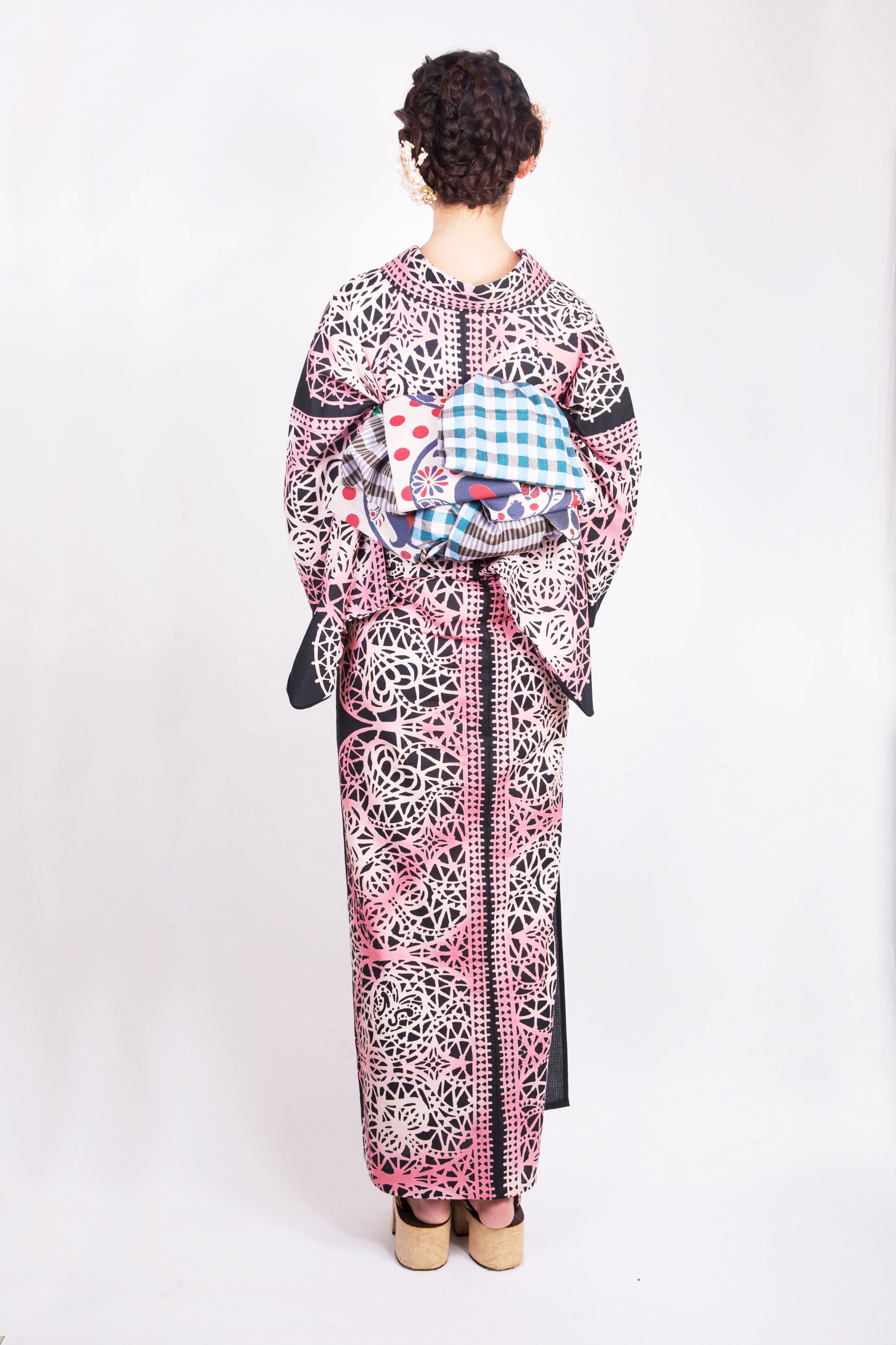 また、こちらのブラック×ピンクのカラーは「抜染」という技法を用いて制作されています。一度反物を全て黒無地に染めたあと、型で防染をして、抜染剤をかけて黒を抜いたあと、ピンクの染料でぼかし染めを行っています。