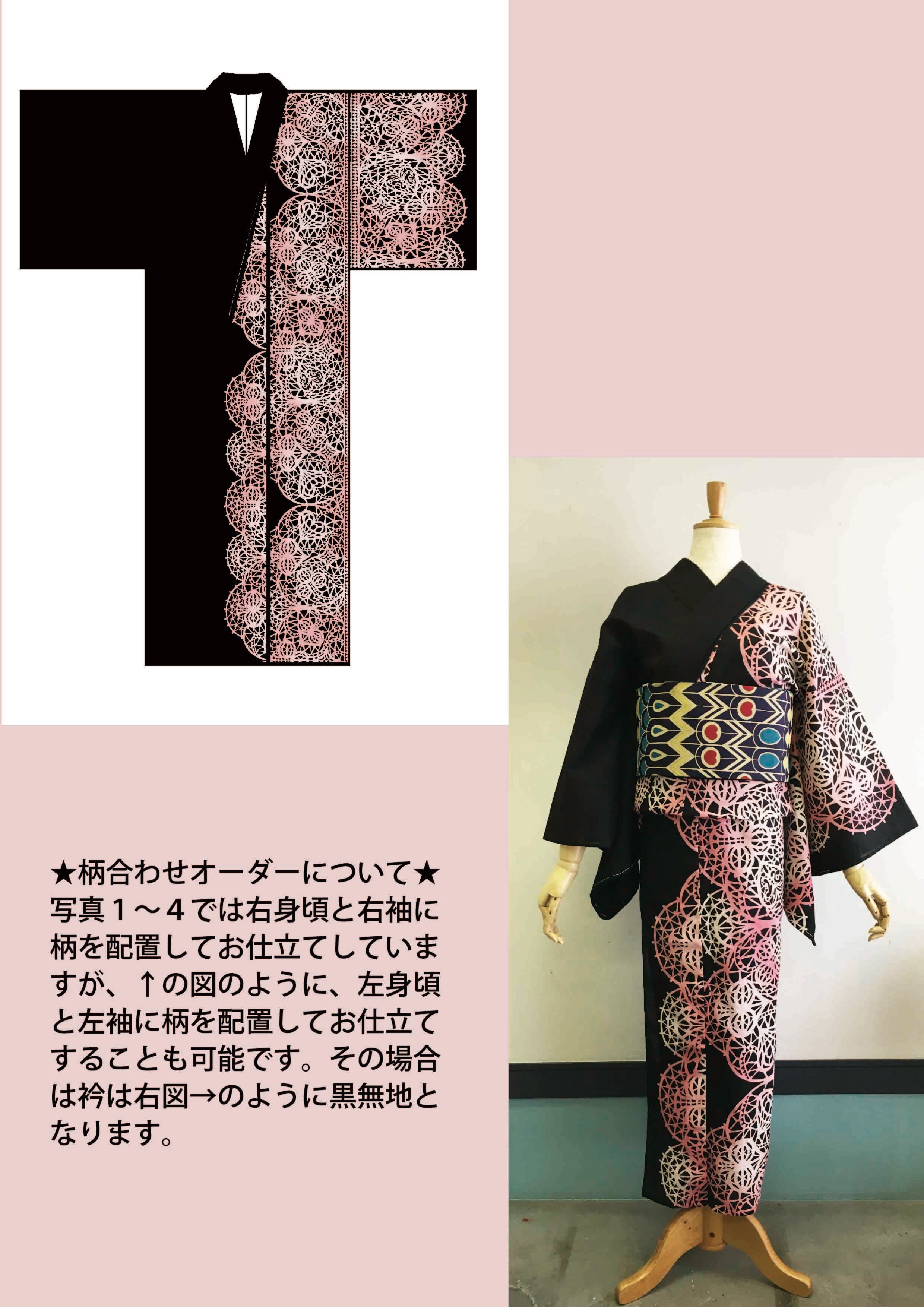 「トランプレース」柄ときりっとした黒無地で片身がわりに仕立てました。