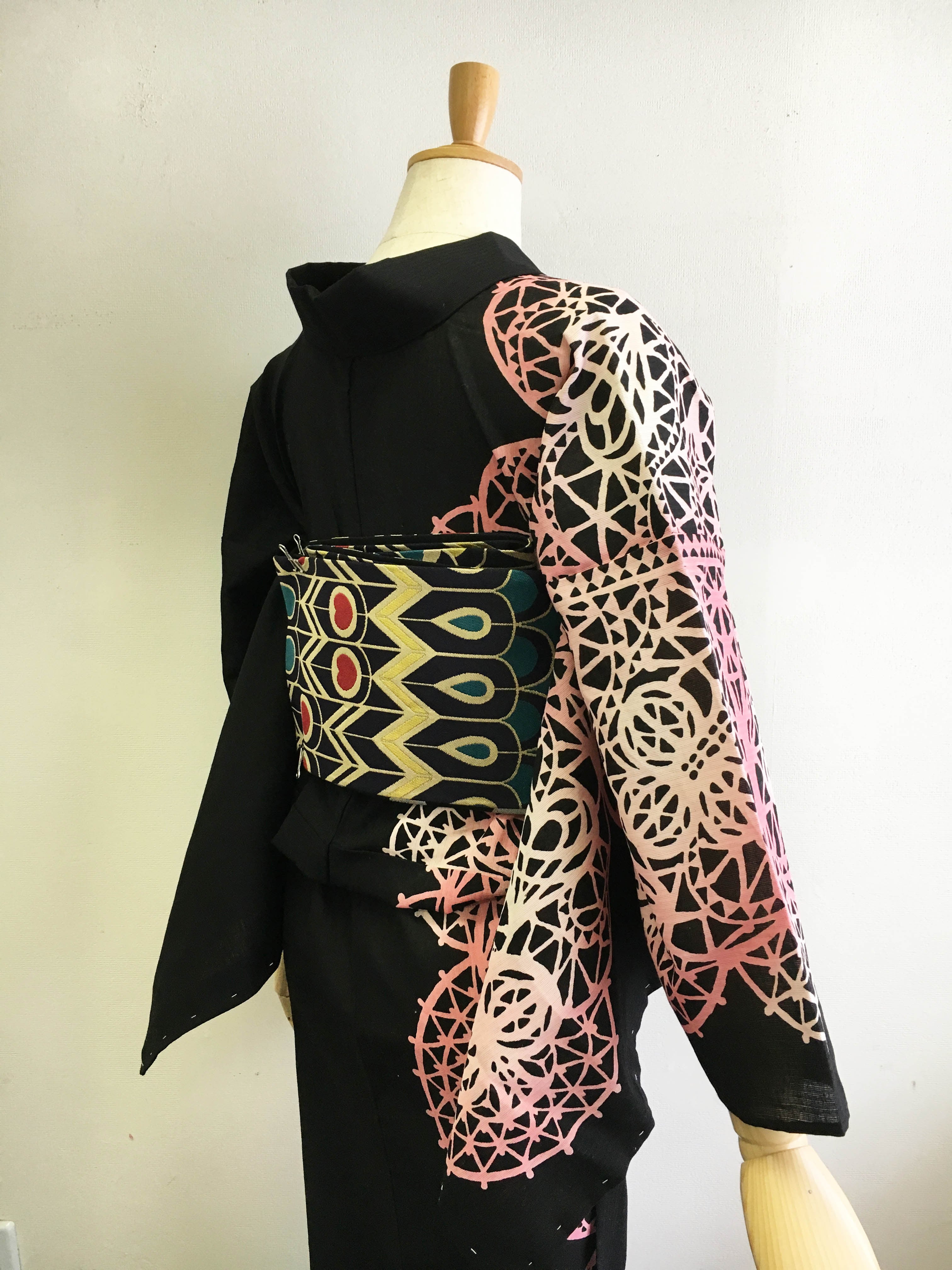 粋なかっこよさだけでなく、合わせる帯や小物によってアール・デコやモダンなど、さまざまなスタイリングが楽しめる振り幅の広い着物です。