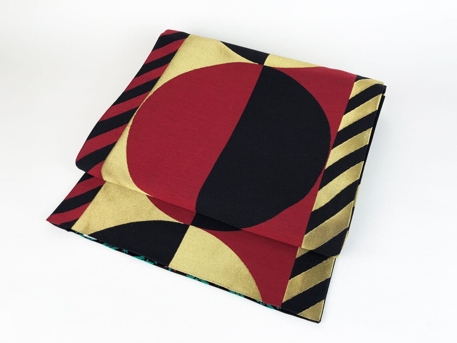 アールデコは、円と線だけで構成されたどんな着物もモダンにアップデートしてくれる柄です。深い赤・黒に組み合わせたのはちょっと錆びたような色合いの渋めのゴールド。