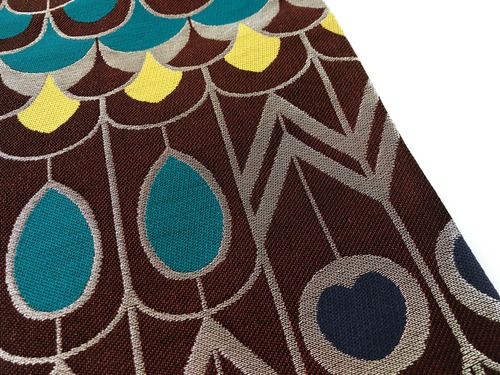 ダークグリーン地にベージュの線でピーコック模様を織りだしています。