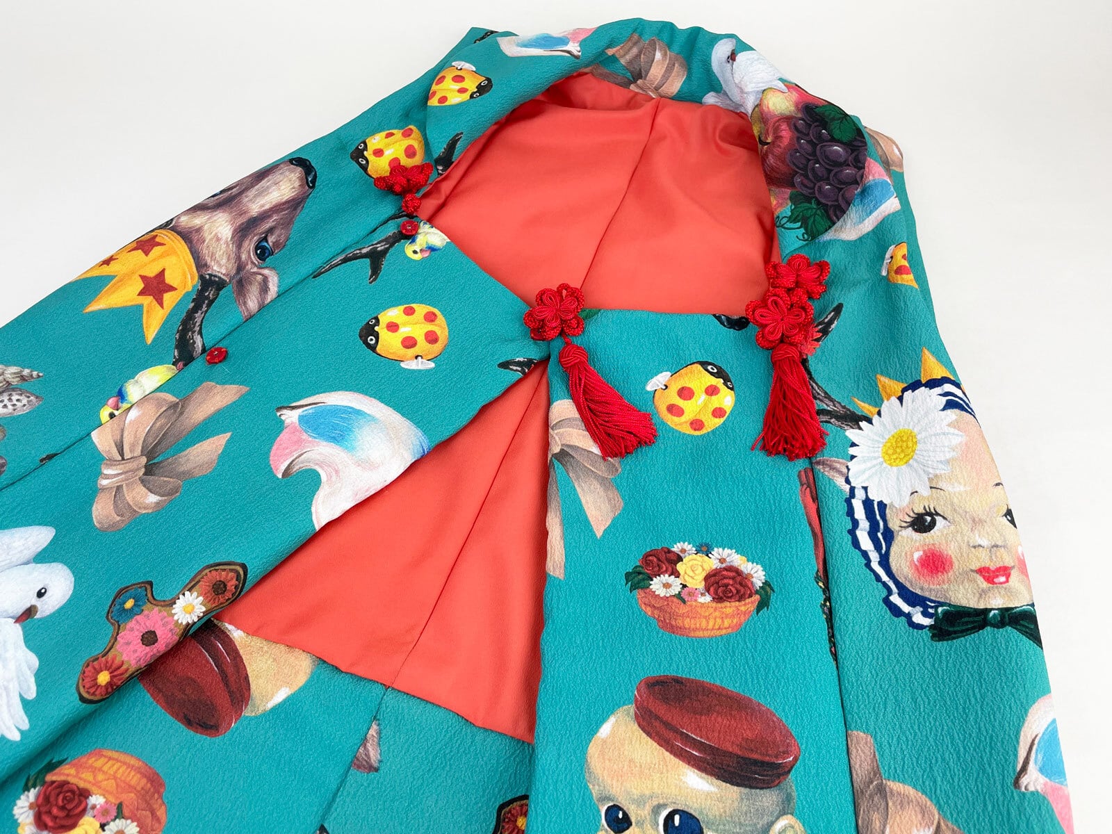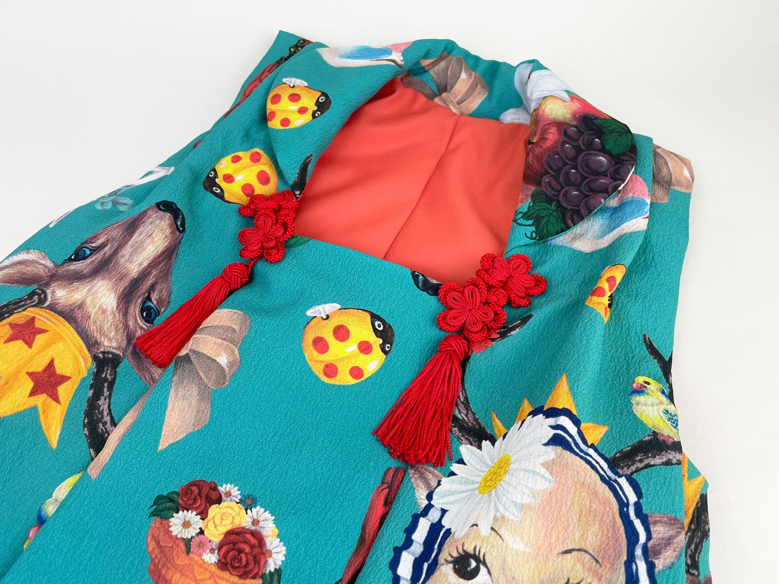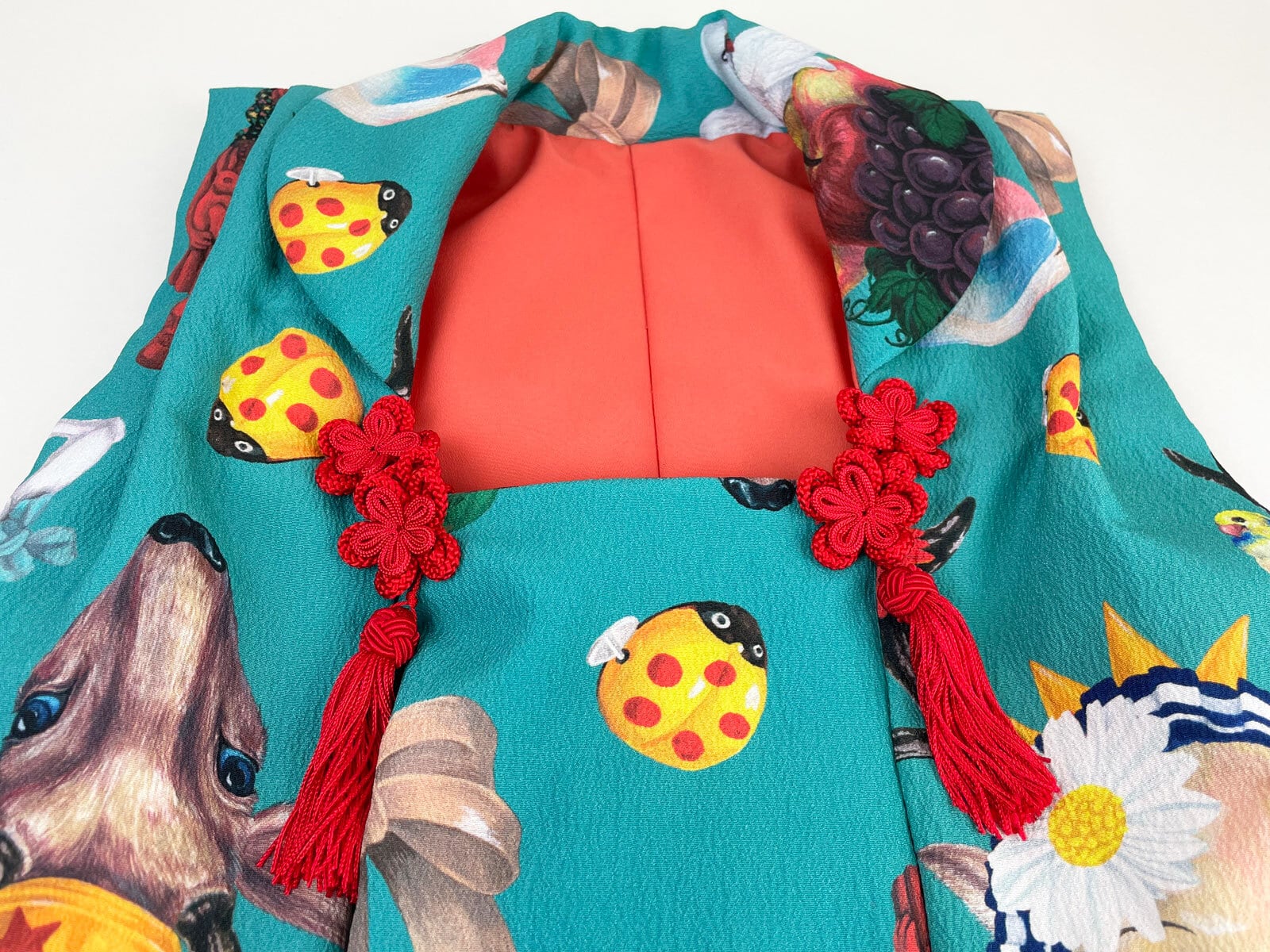 赤のチャイナ飾りボタン、裏にはサーモンピンクをあわせてとびっきりの可愛い一着に!