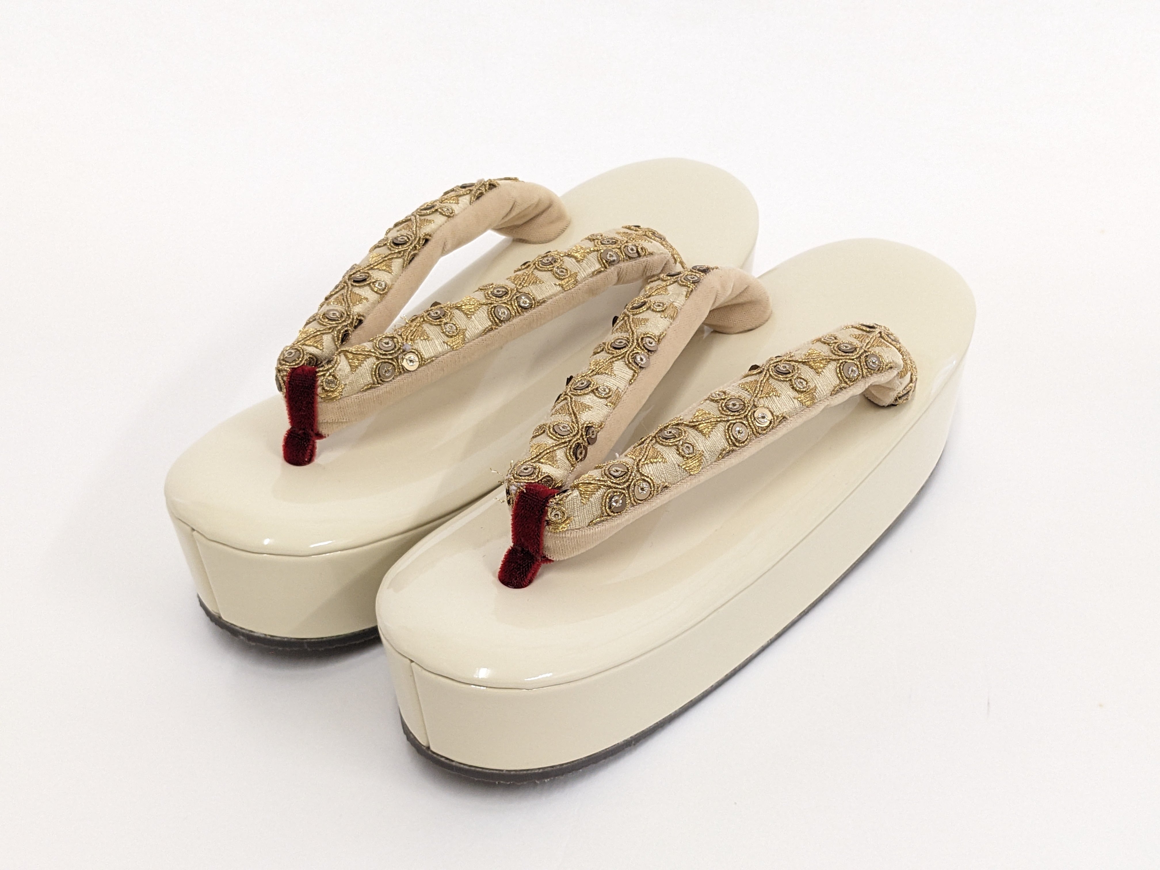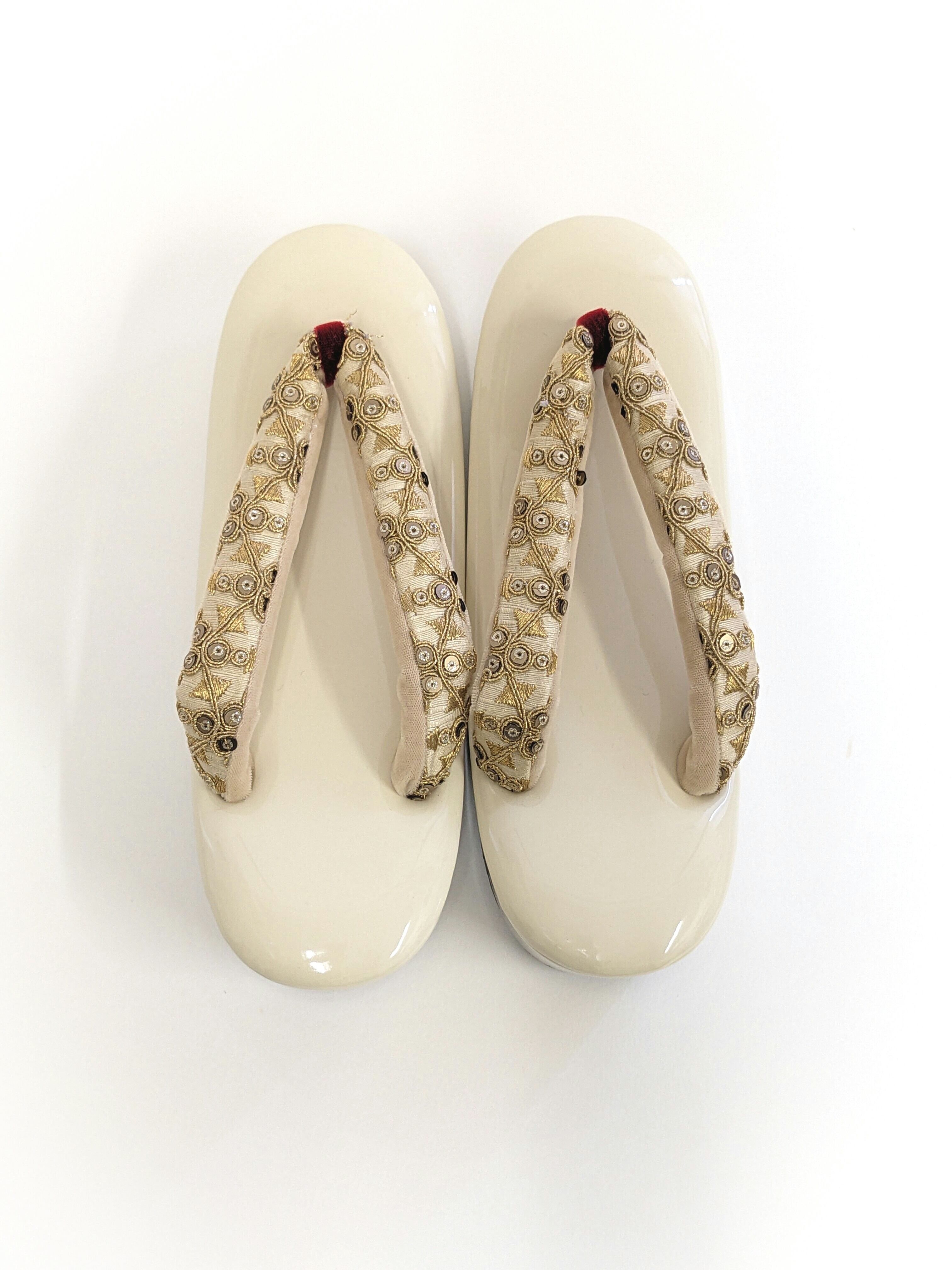 アイボリーのエナメル台とゴールドの鼻緒の組み合わせ。