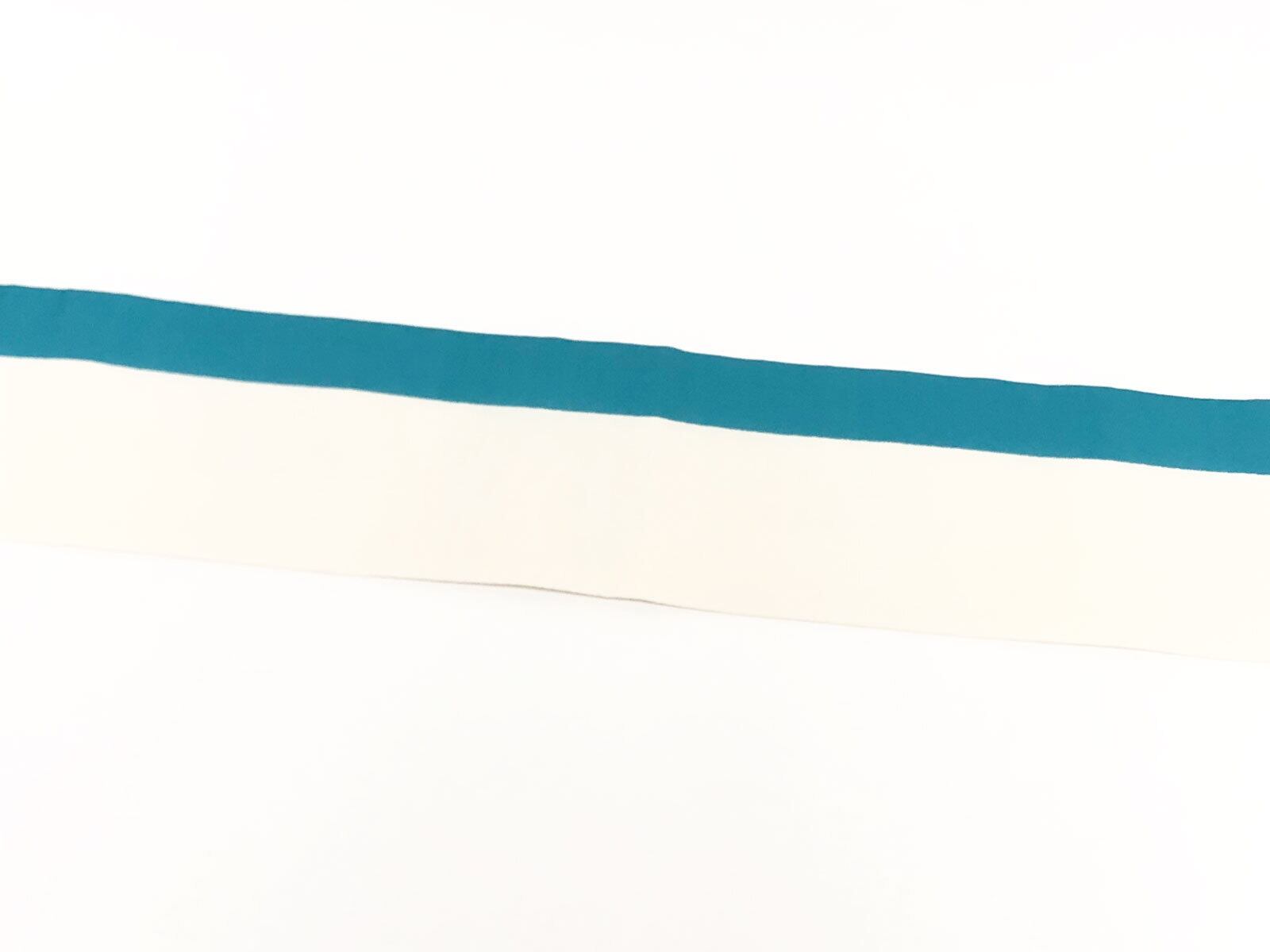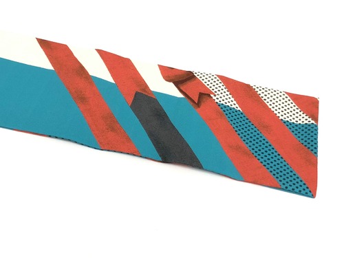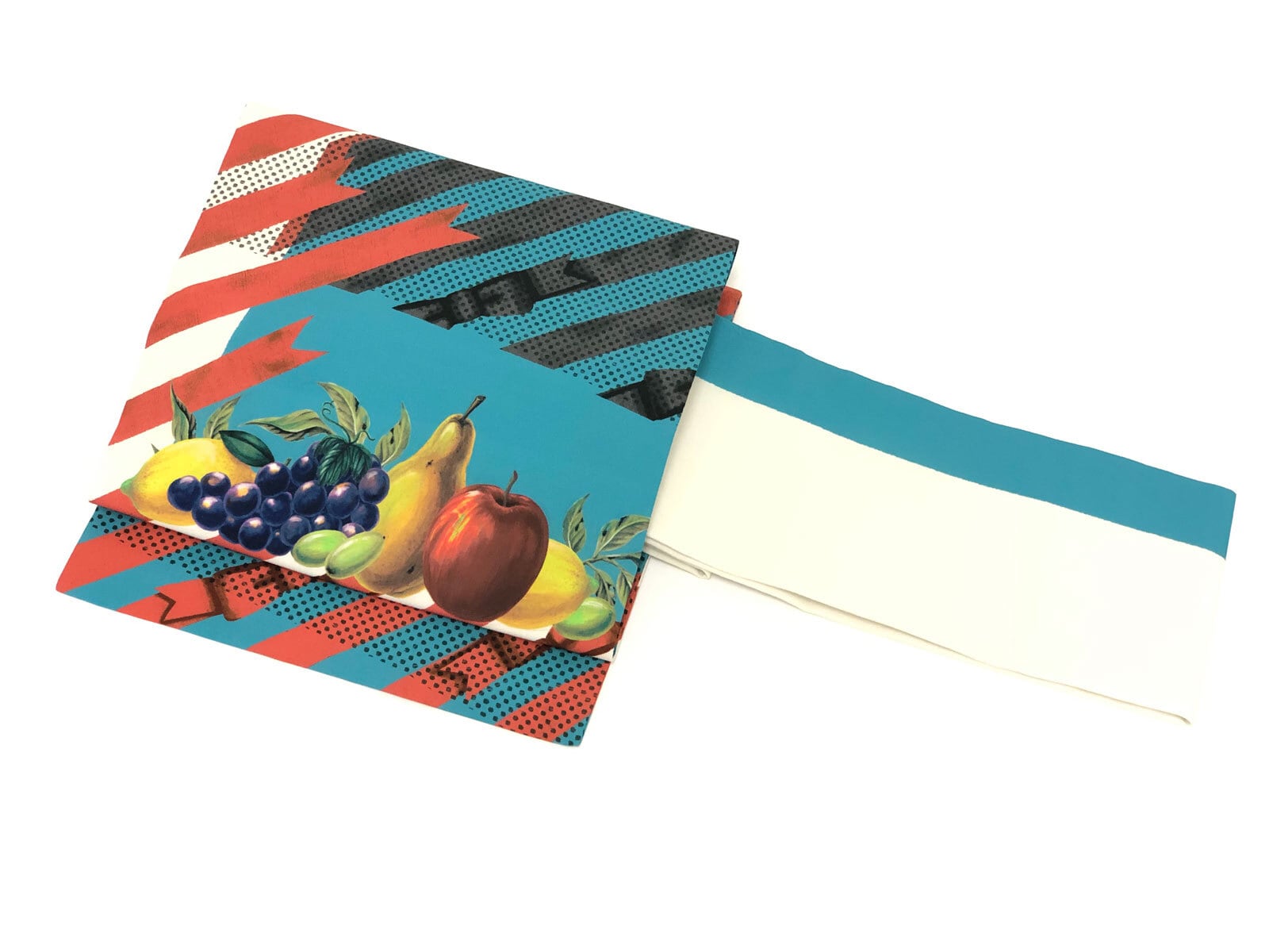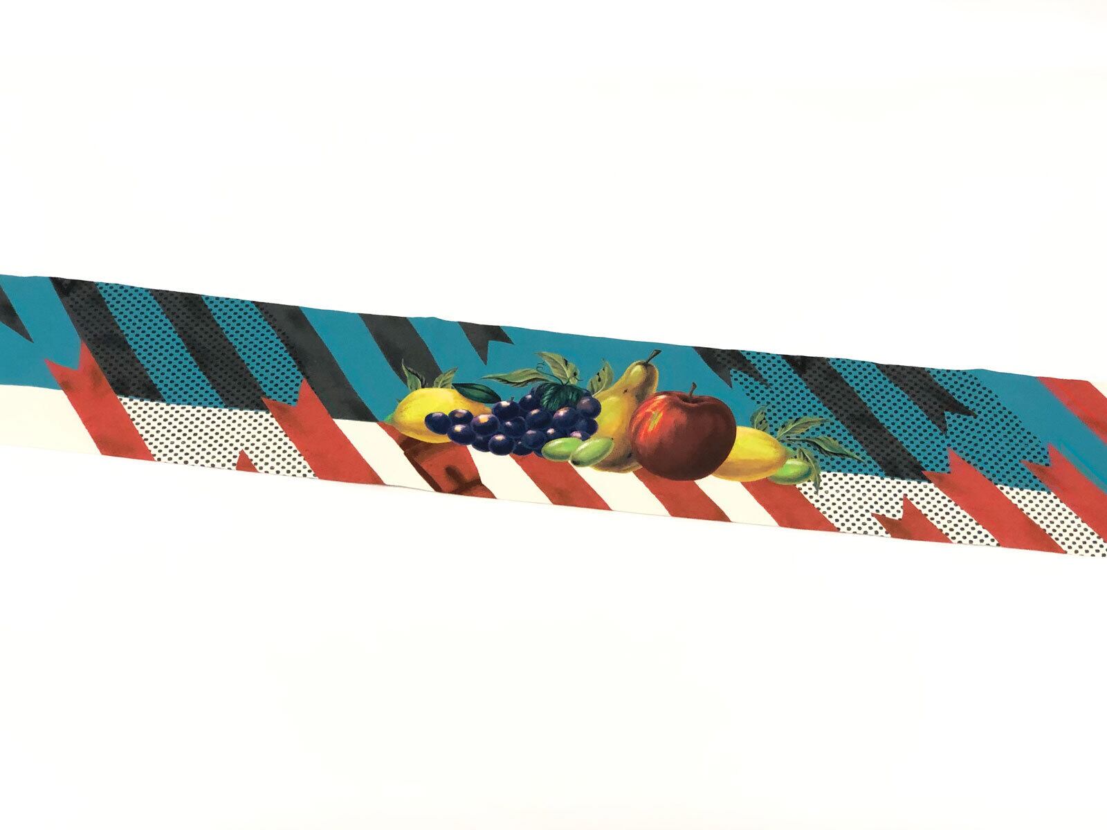 片面は果実とリボンとカラーブロッキング、片面はカラーブロッキングの上に深紅のリボンが全面に配置されています。