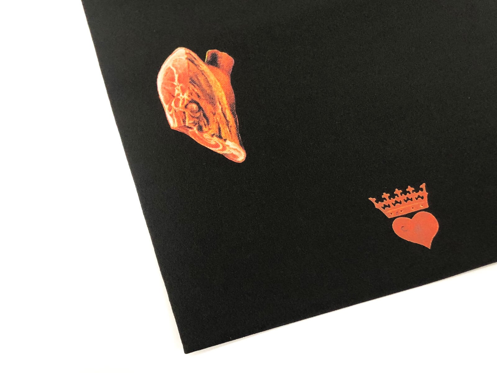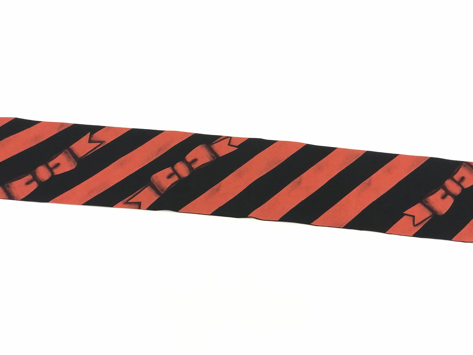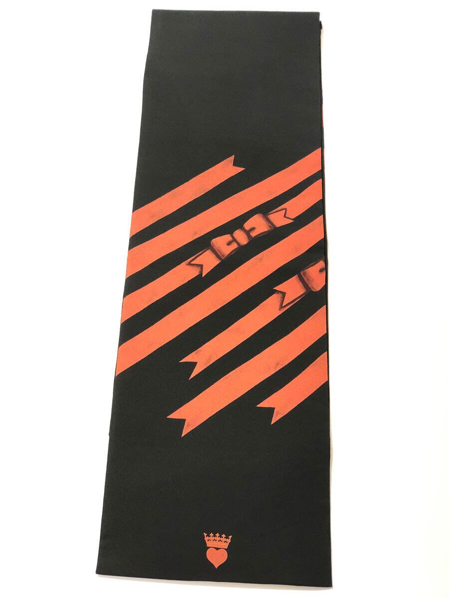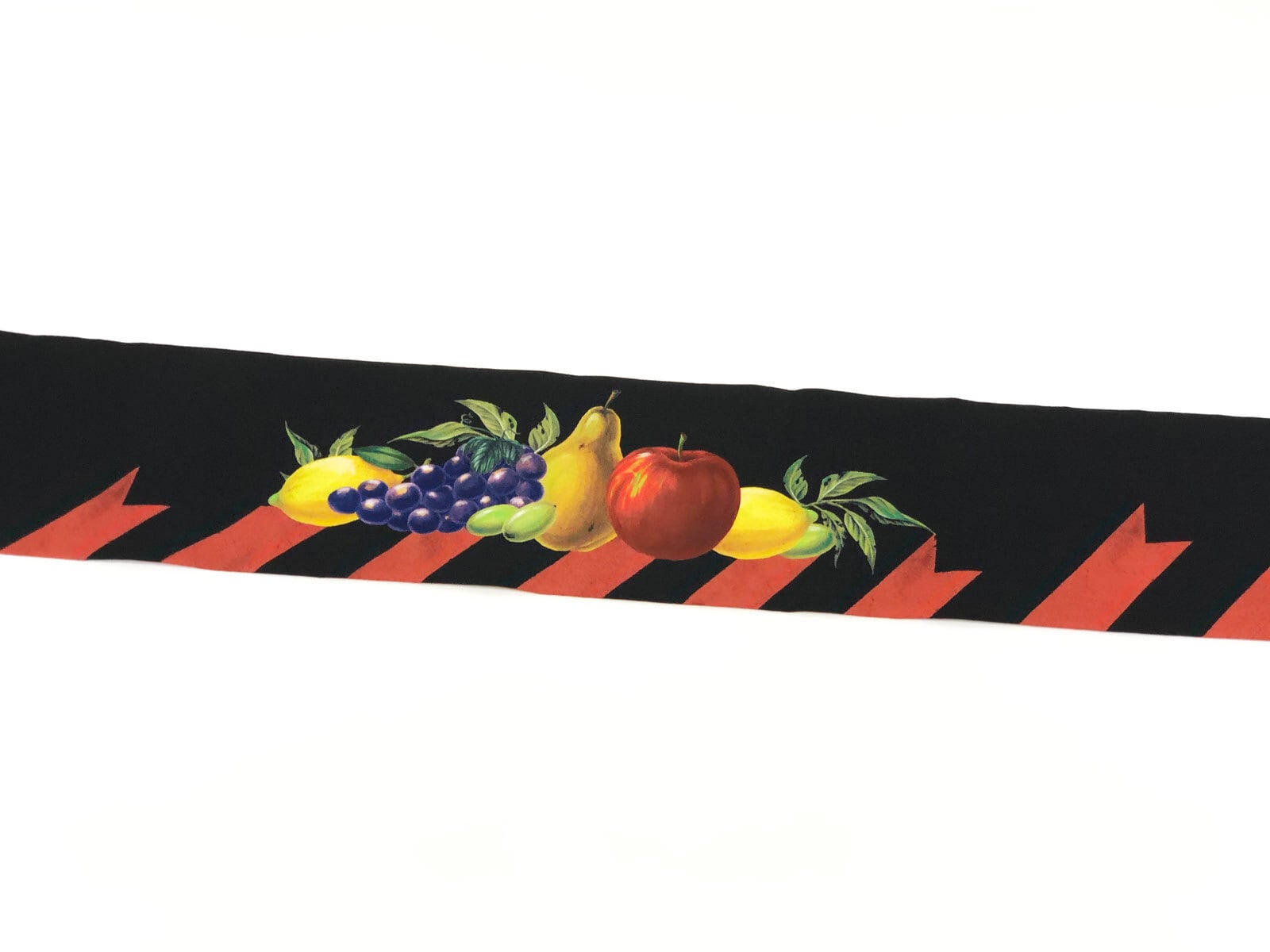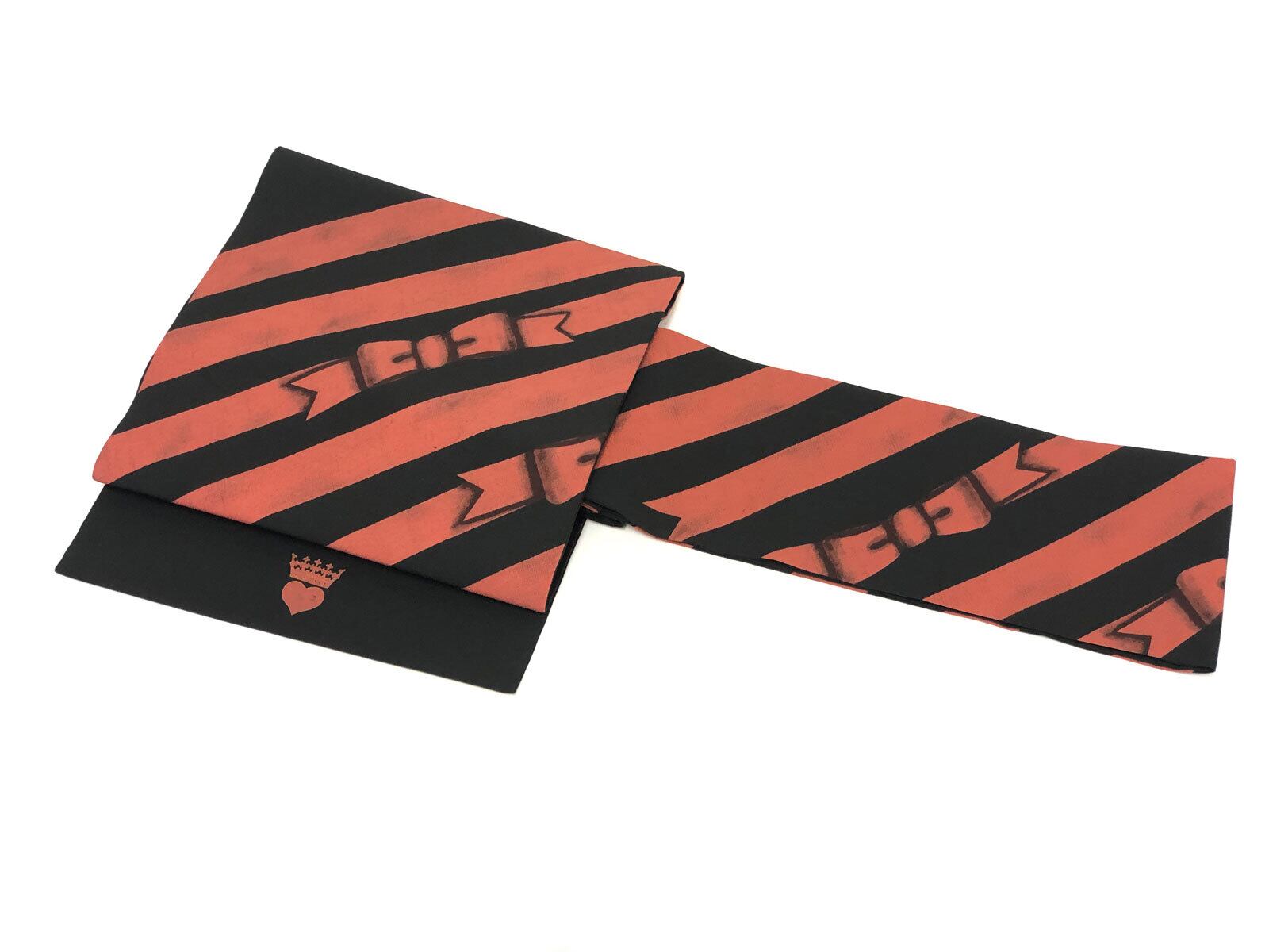片面は果実とリボン、片面は深紅のリボンが斜めストライプになるように全面に配置されています。
