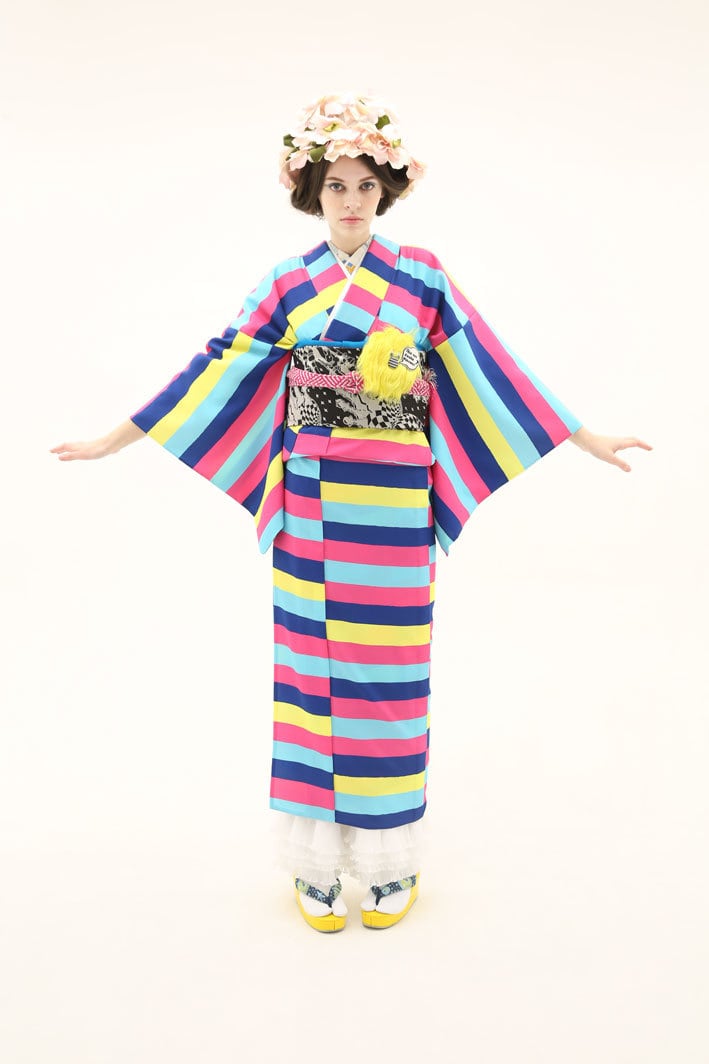 ポップでカラフルな1960年代のファッション・色使いをデザインソースに制作した着物です。