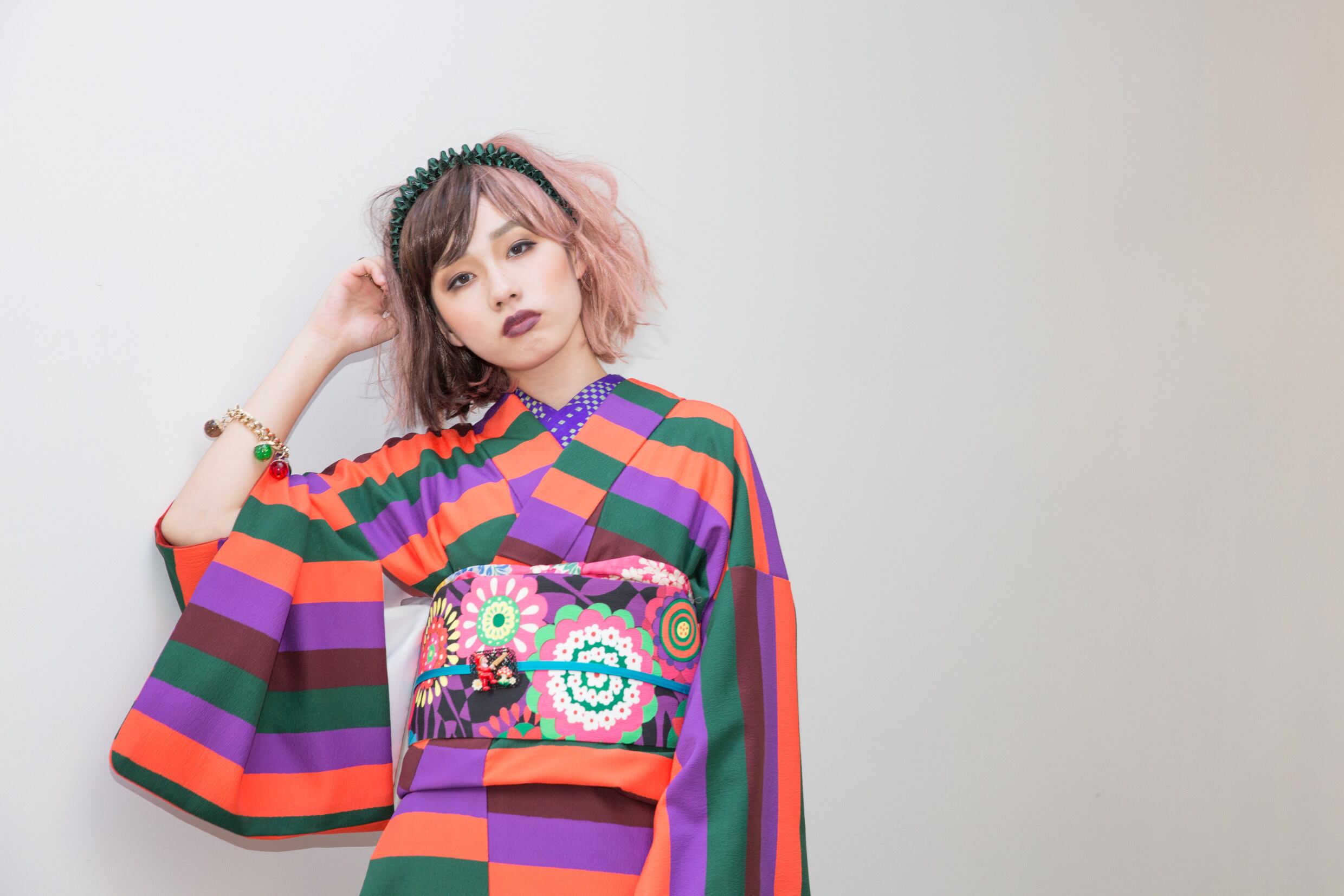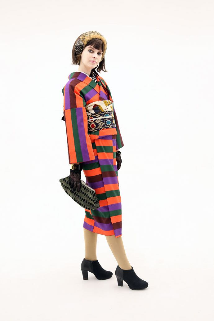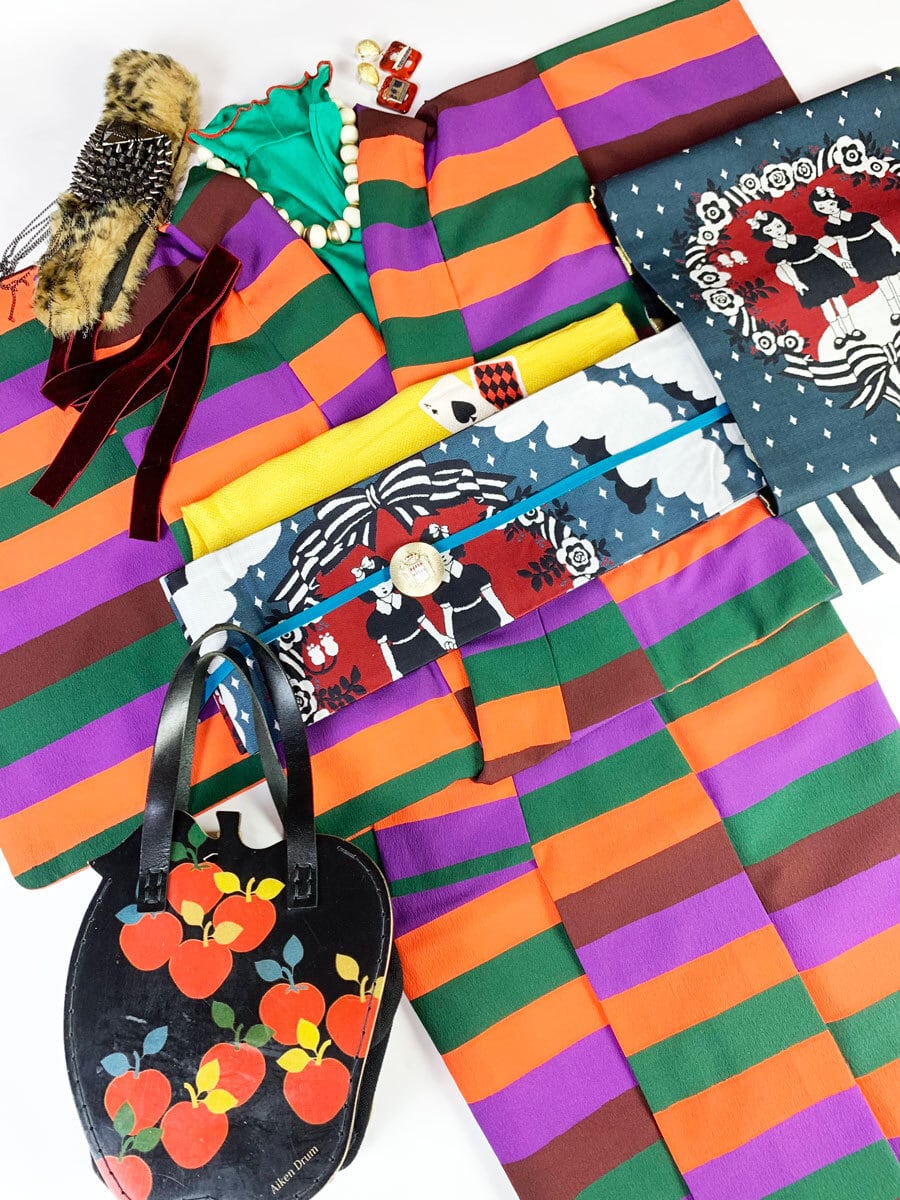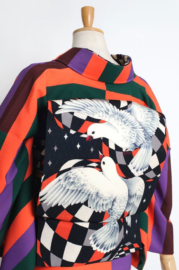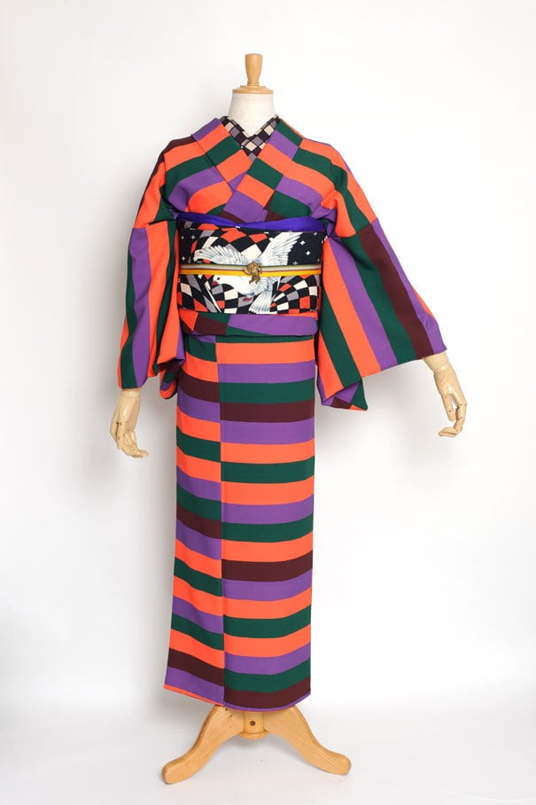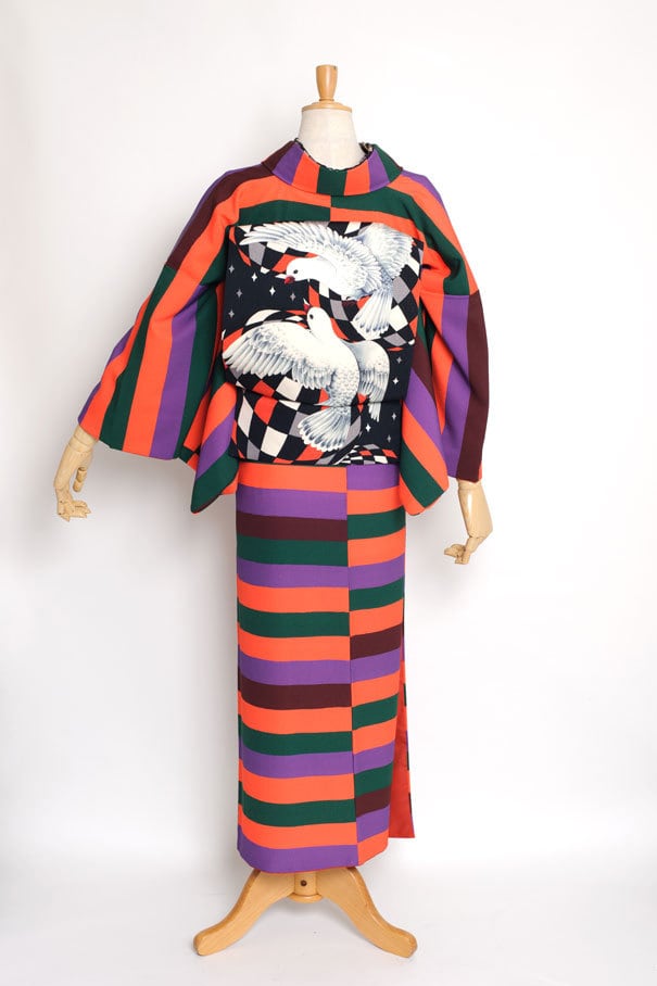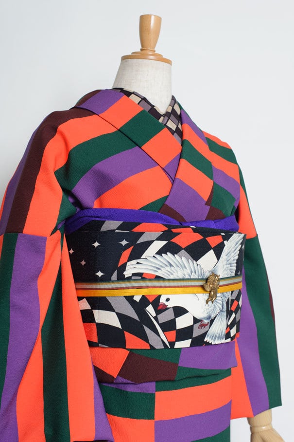 ポップでカラフルな1960年代のファッション・色使いをデザインソースに制作した着物です。