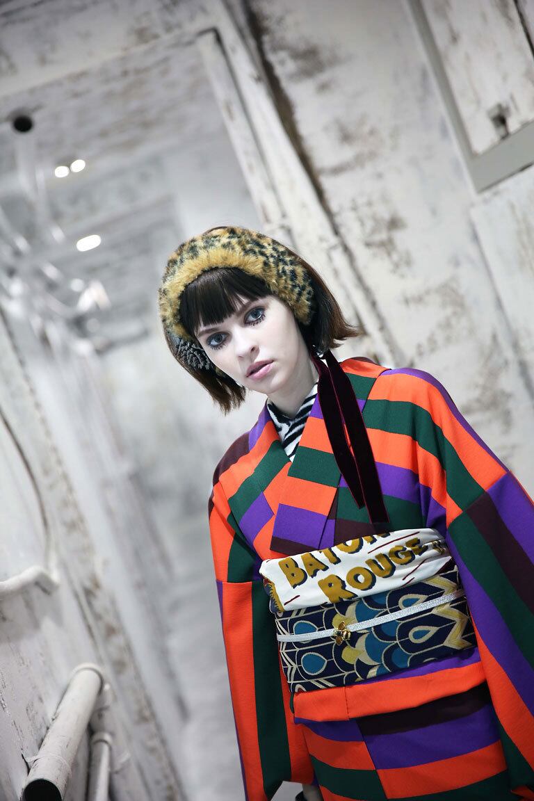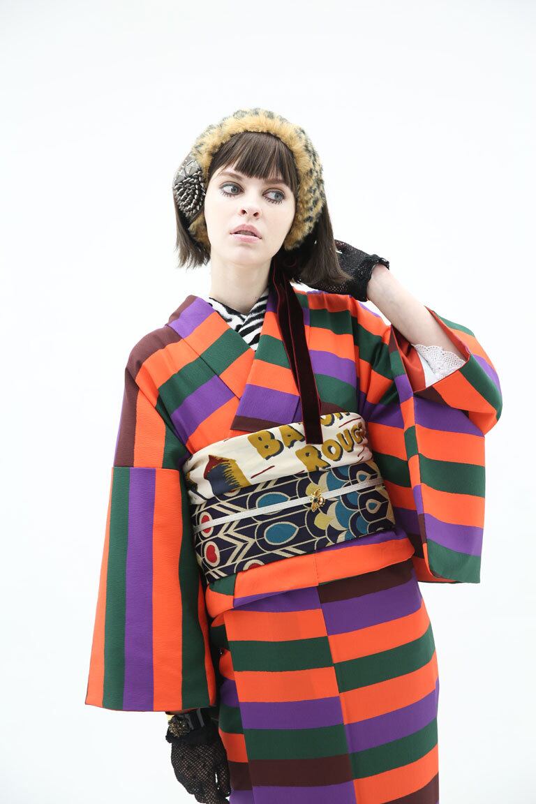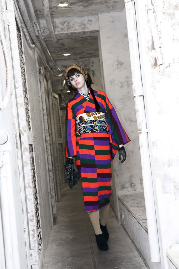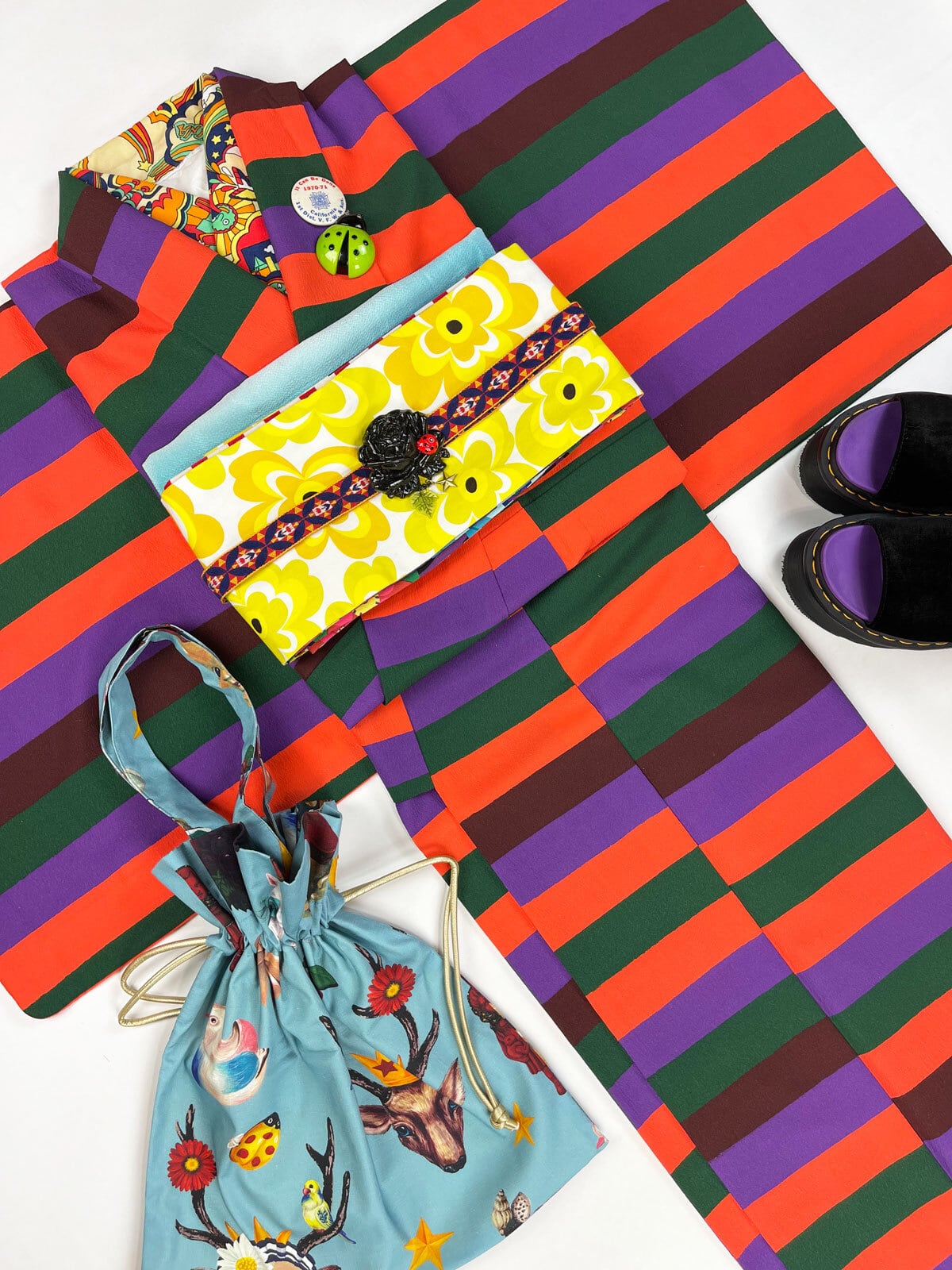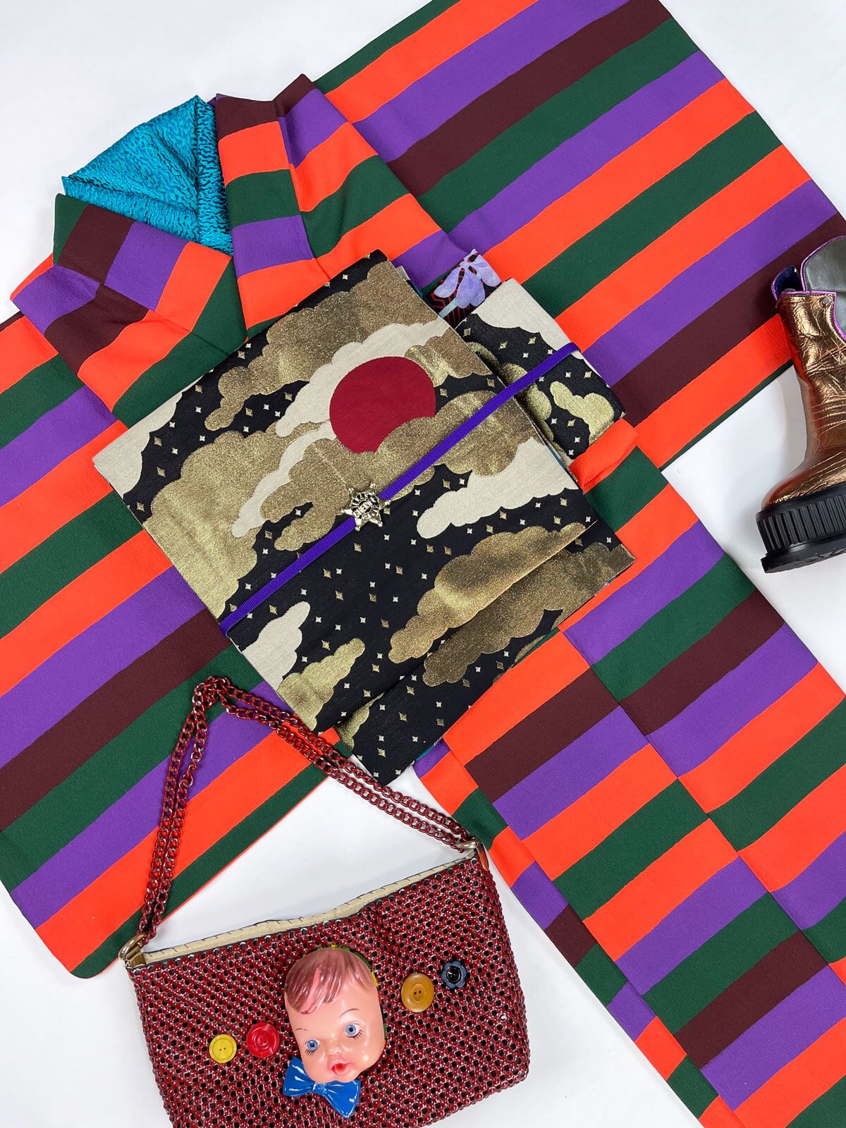 ポップでカラフルな1960年代のファッション・色使いをデザインソースに制作した着物です。