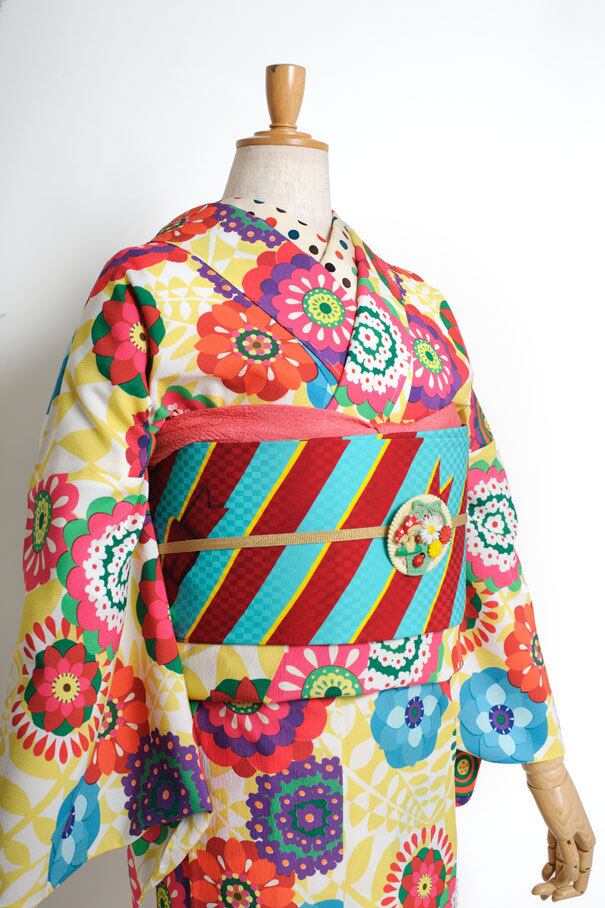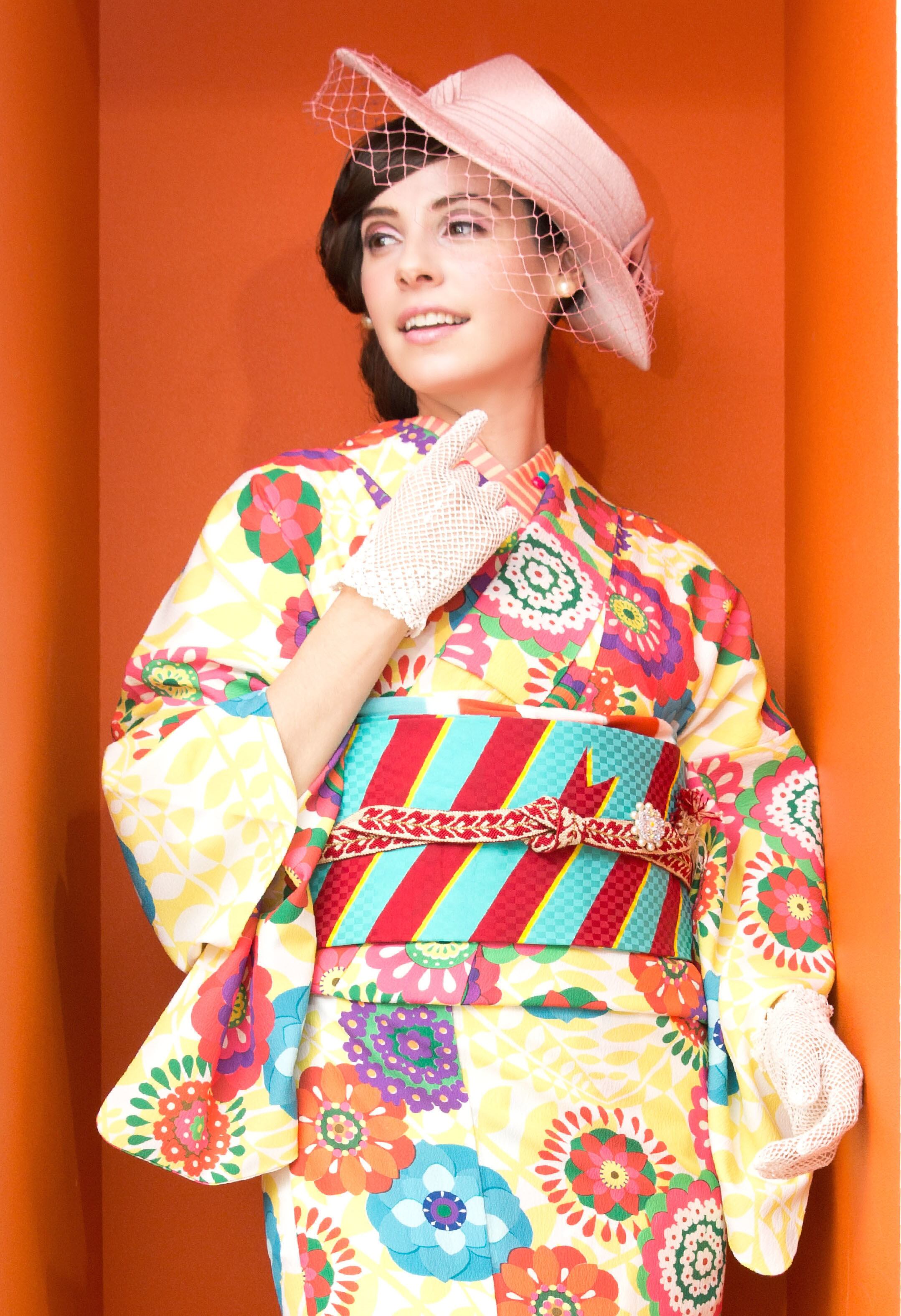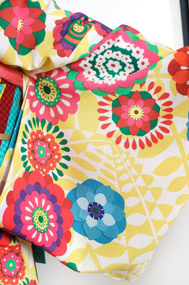 洋服の生地から仕立てたような、でも洋服地のテキスタイルをそのまま着物に仕立てるのではなく、着物のデザインとして落としこみました。