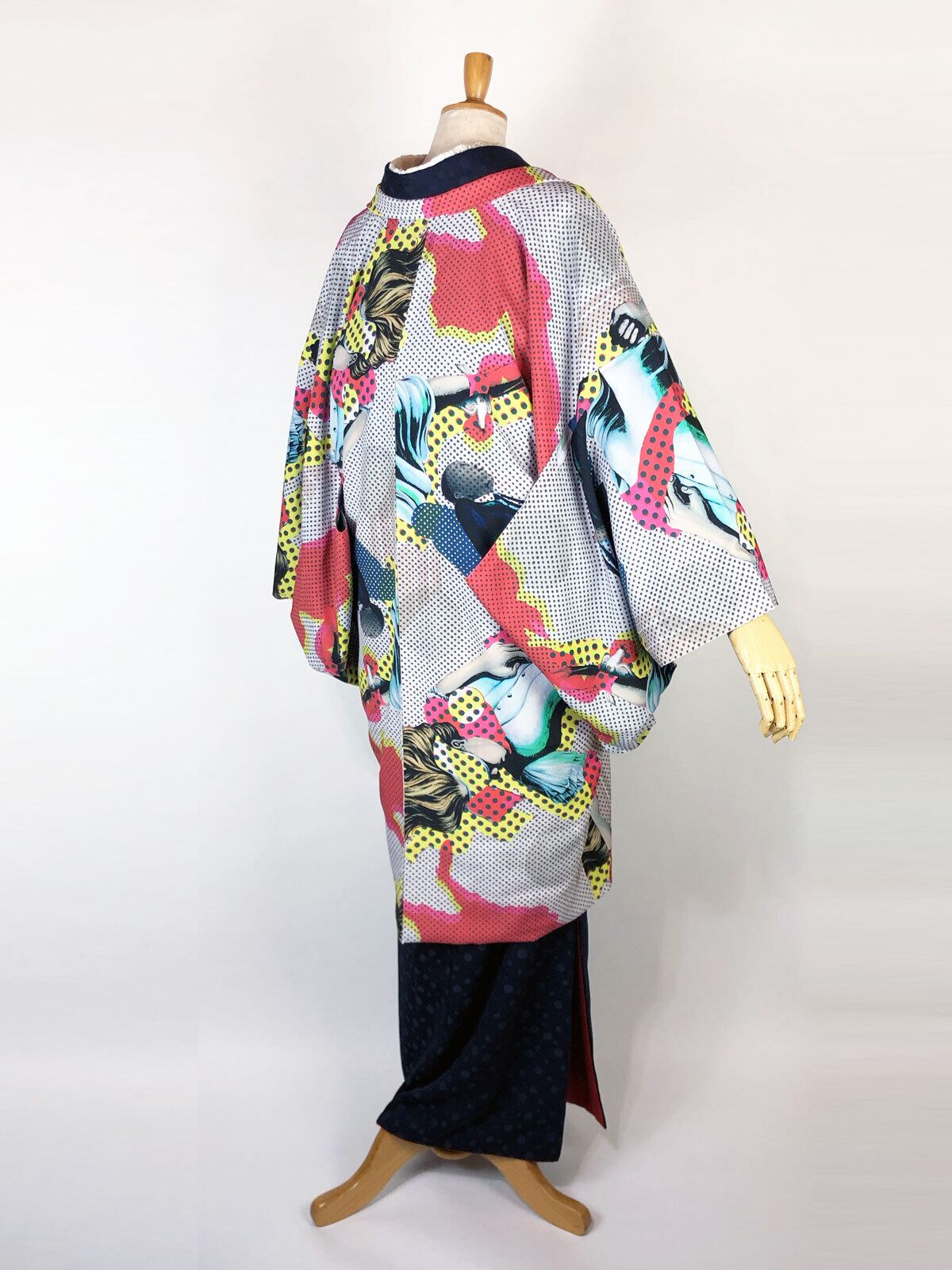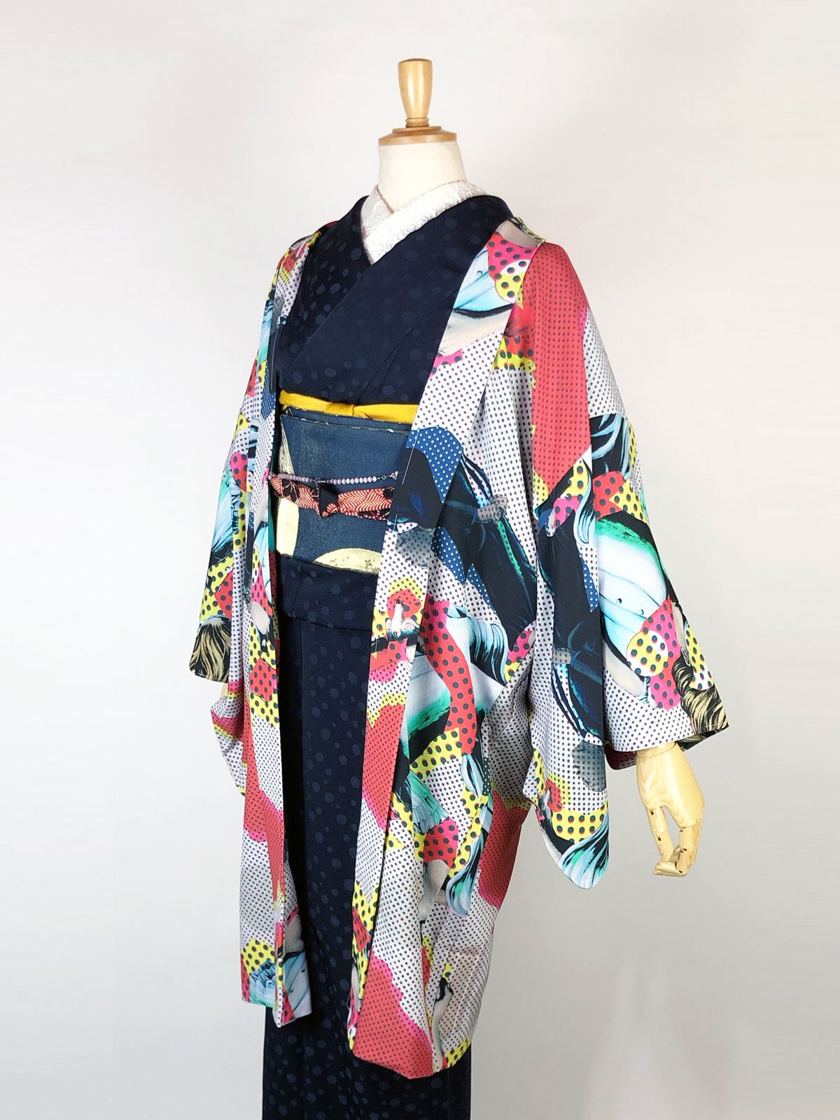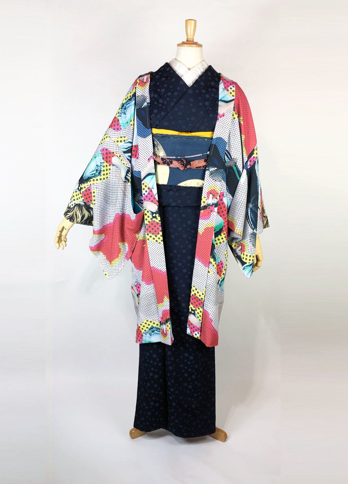 重宗玉緒がニューヨーク・メキシコを旅して見たものから着想してデザインした「Murder Case」柄の羽織です。