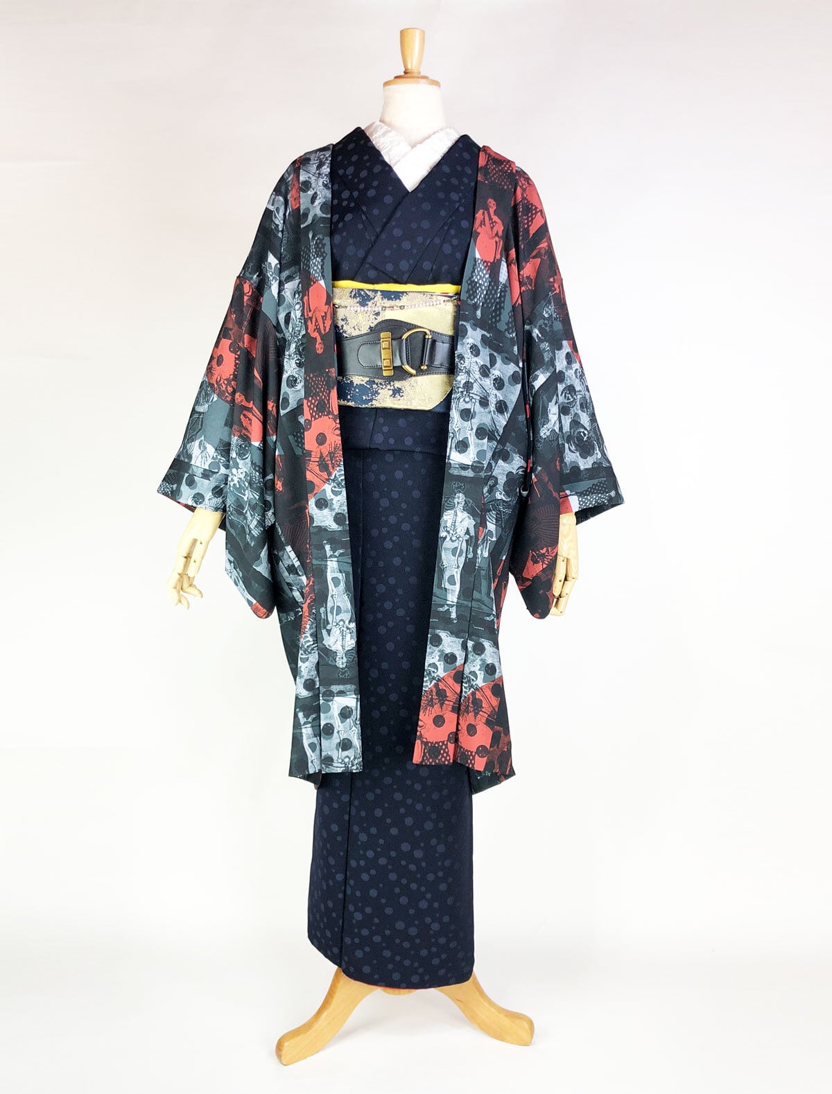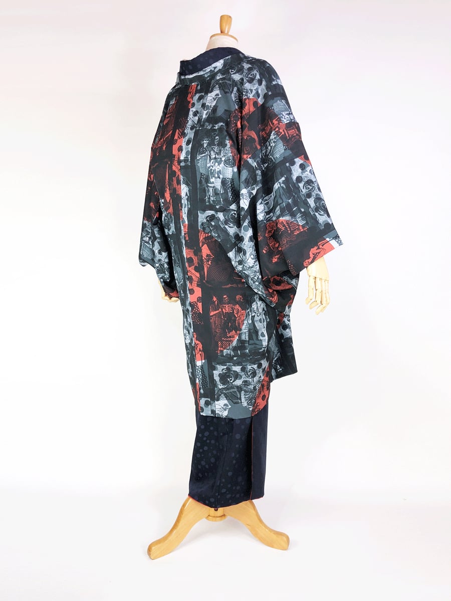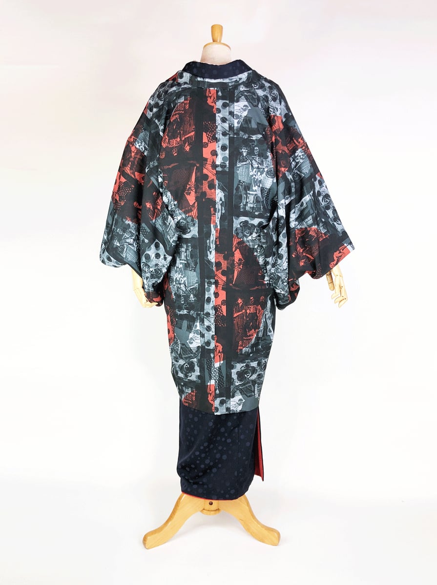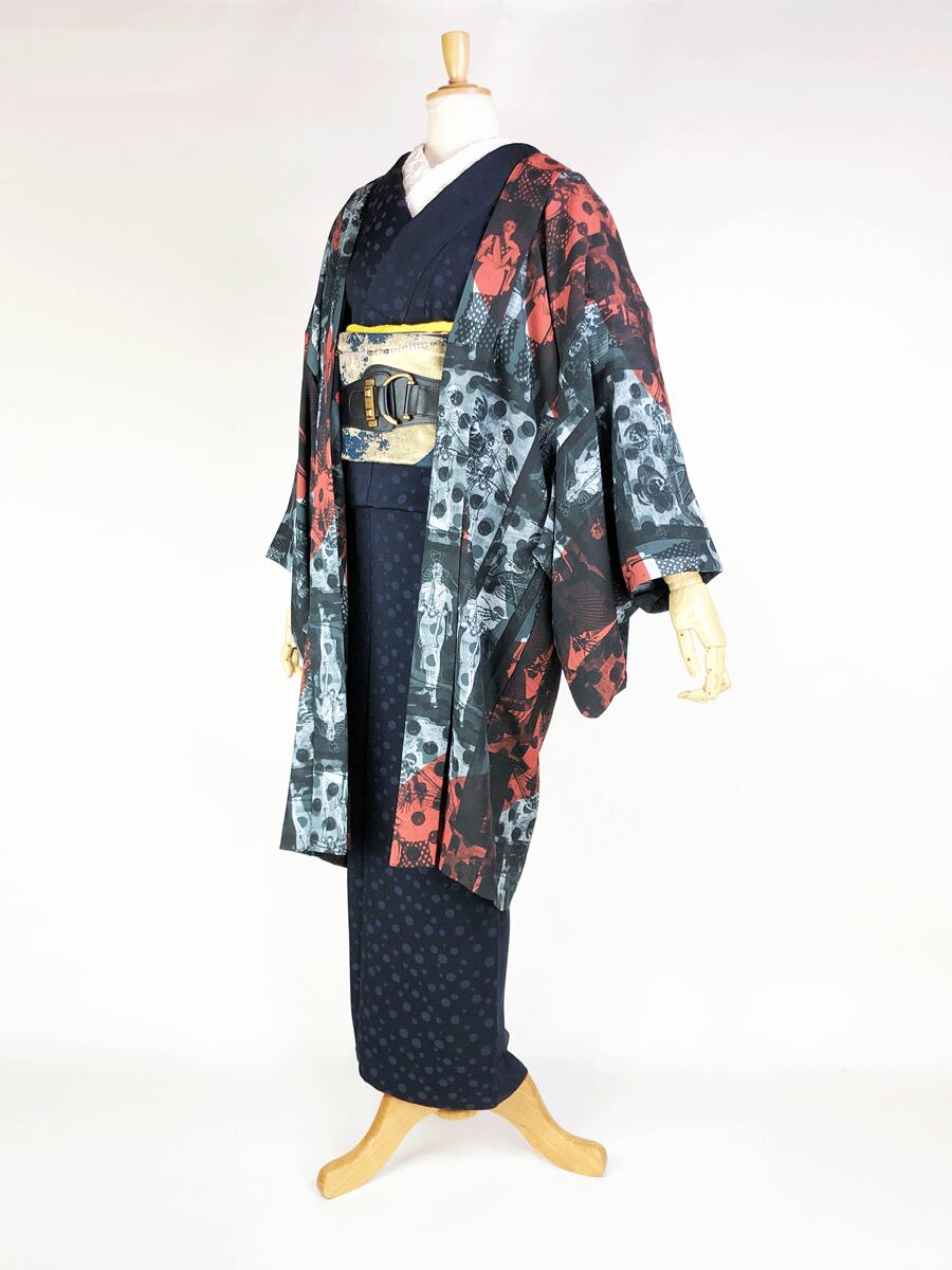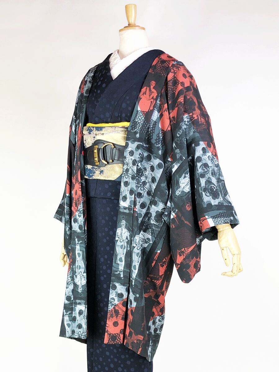 カラフルな絵画を素材に使い、一転してシックなメッセージ性のある羽織に。