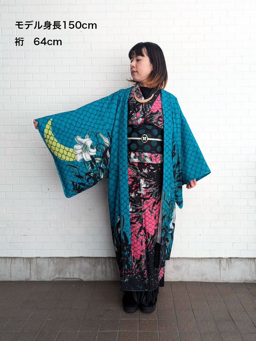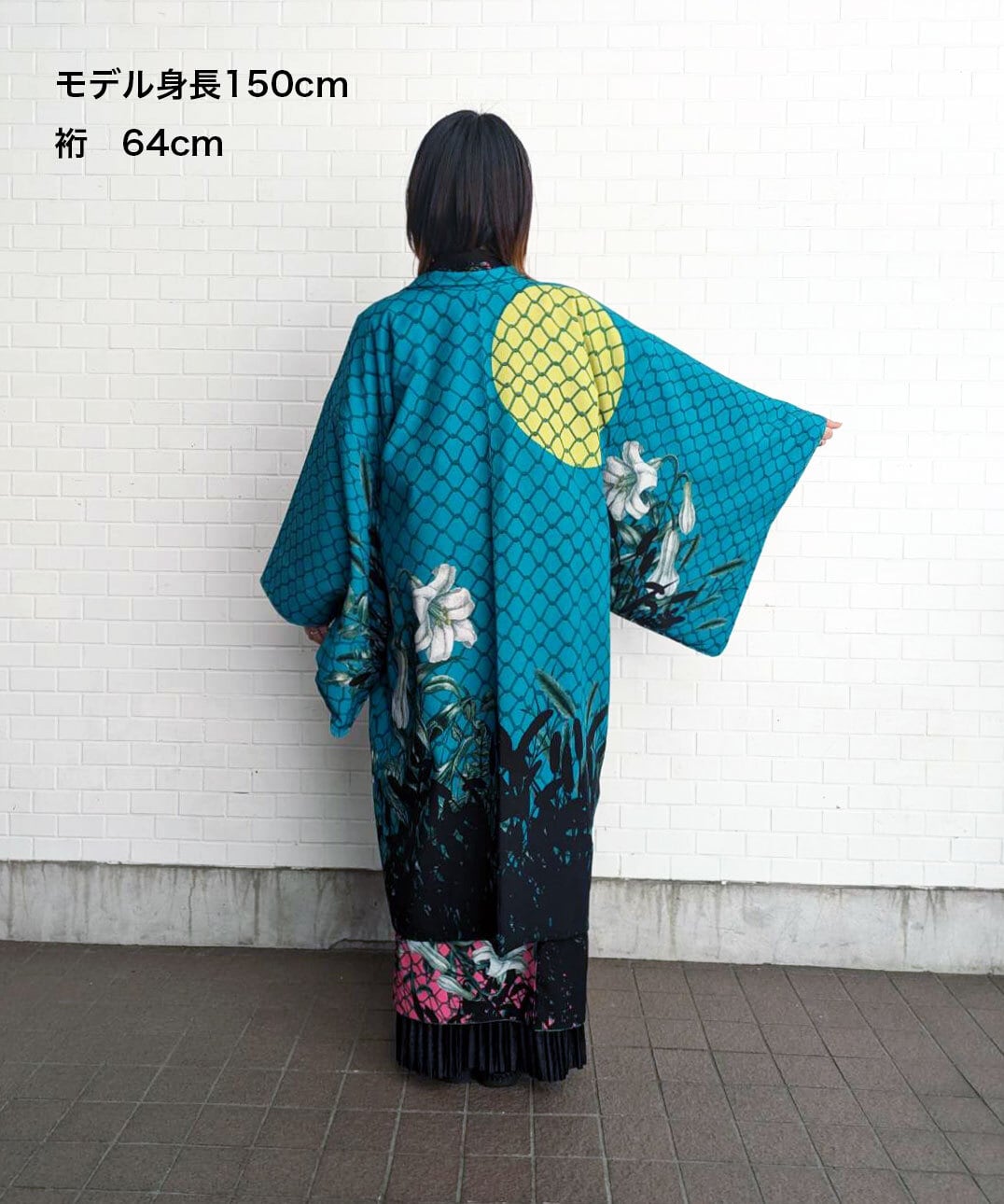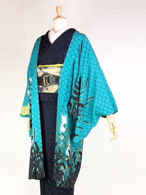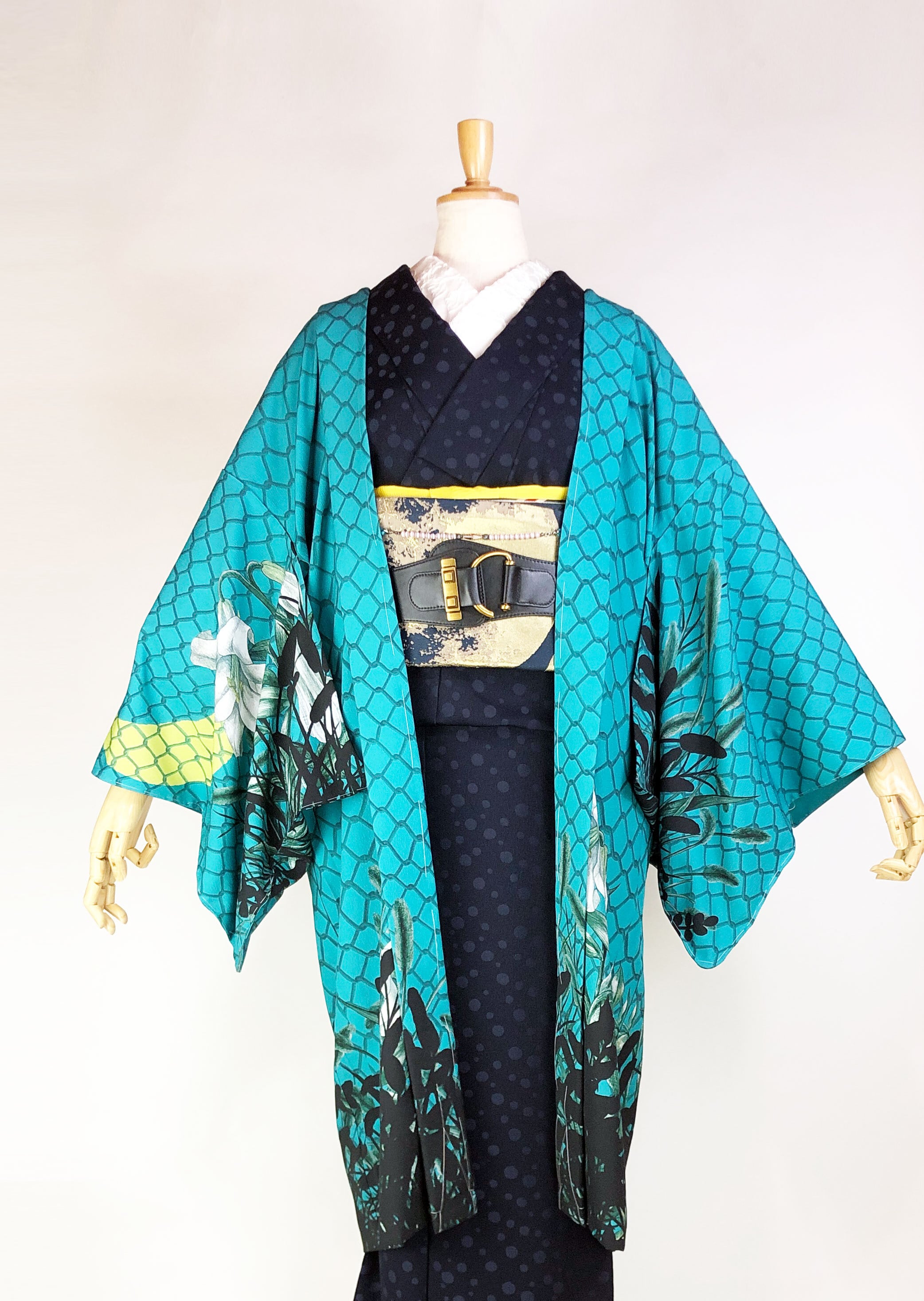 【M寸即納品あり】ポリエステル単衣絵羽織 「境界線」ターコイズ